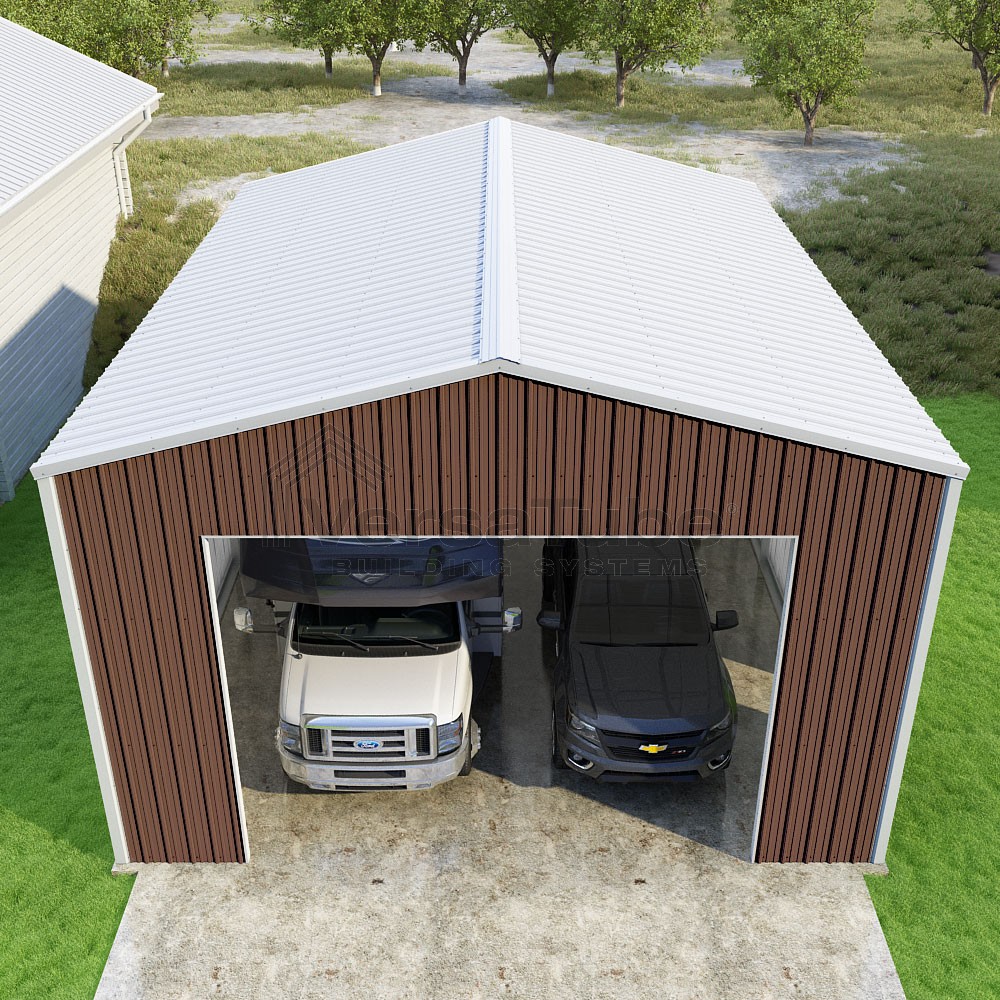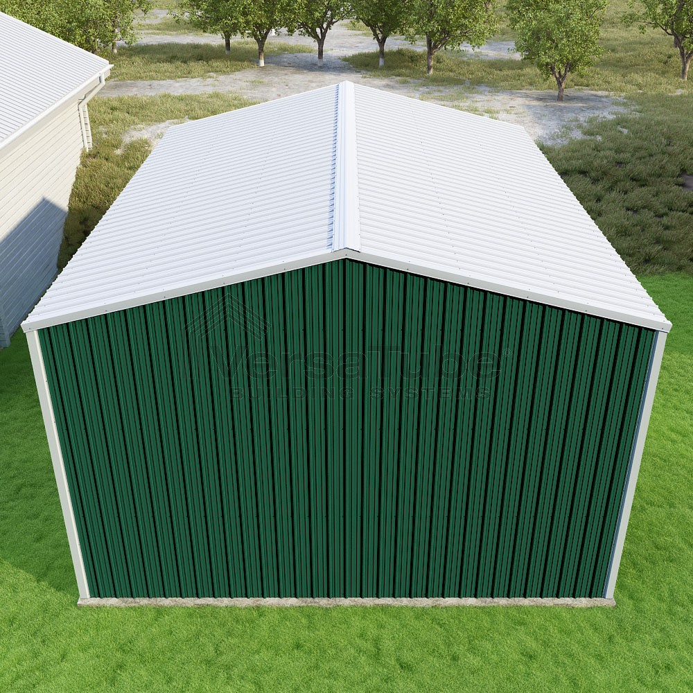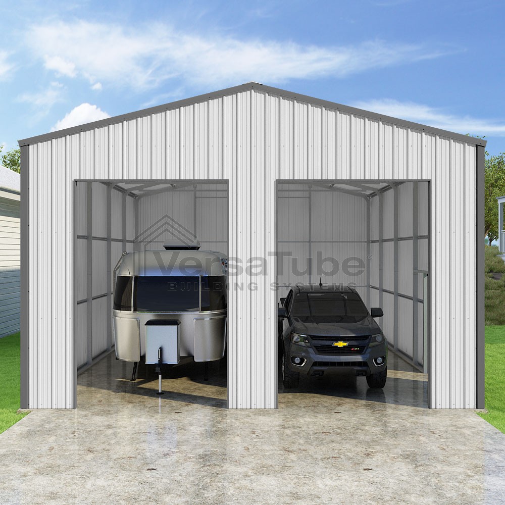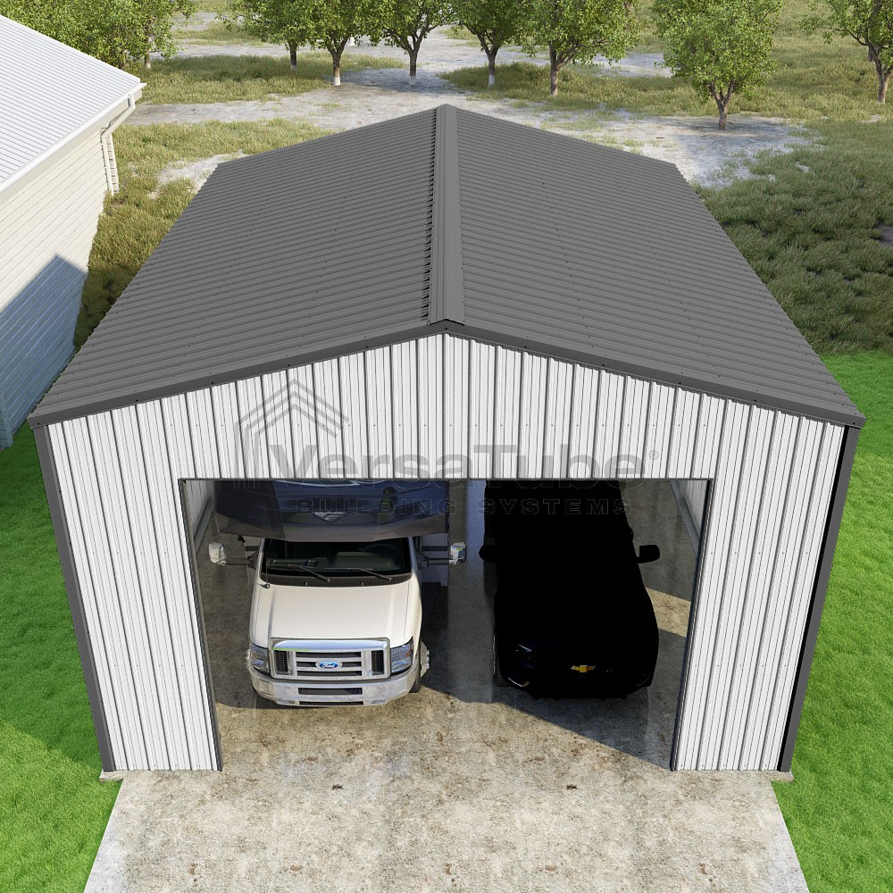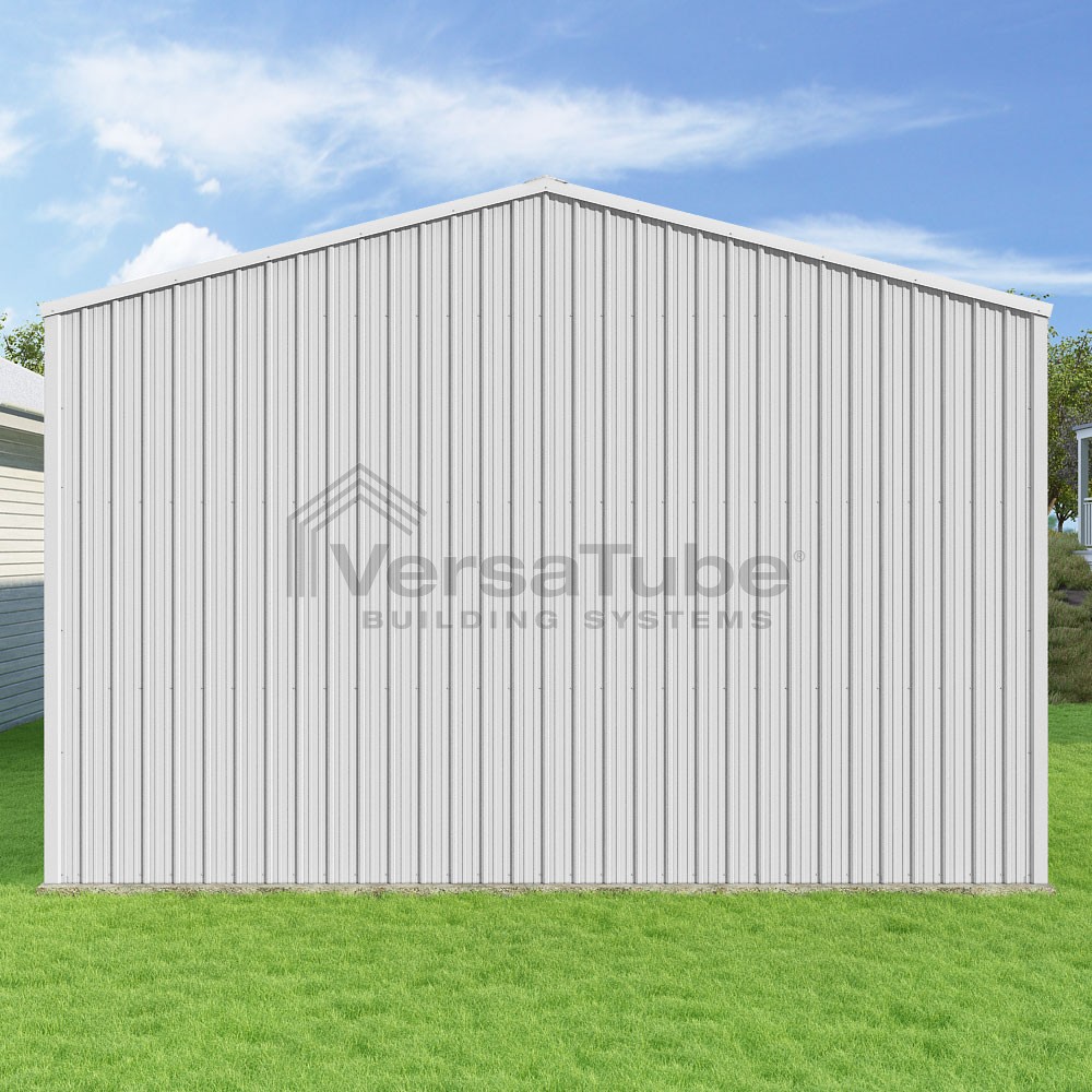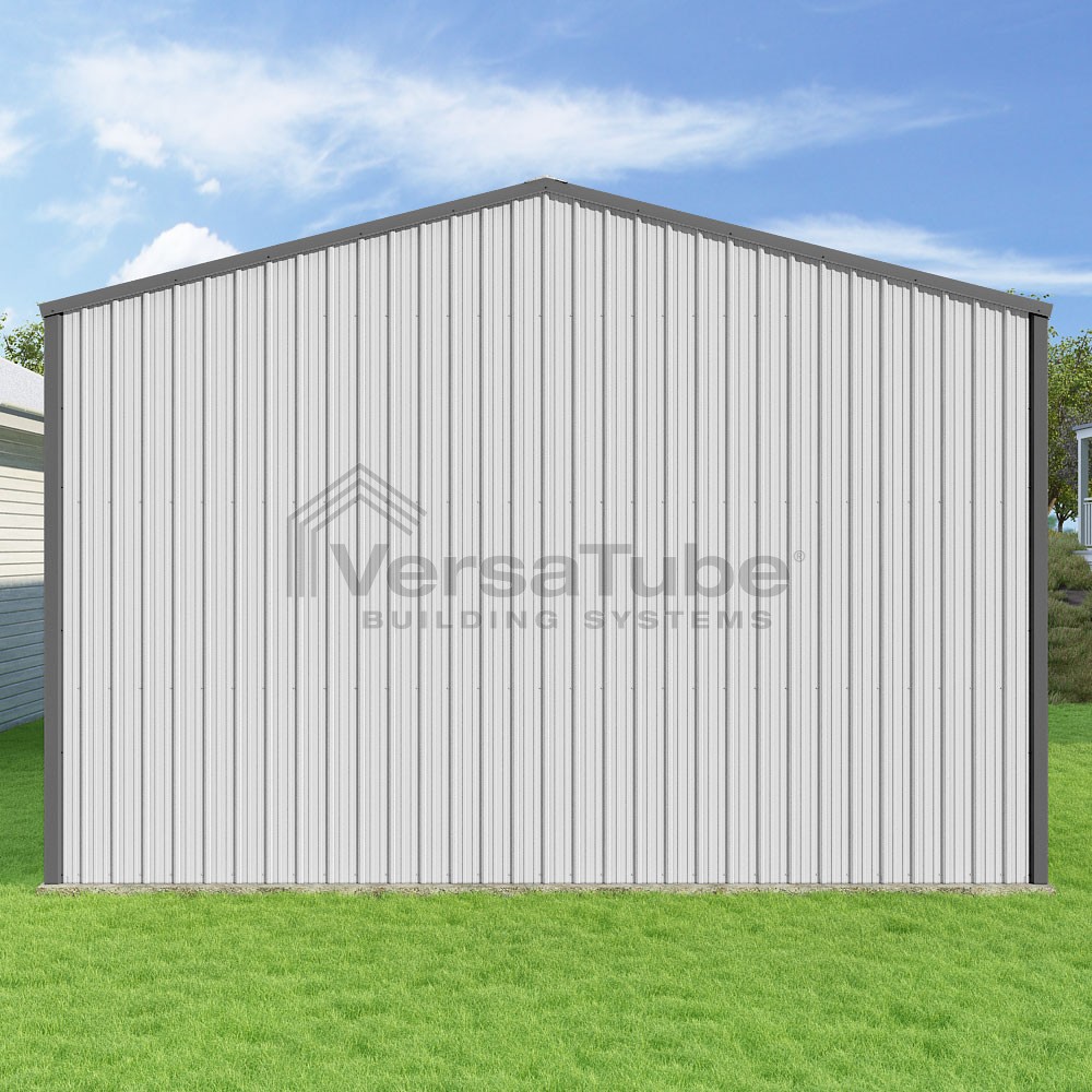 Summit Series DIY garage kit features vertical sheet metal roof and siding panels for a consistent look.
