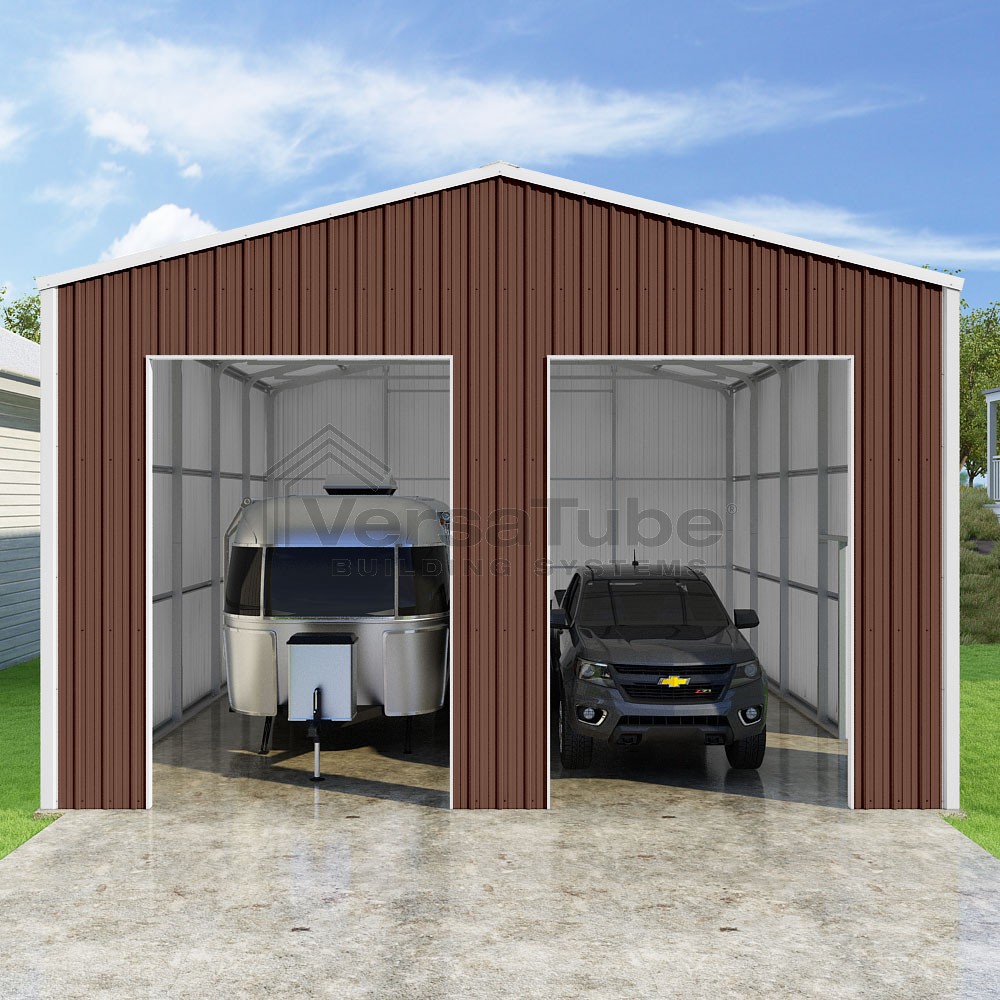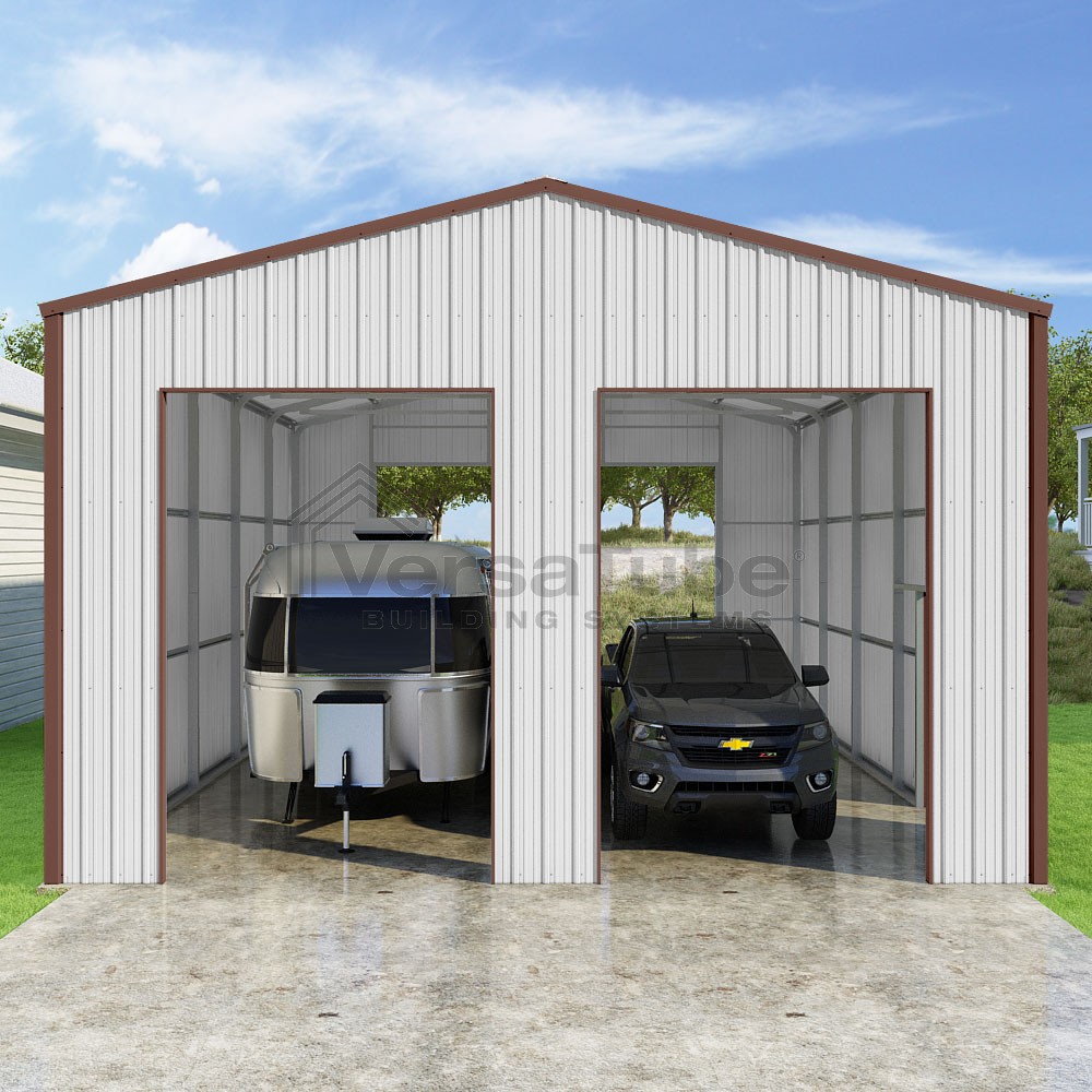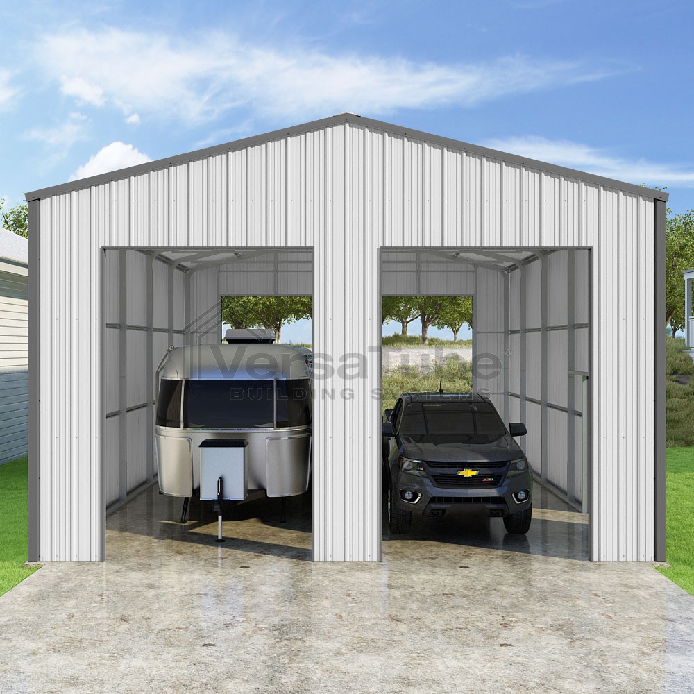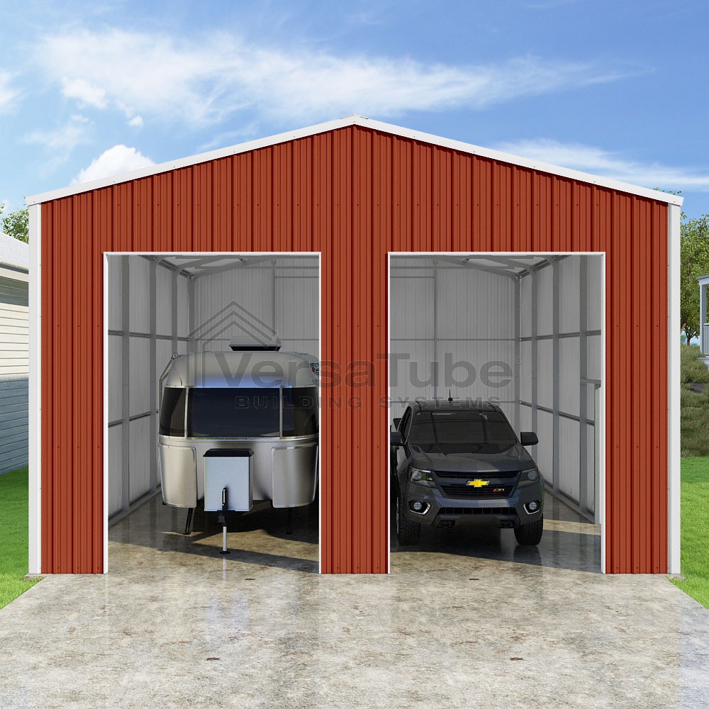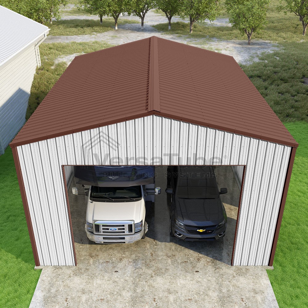 Summit Series DIY garage kit features vertical sheet metal roof and siding panels for a consistent look.