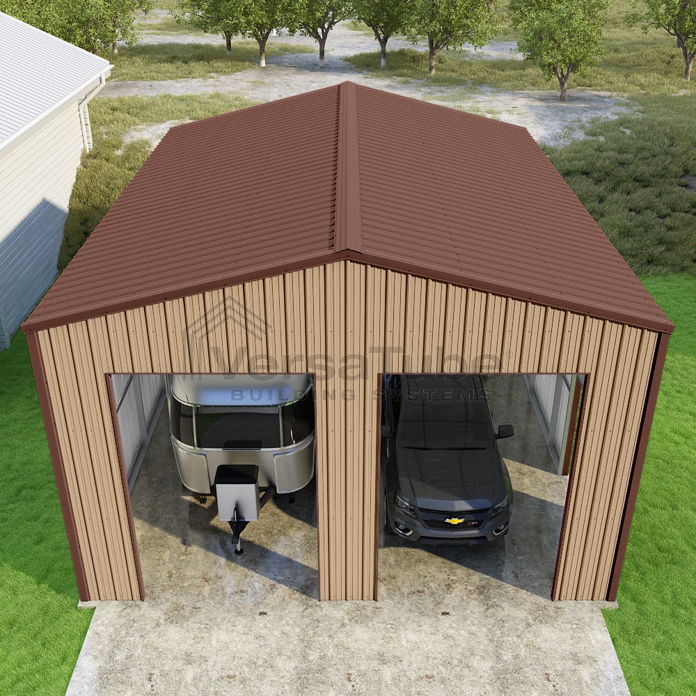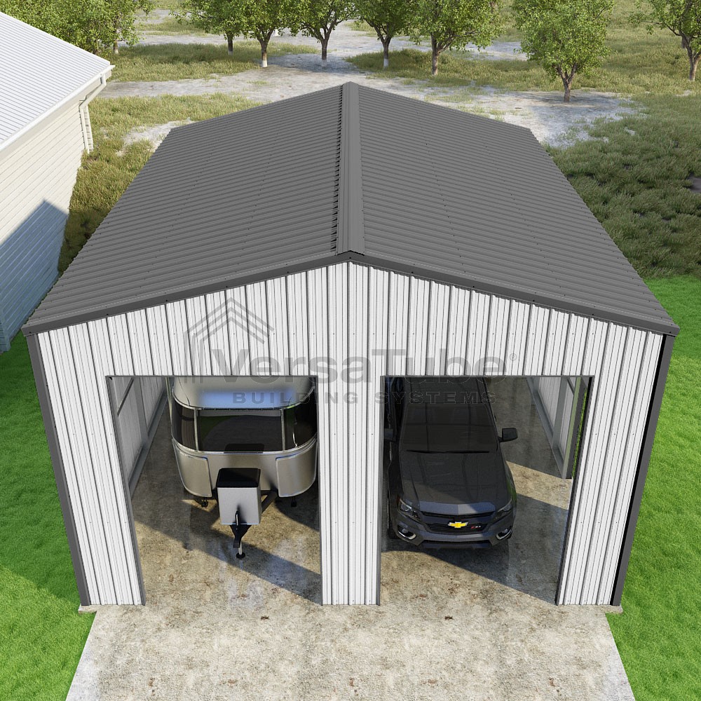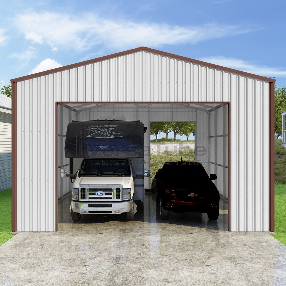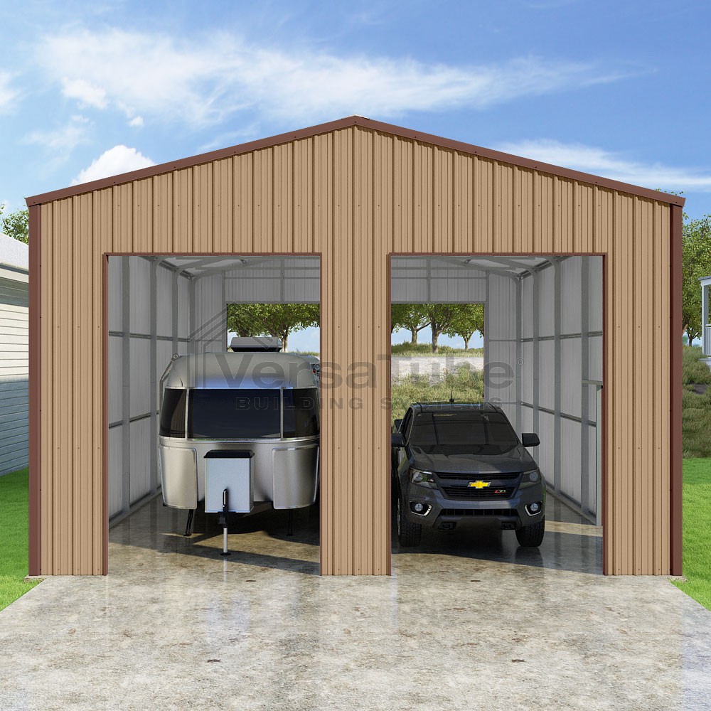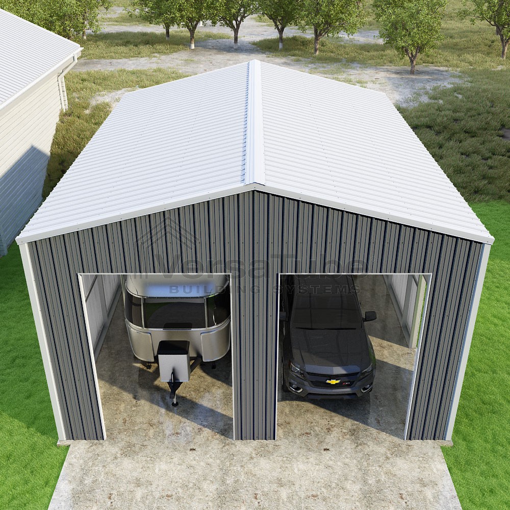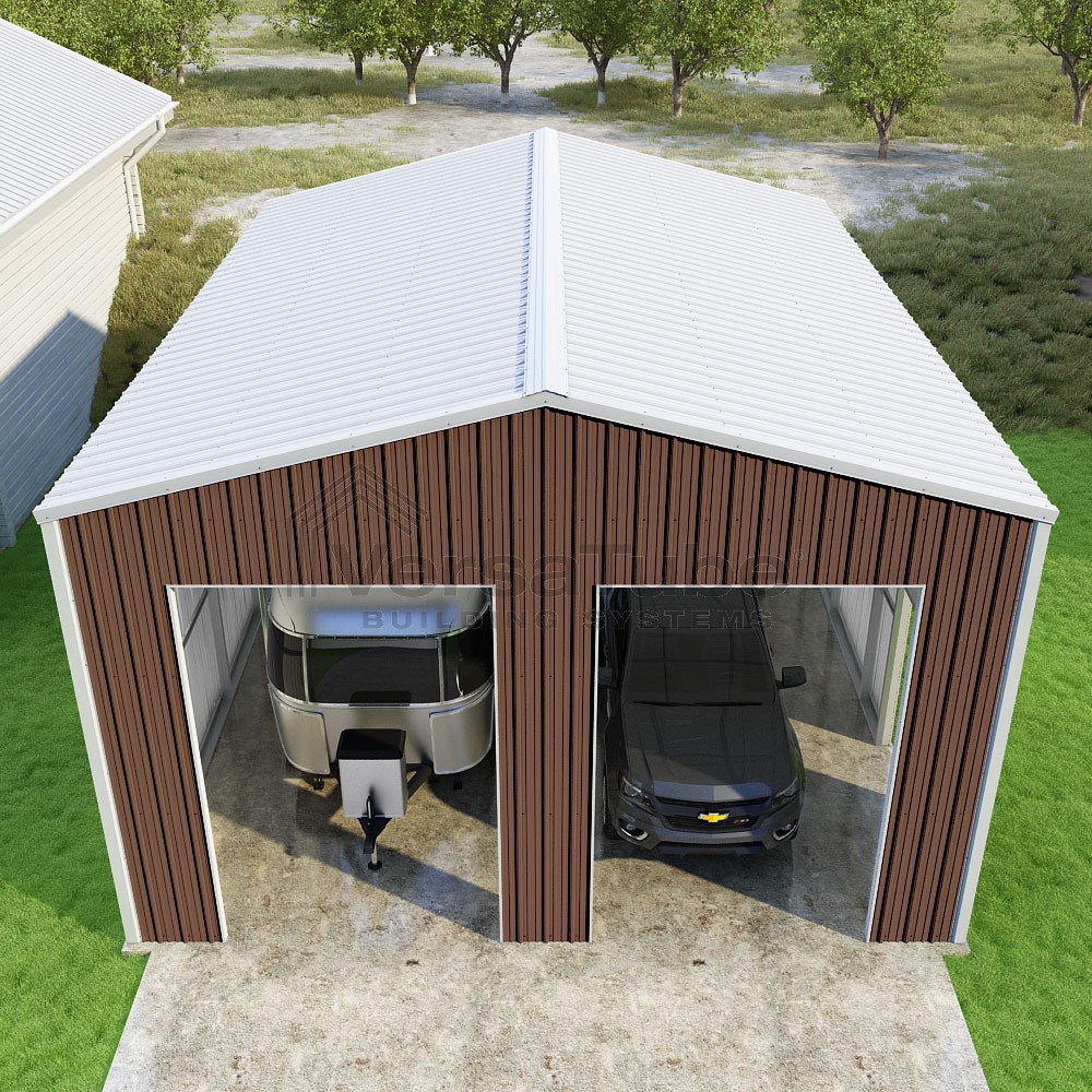 Summit Series DIY garage kit features vertical sheet metal roof and siding panels for a consistent look.