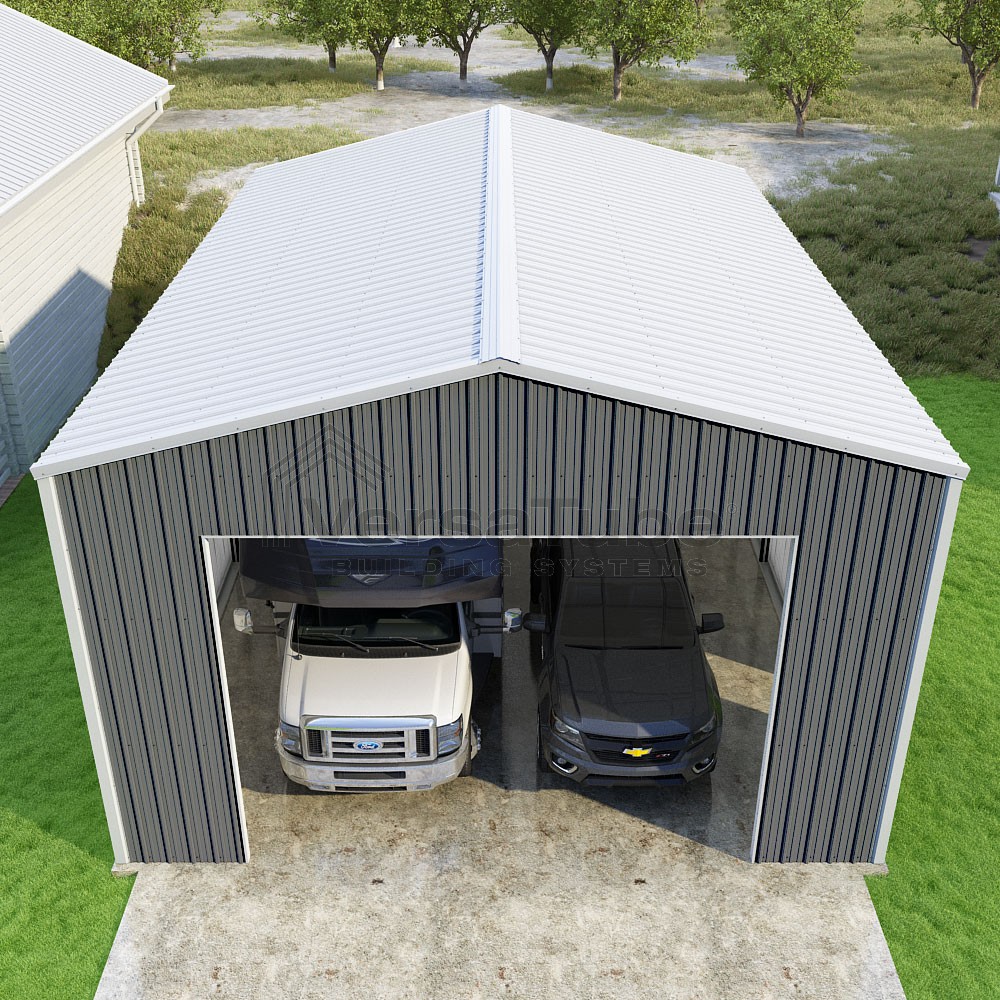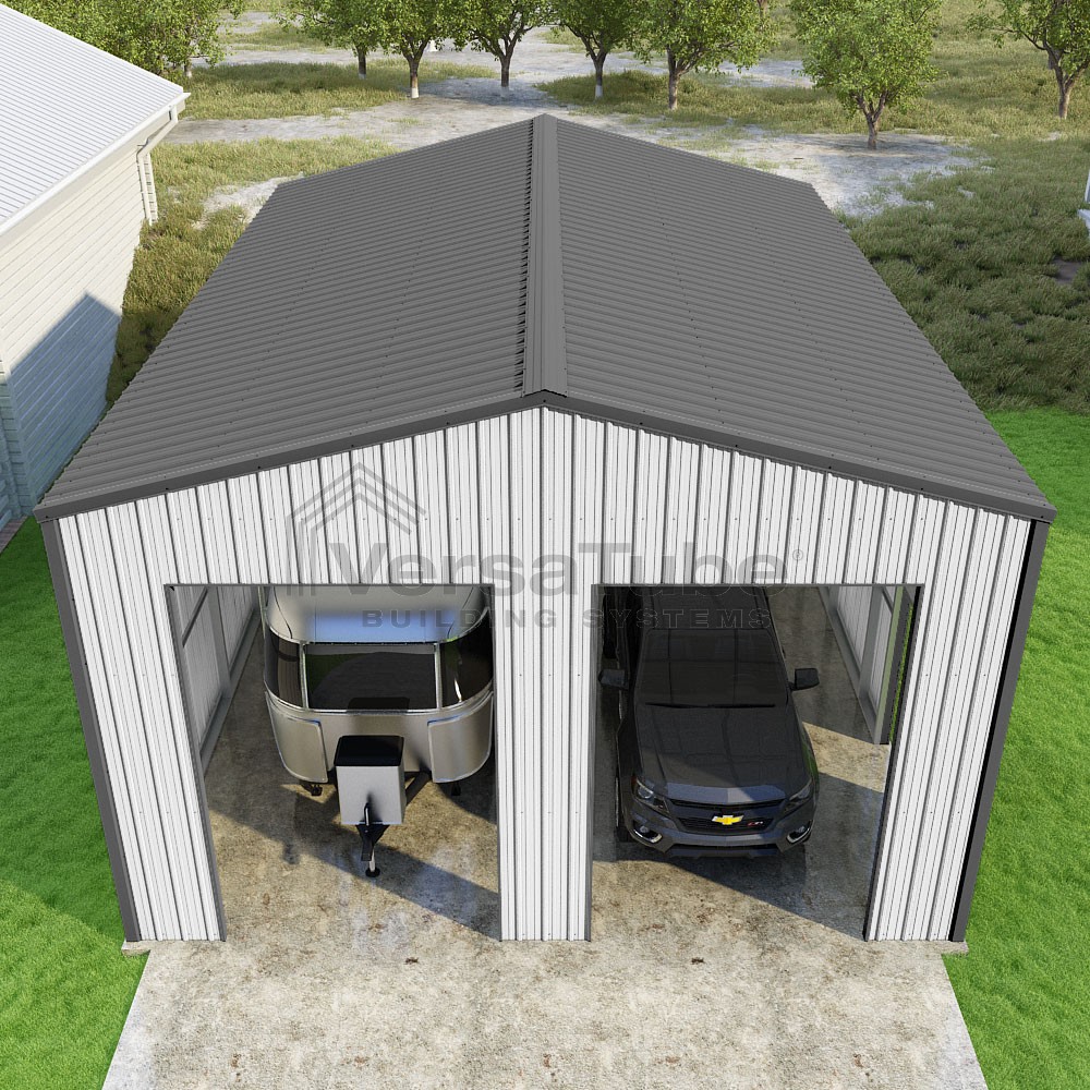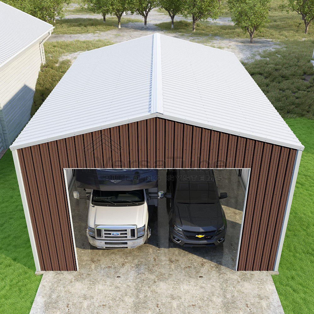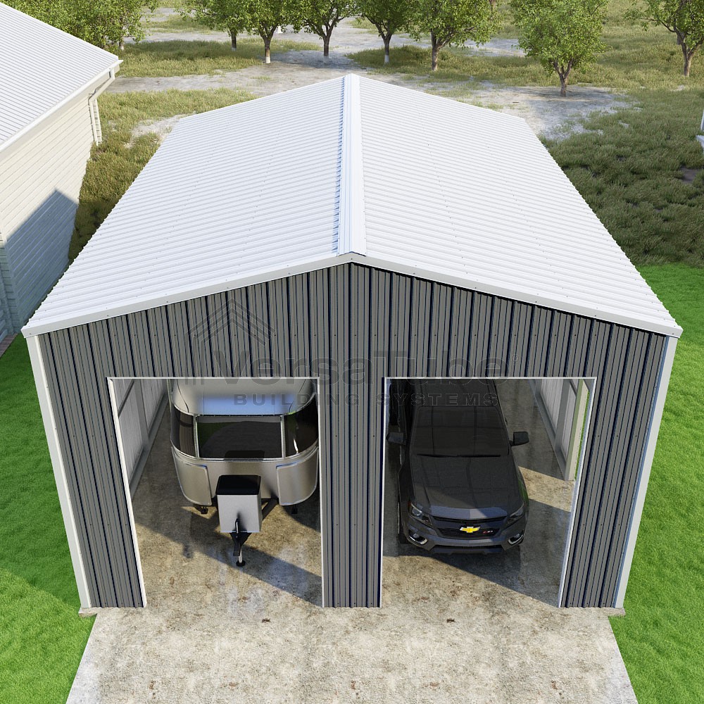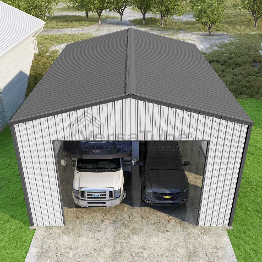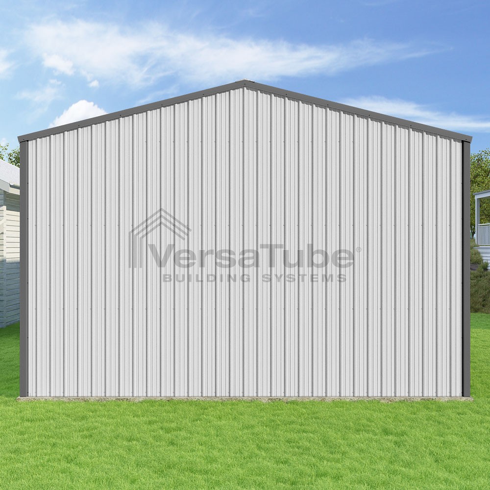 Summit Series DIY garage kit features vertical sheet metal roof and siding panels for a consistent look.