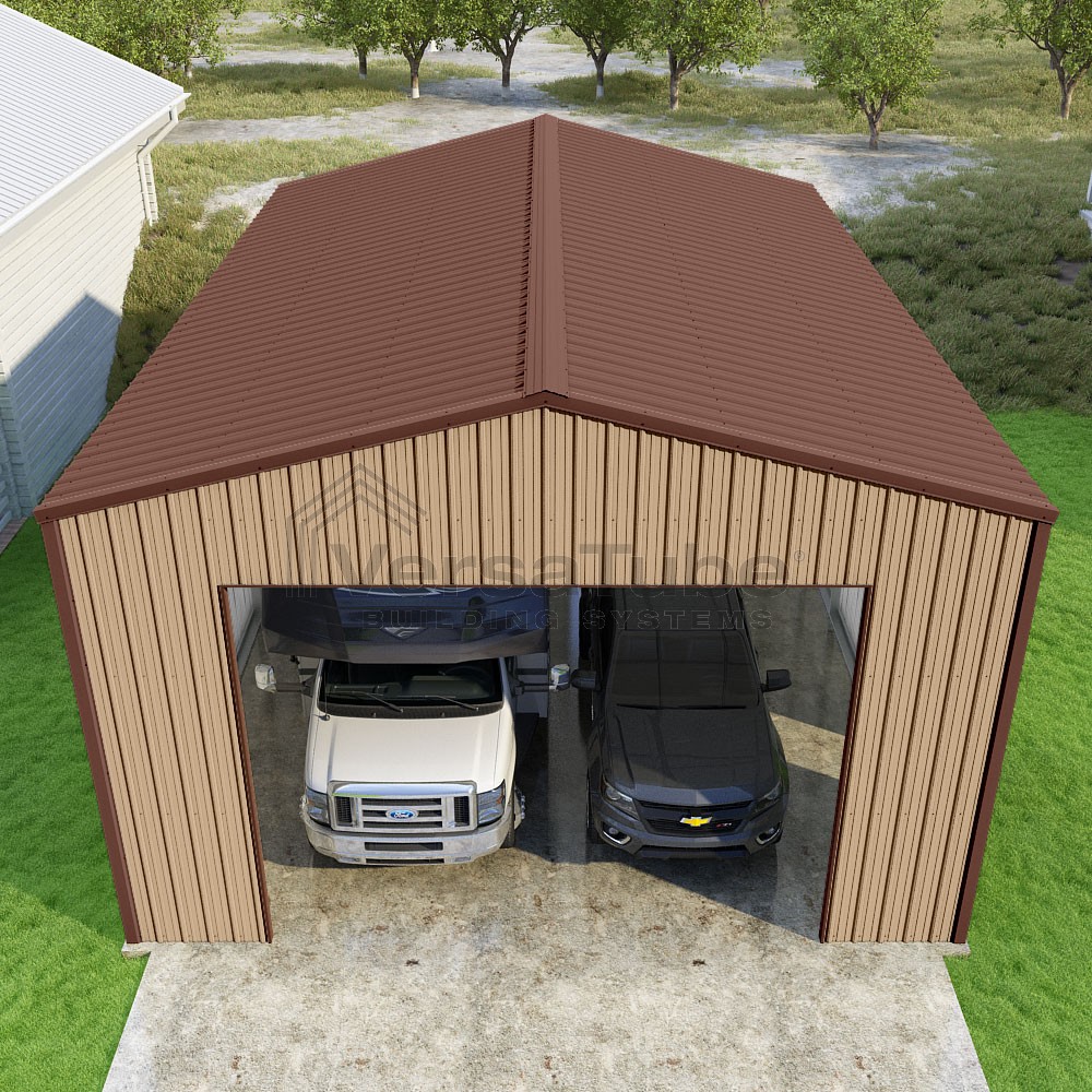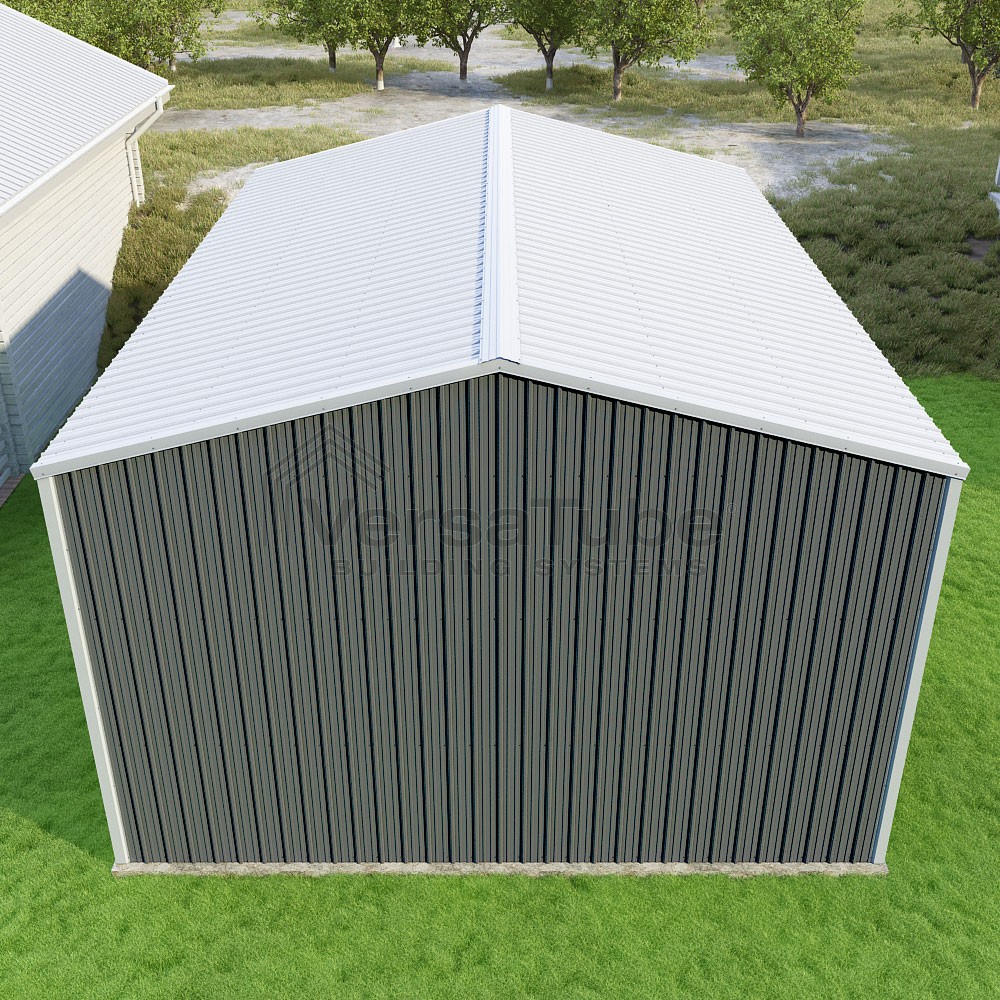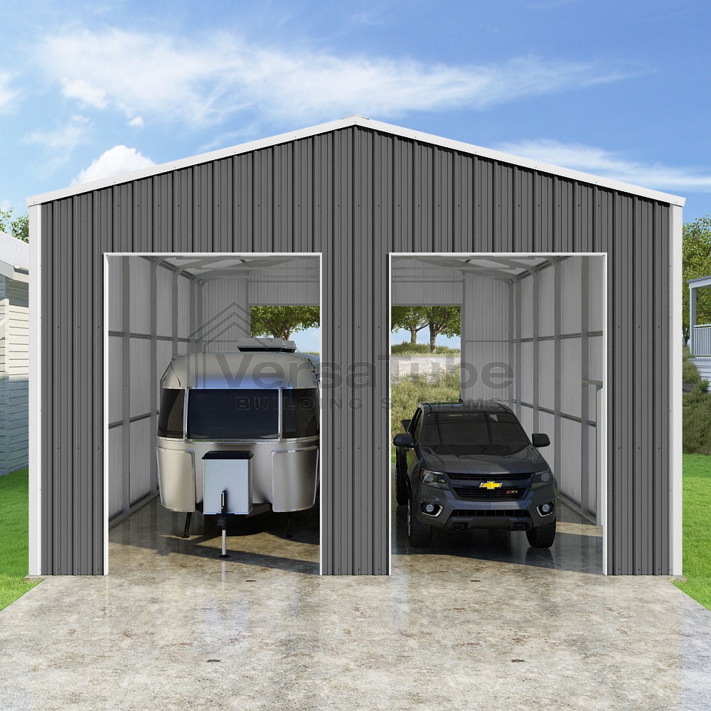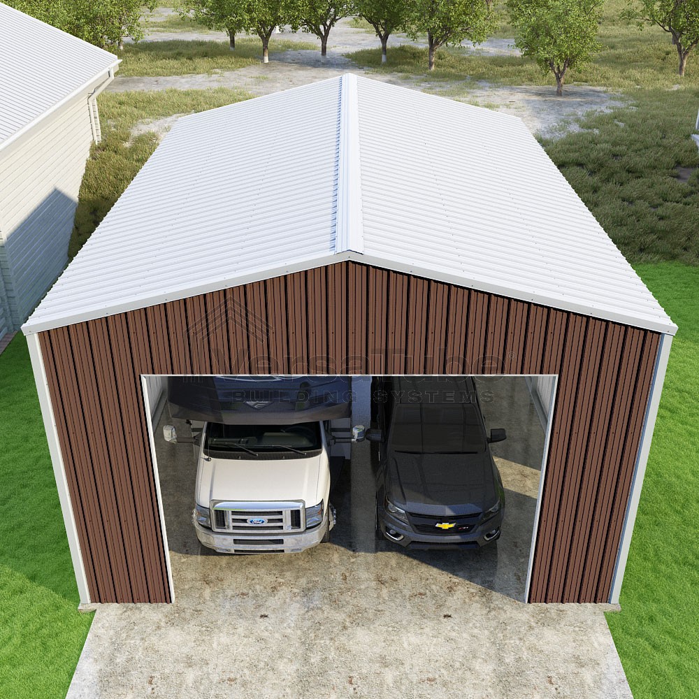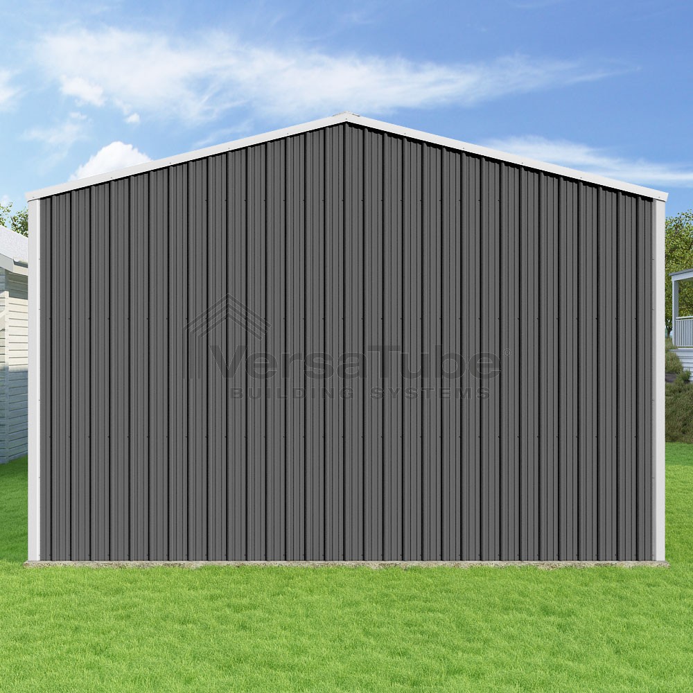 Summit Series DIY garage kit features vertical sheet metal roof and siding panels for a consistent look.