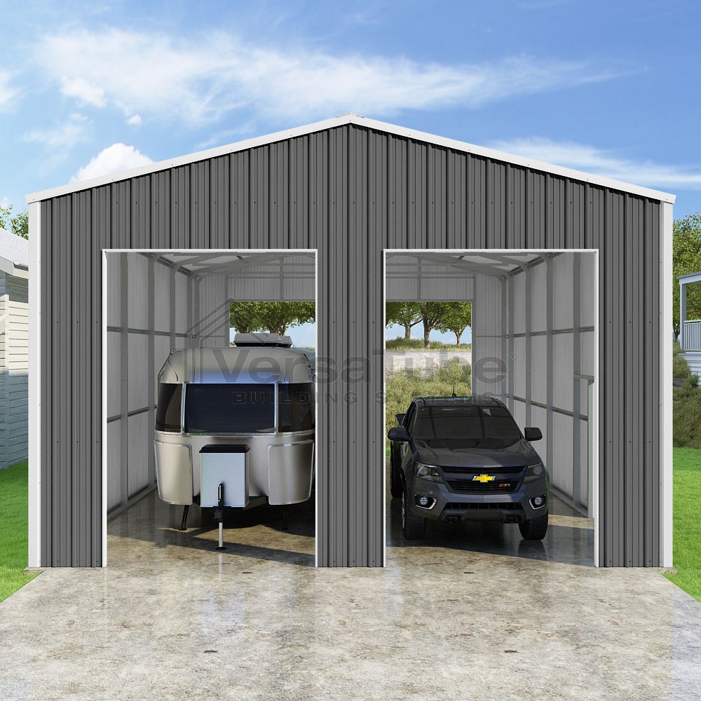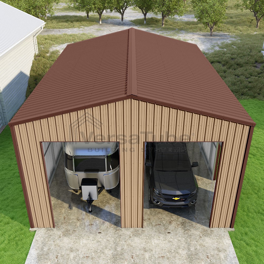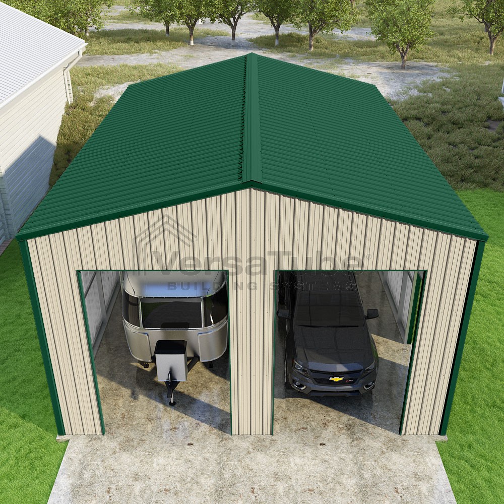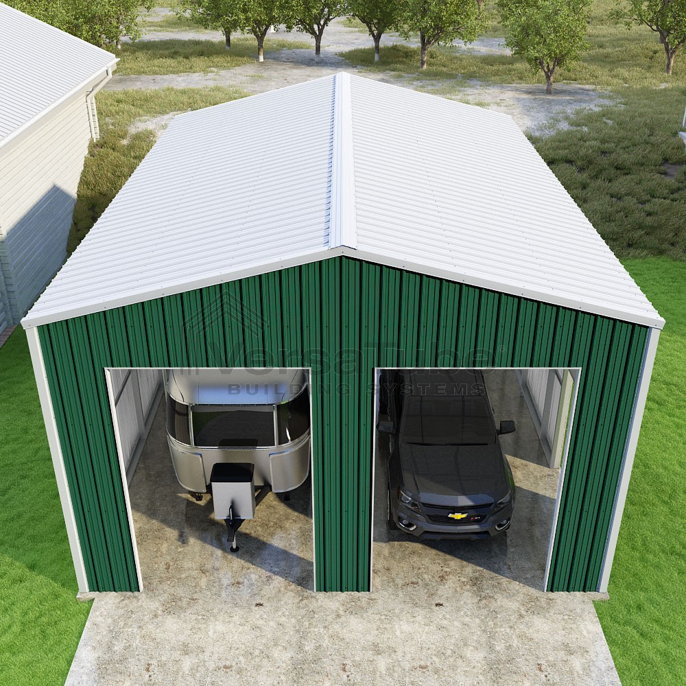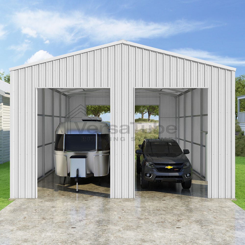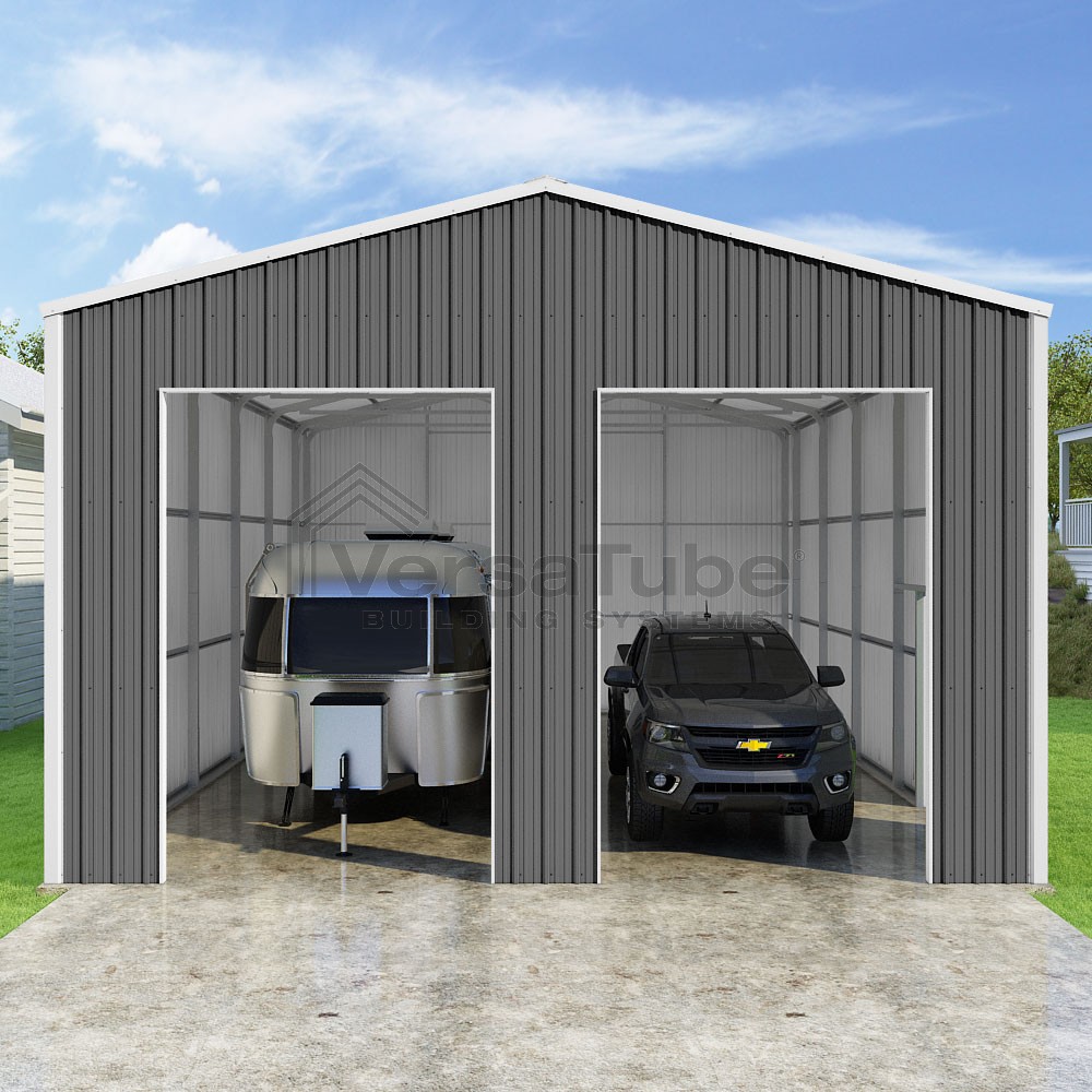 Summit Series DIY garage kit features vertical sheet metal roof and siding panels for a consistent look.