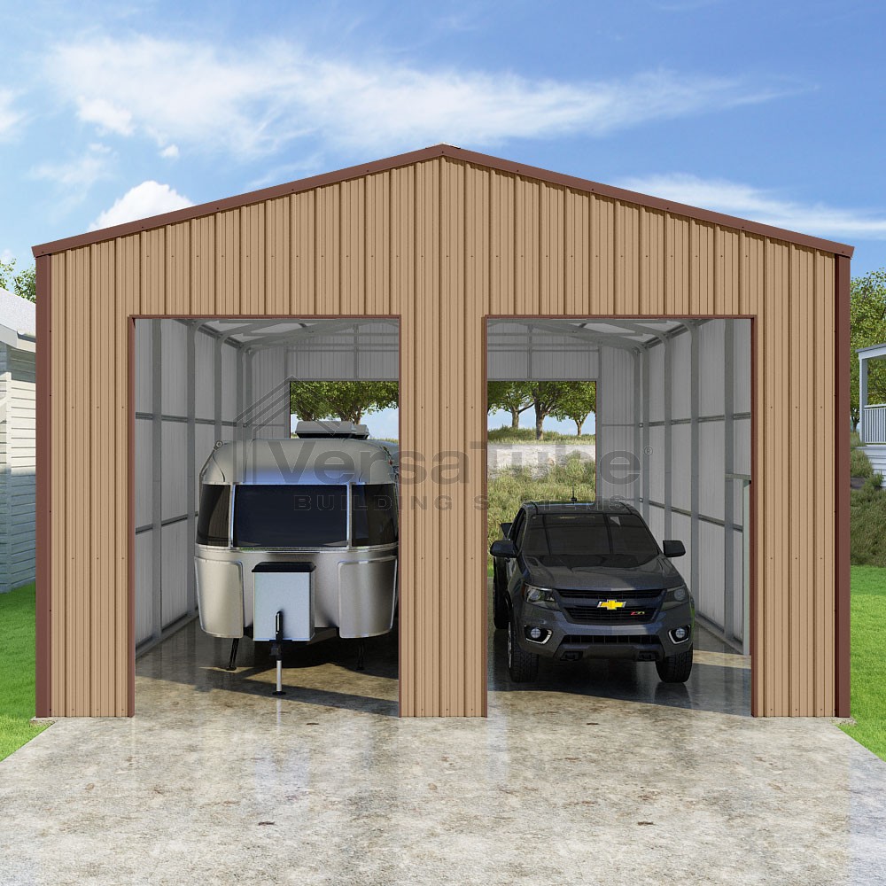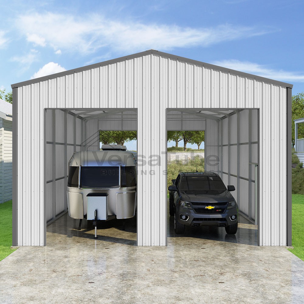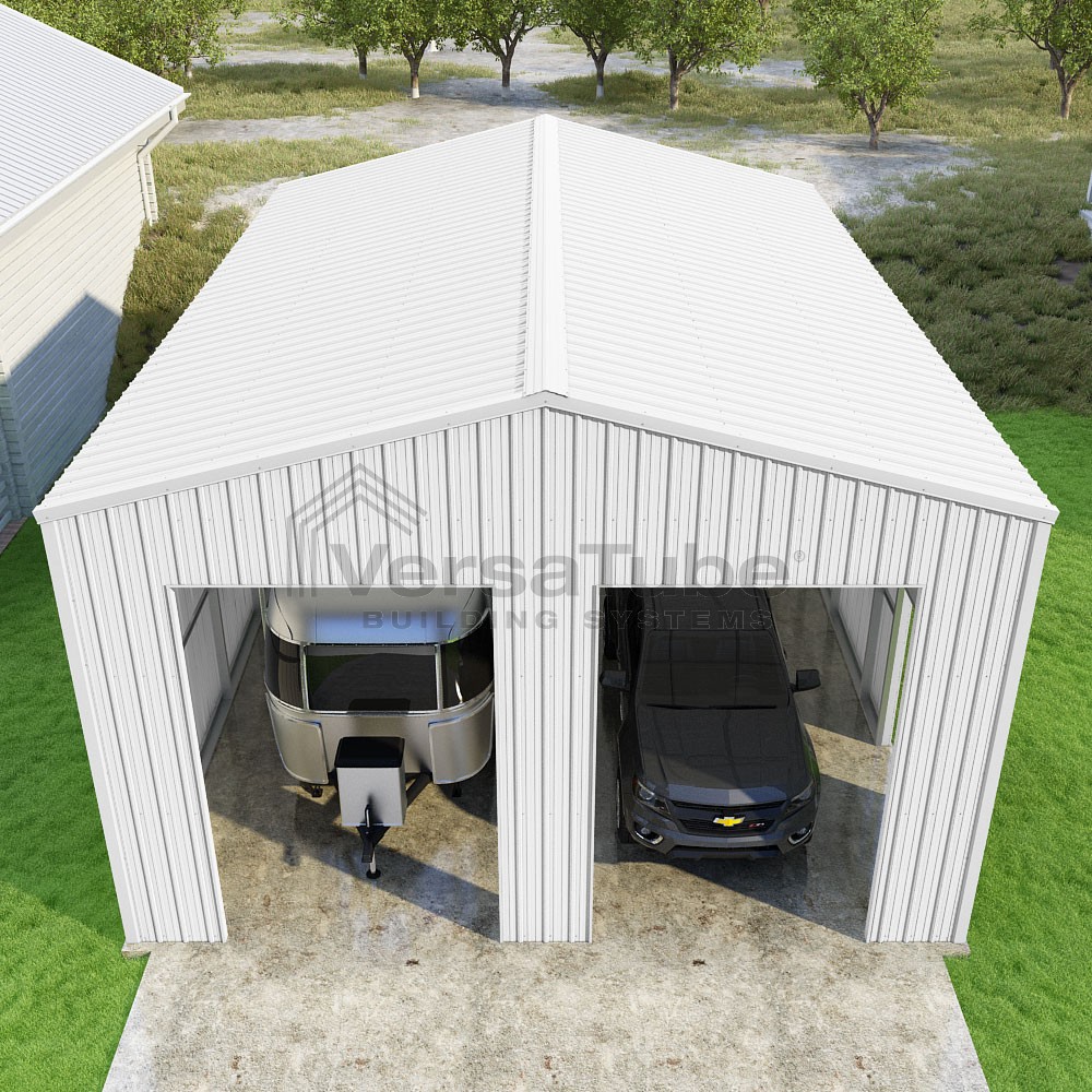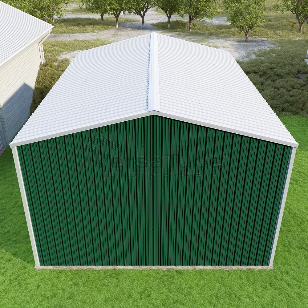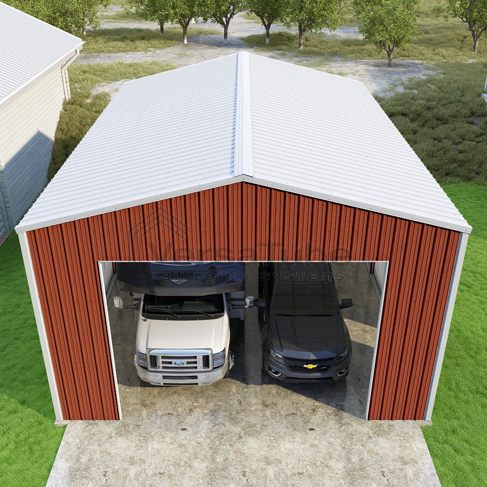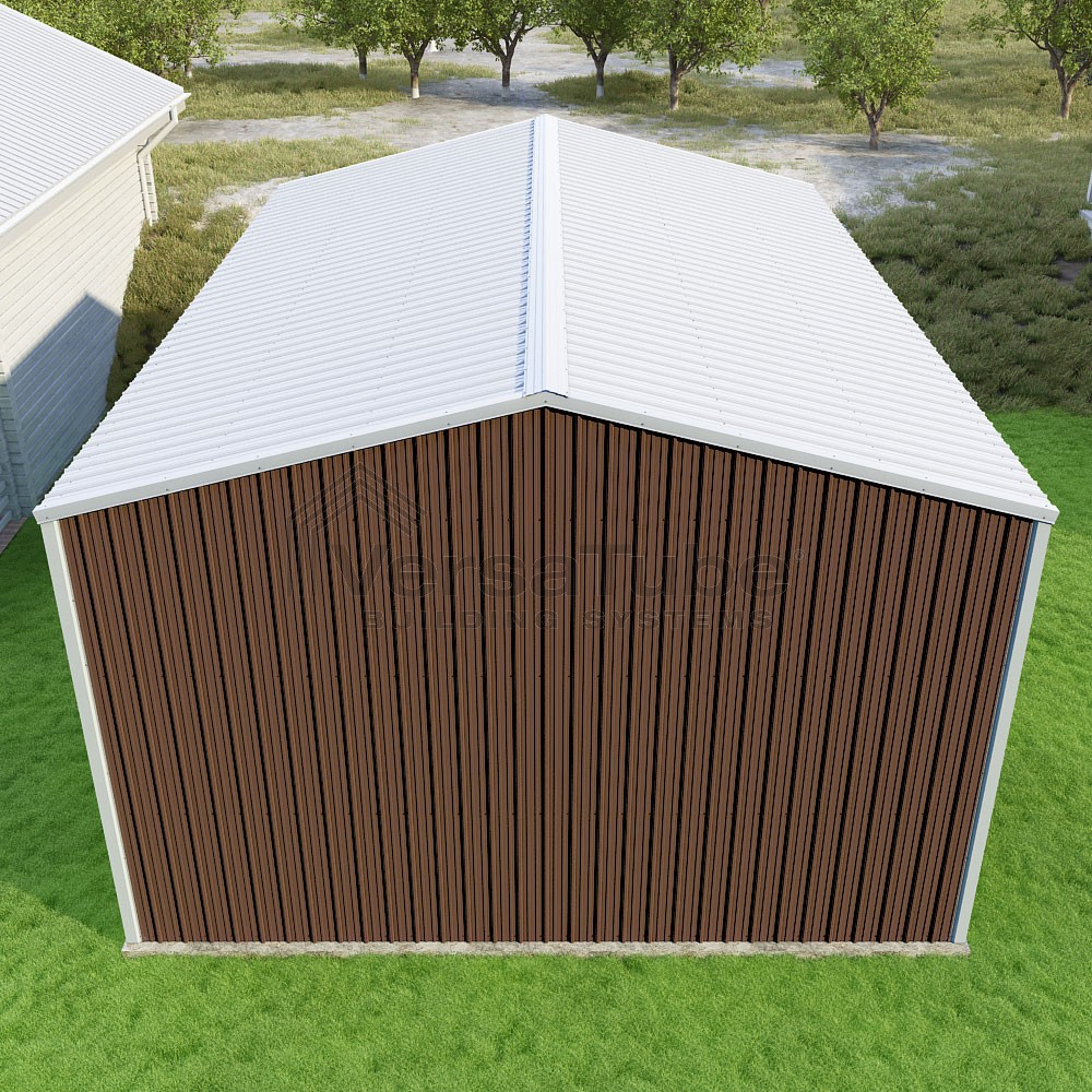 Summit Series DIY garage kit features vertical sheet metal roof and siding panels for a consistent look.