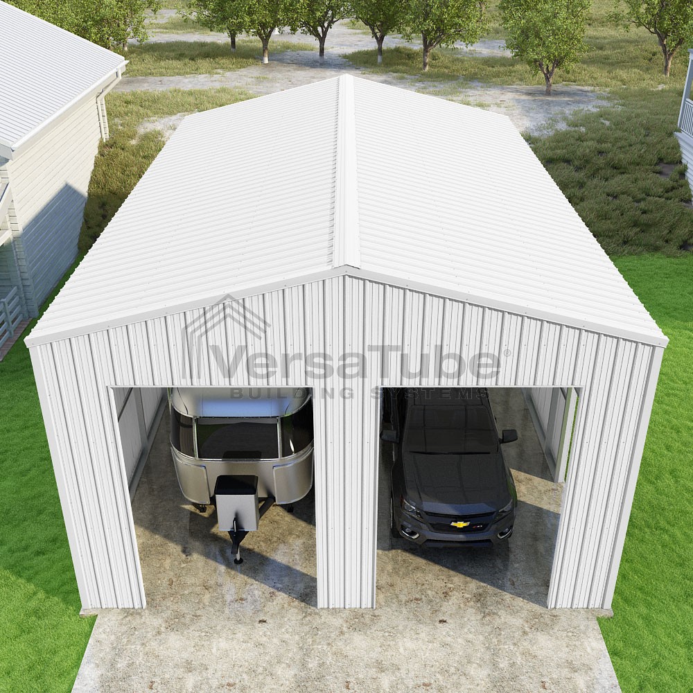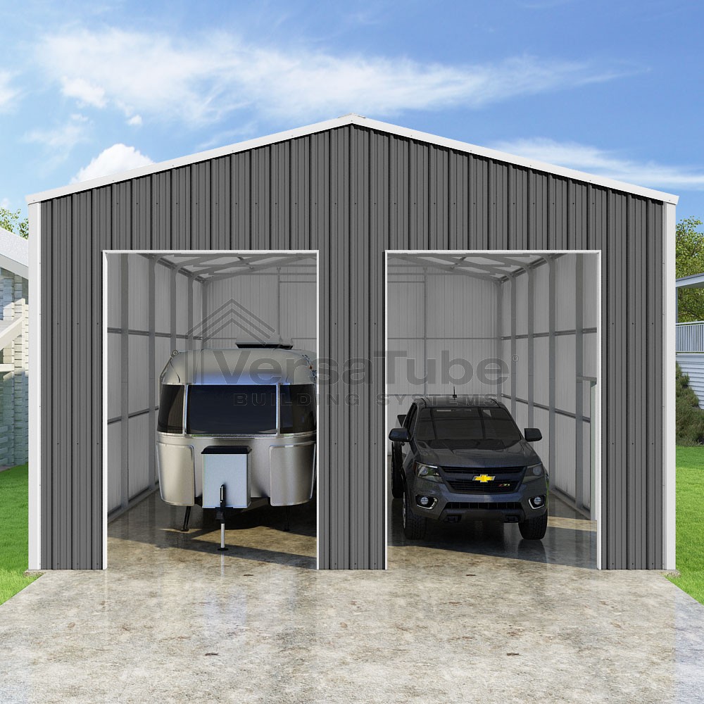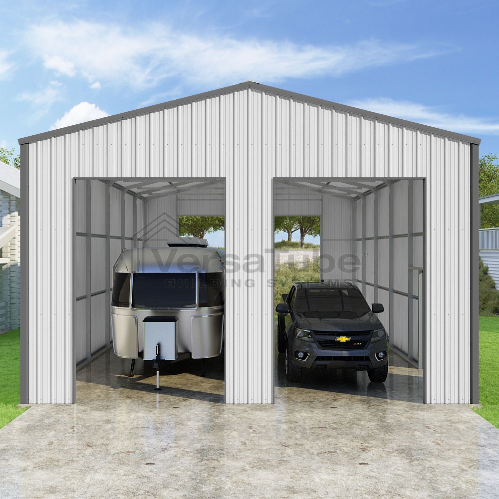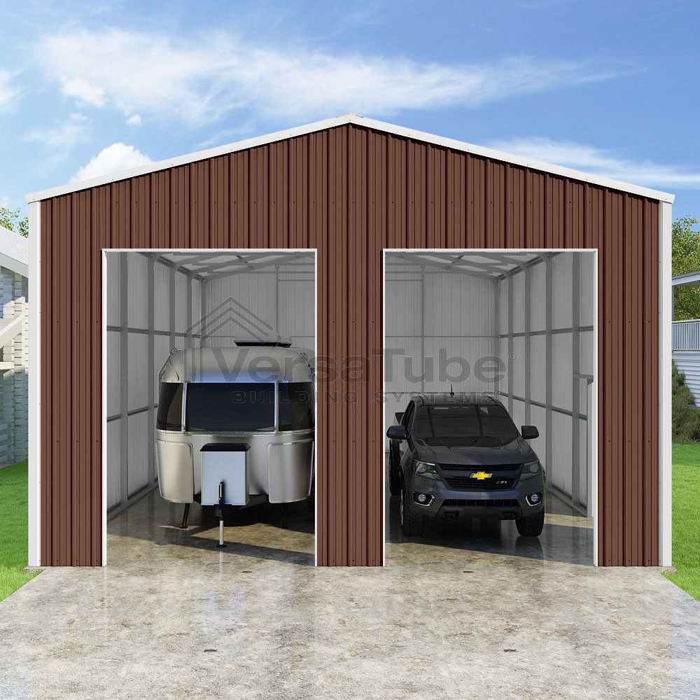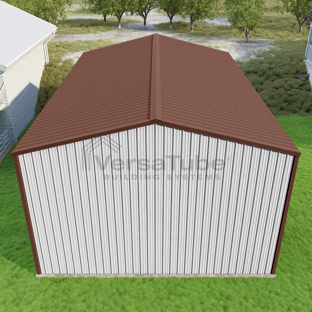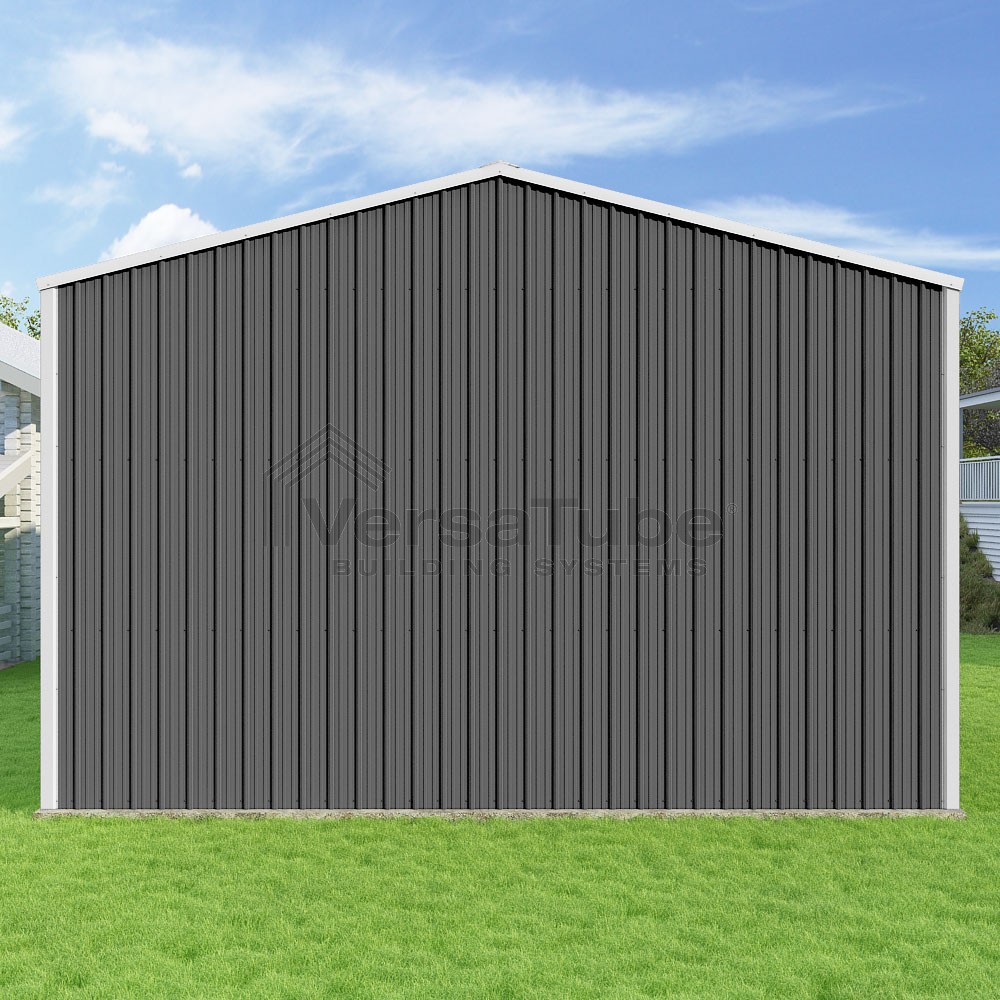 Summit Series DIY garage kit features vertical sheet metal roof and siding panels for a consistent look.