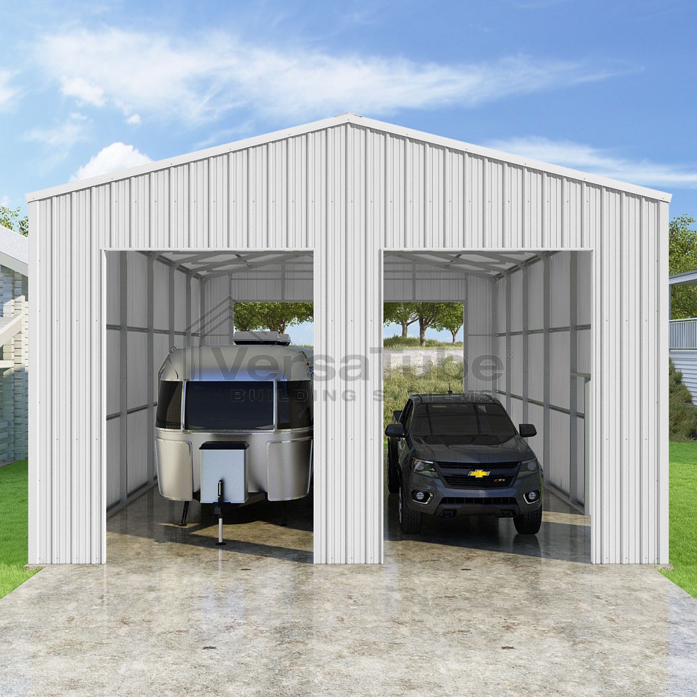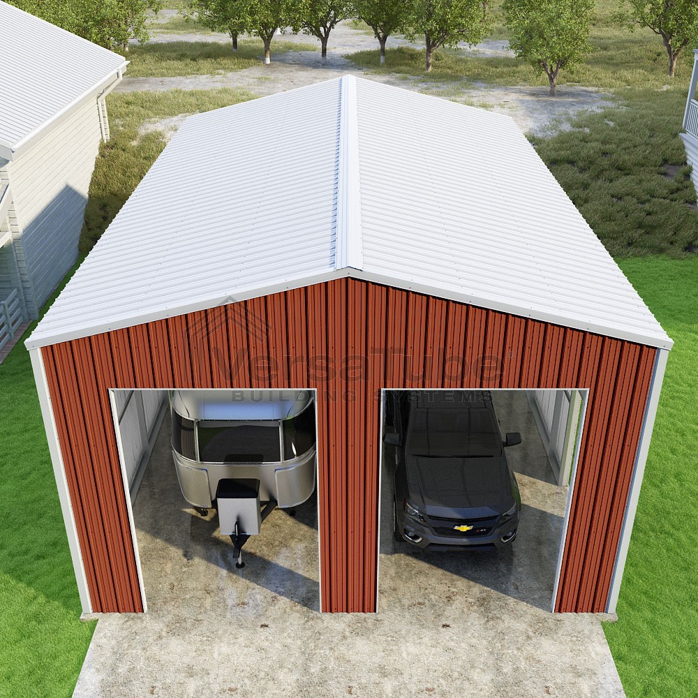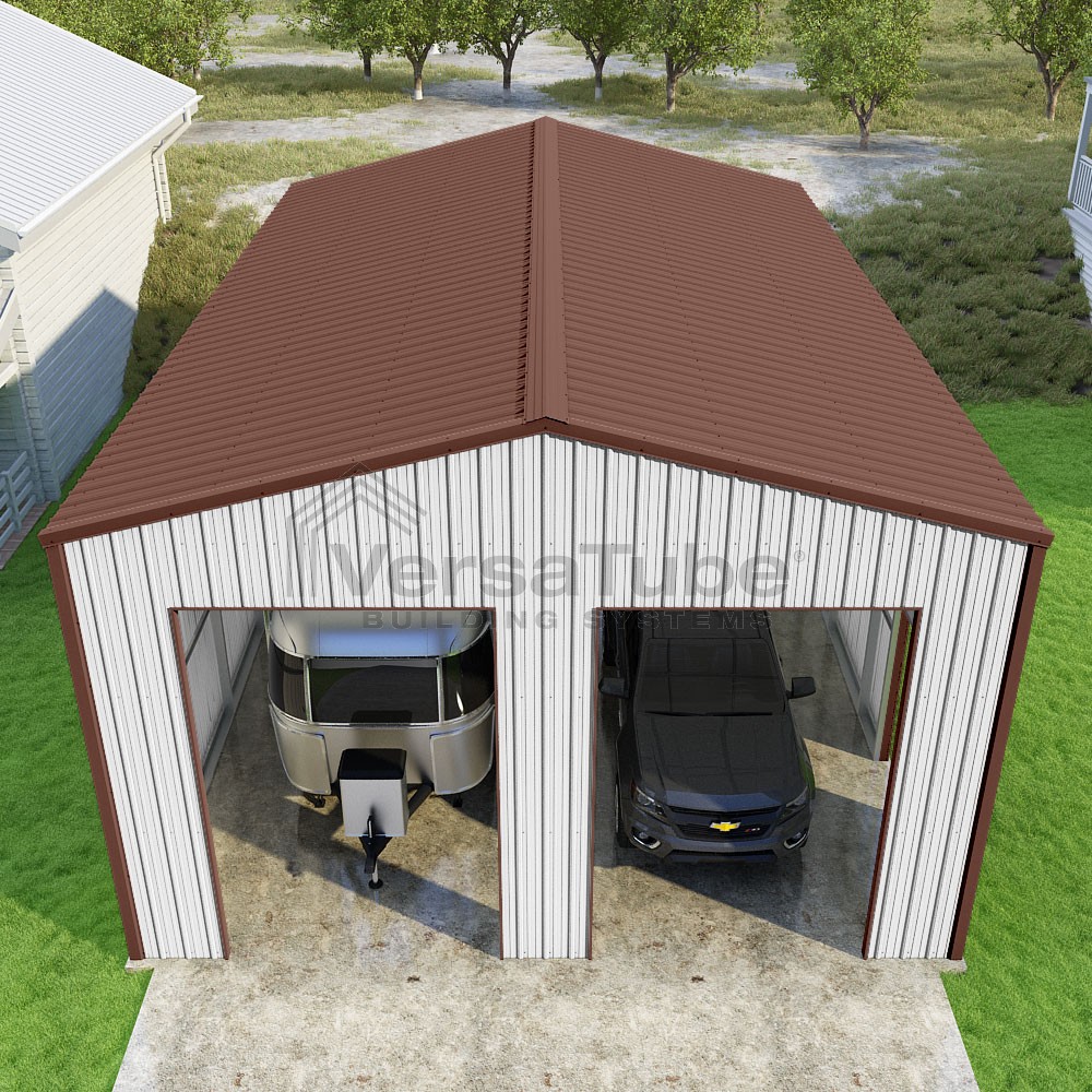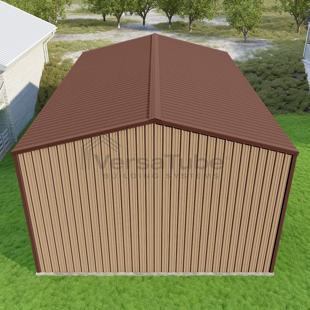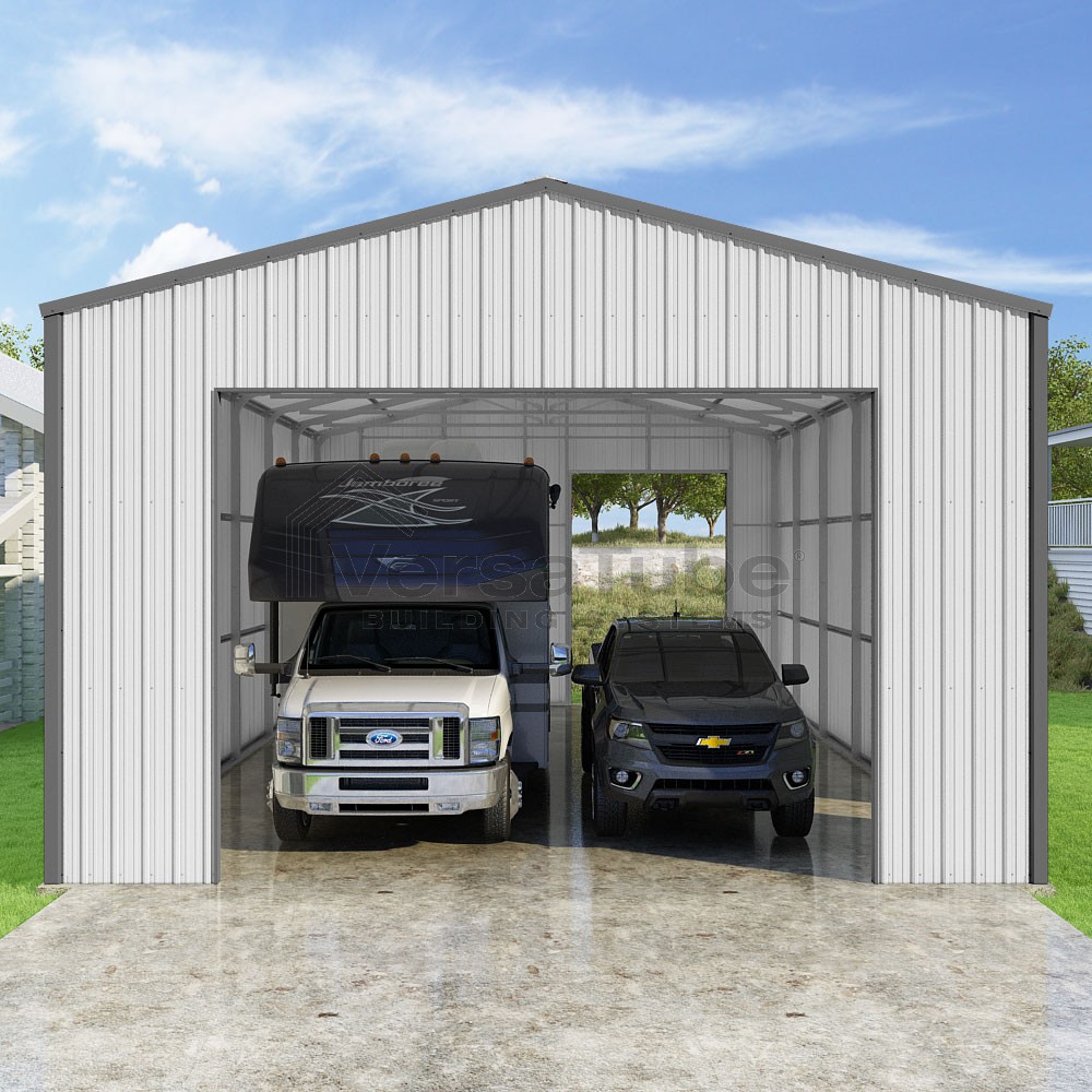 Summit Series DIY garage kit features vertical sheet metal roof and siding panels for a consistent look.