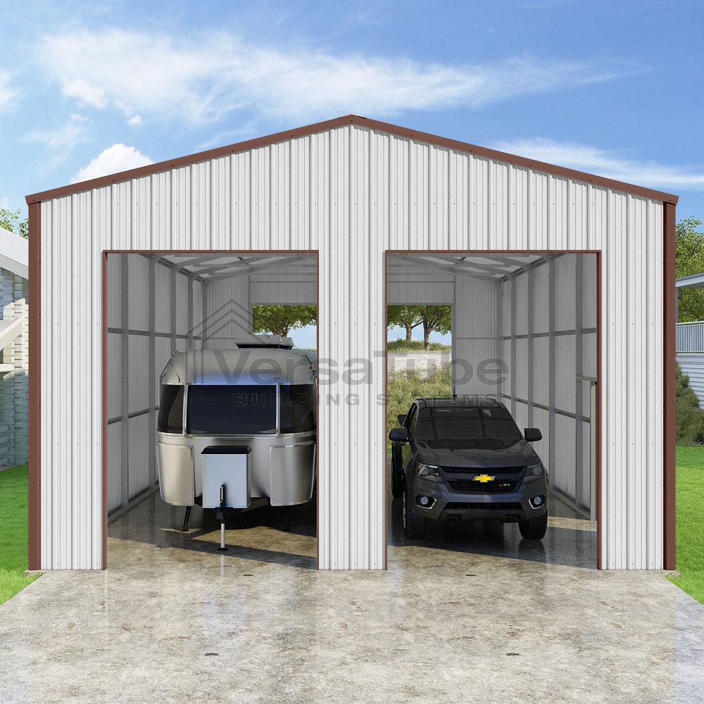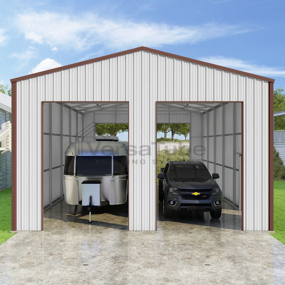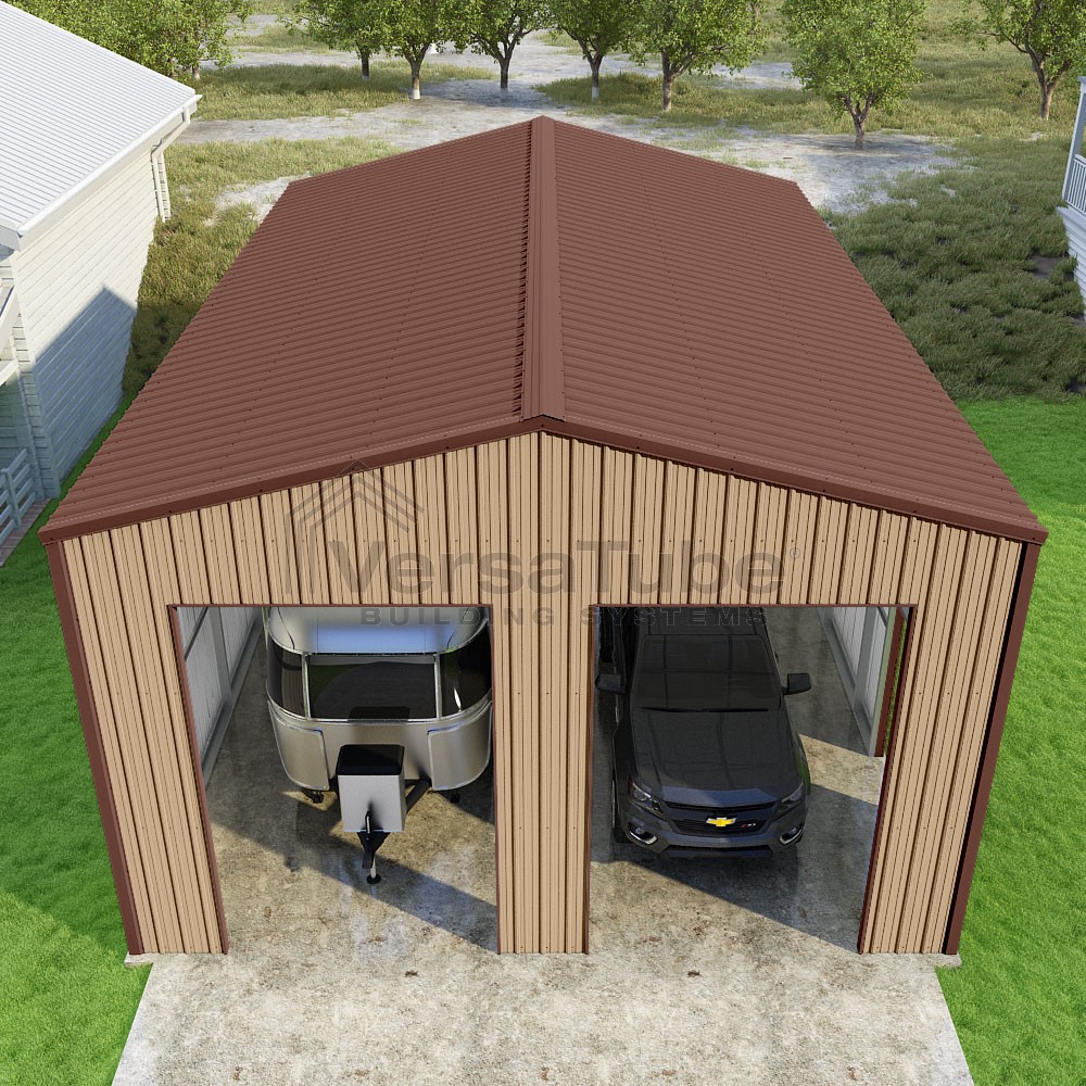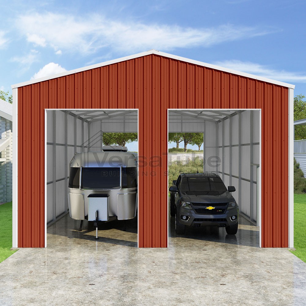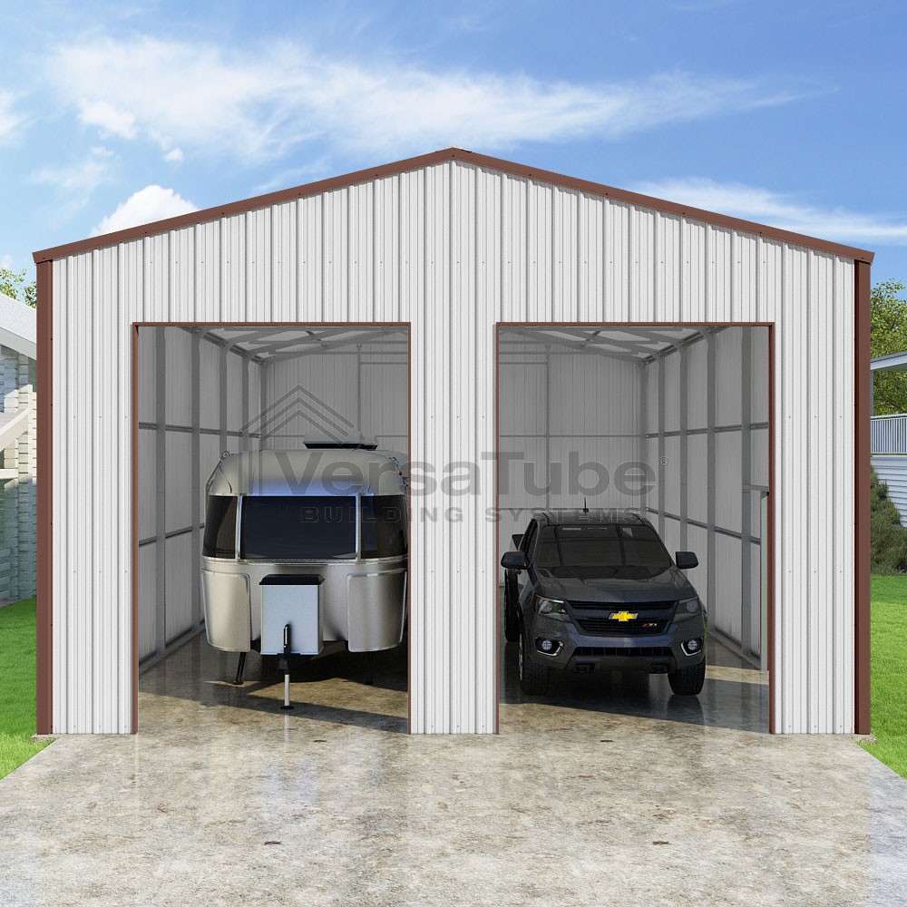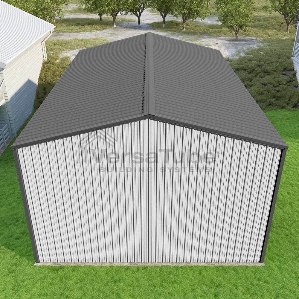 Summit Series DIY garage kit features vertical sheet metal roof and siding panels for a consistent look.