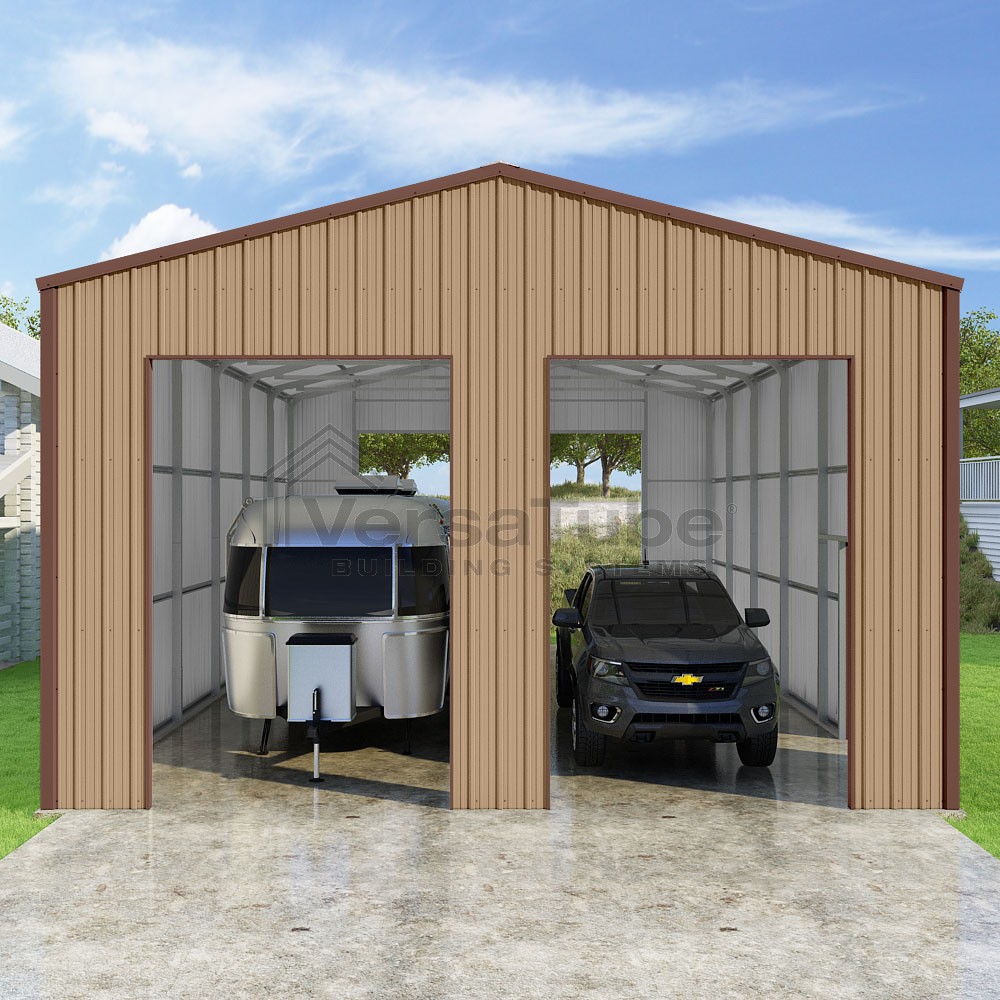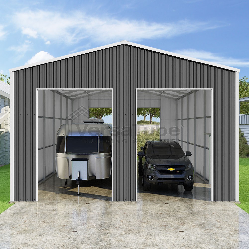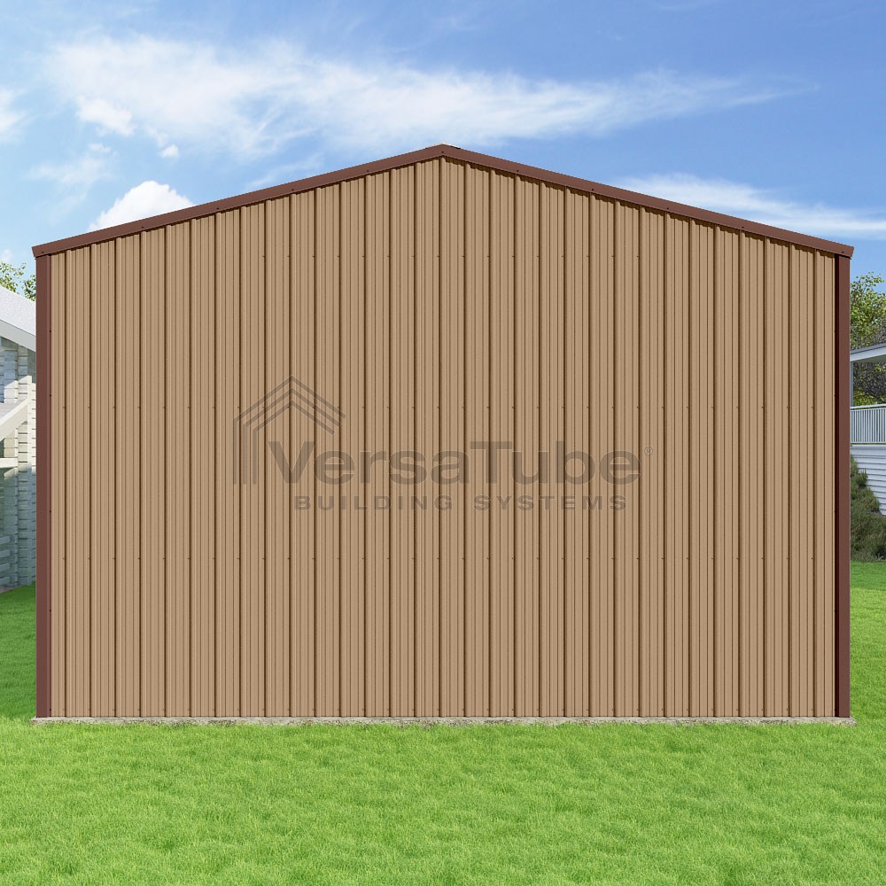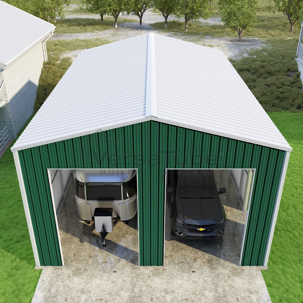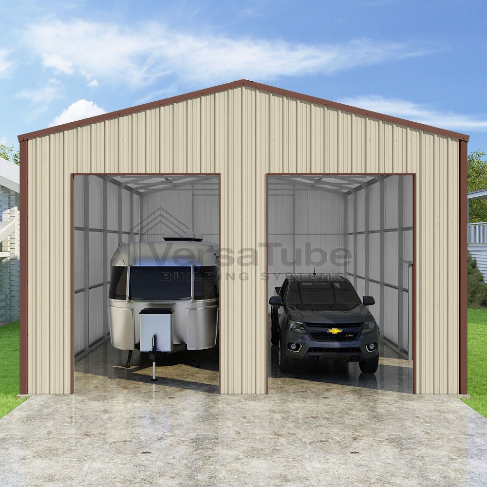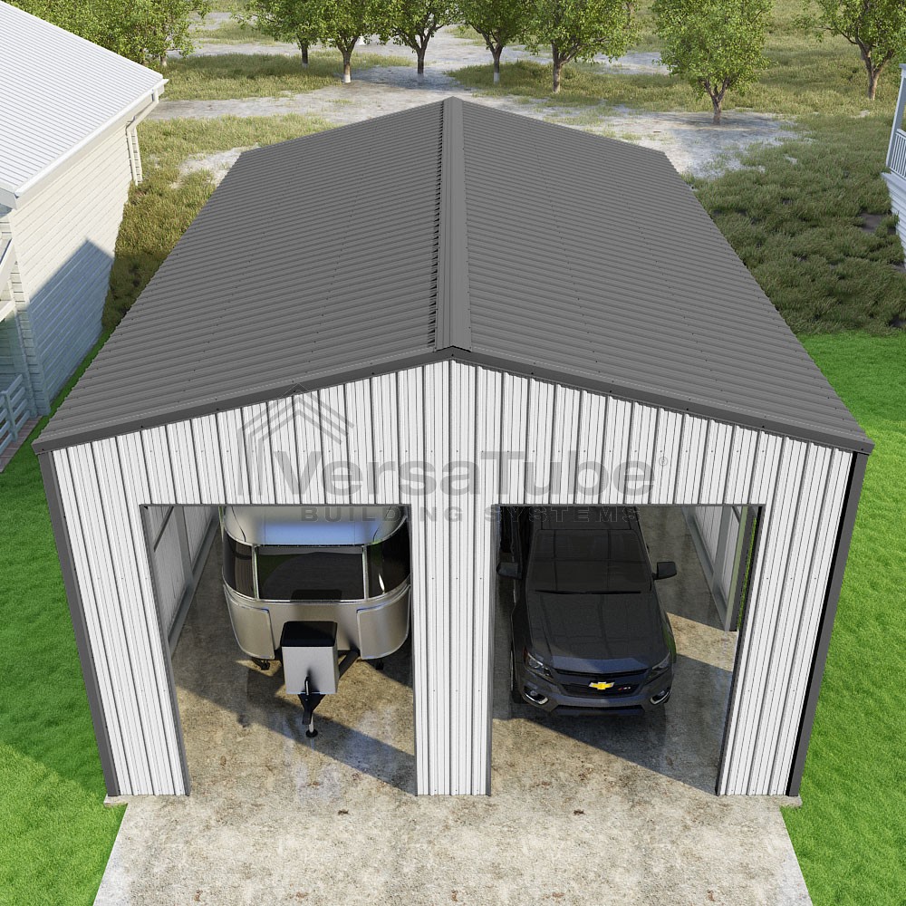 Summit Series DIY garage kit features vertical sheet metal roof and siding panels for a consistent look.