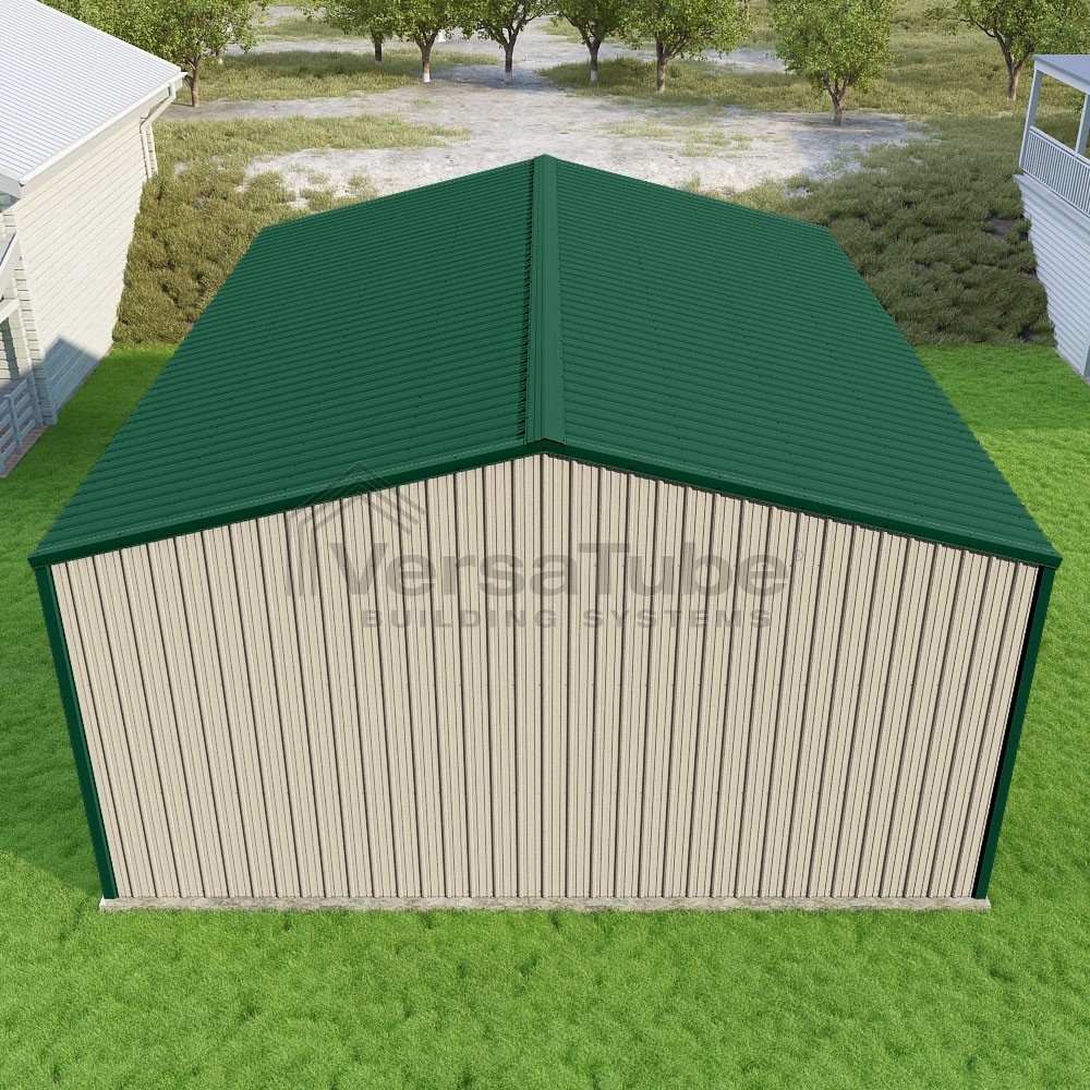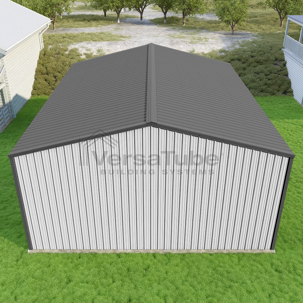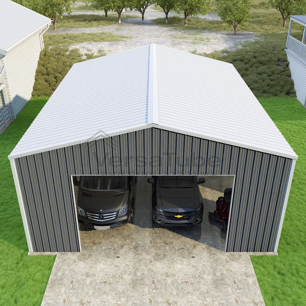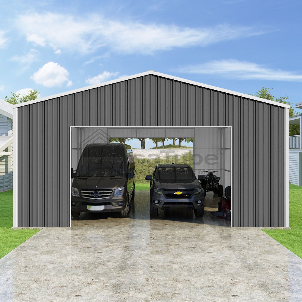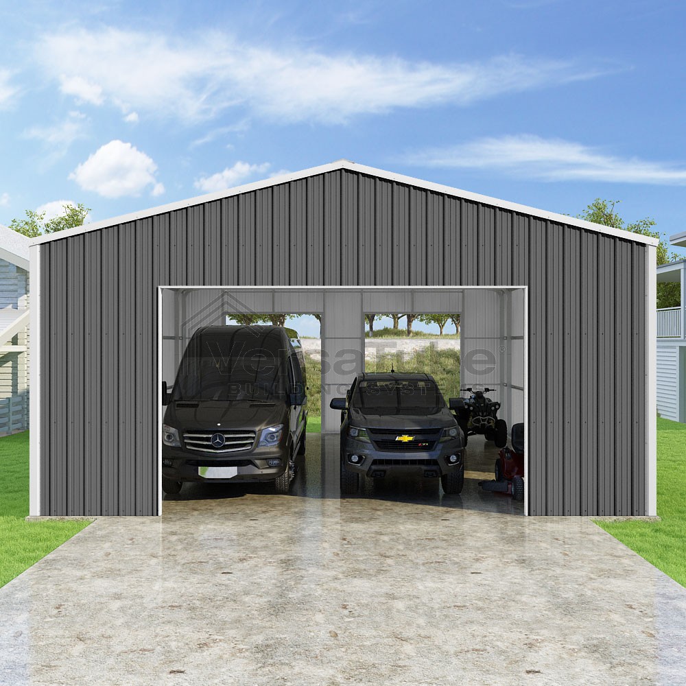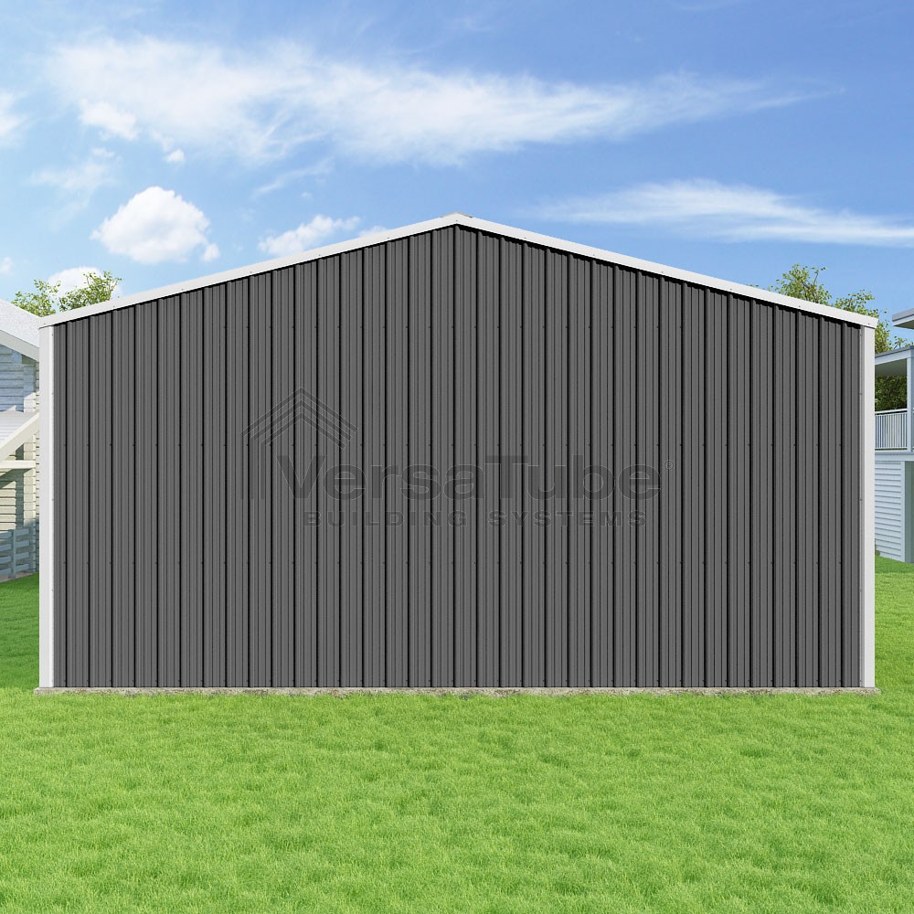 Summit Series DIY garage kit features vertical sheet metal roof and siding panels for a consistent look.
