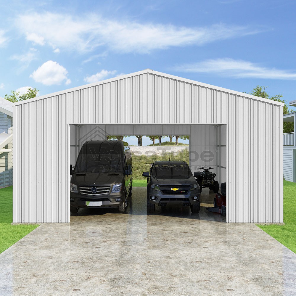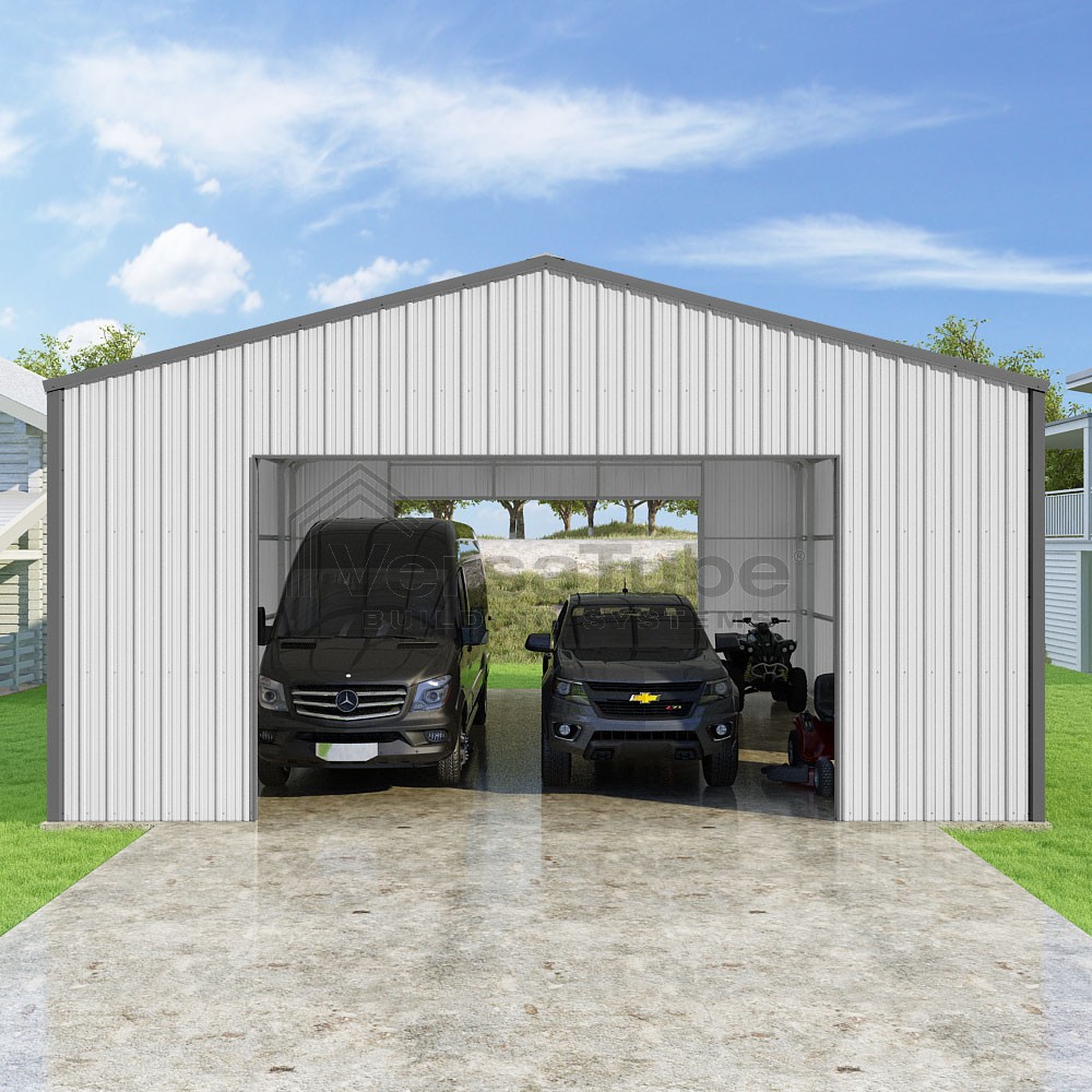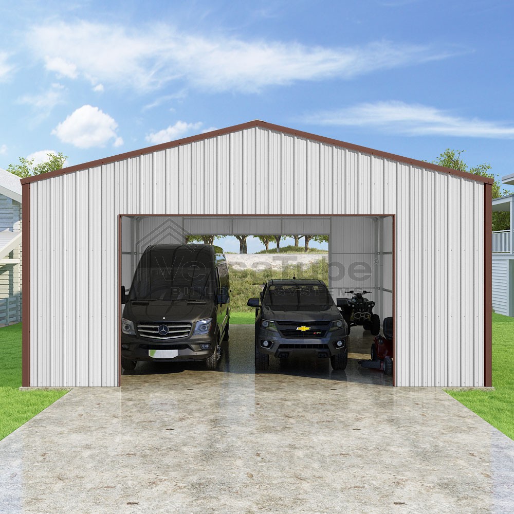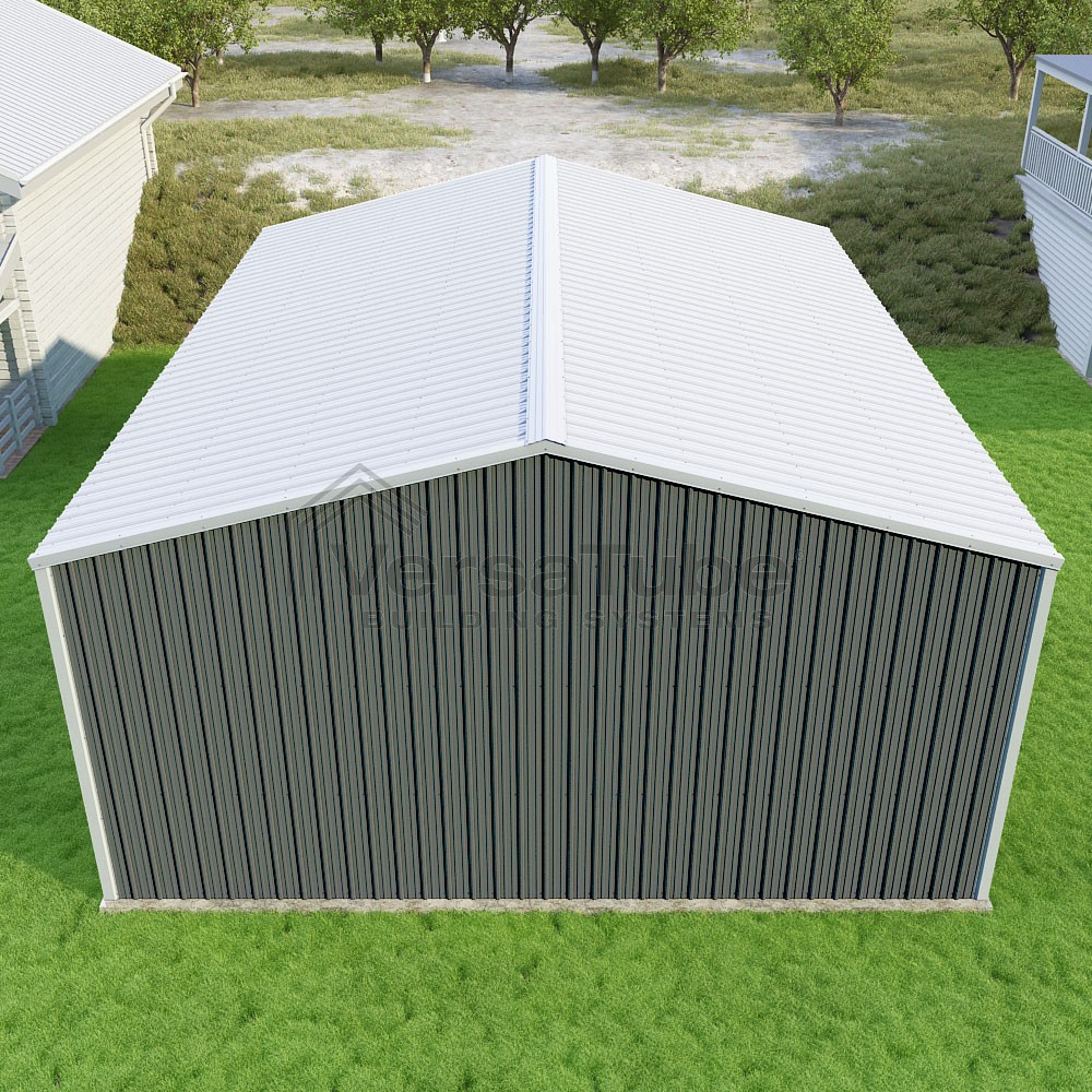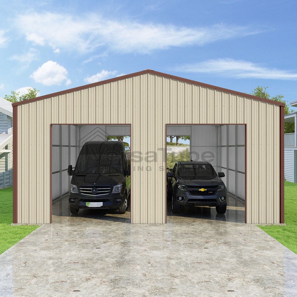 Summit Series DIY garage kit features vertical sheet metal roof and siding panels for a consistent look.
