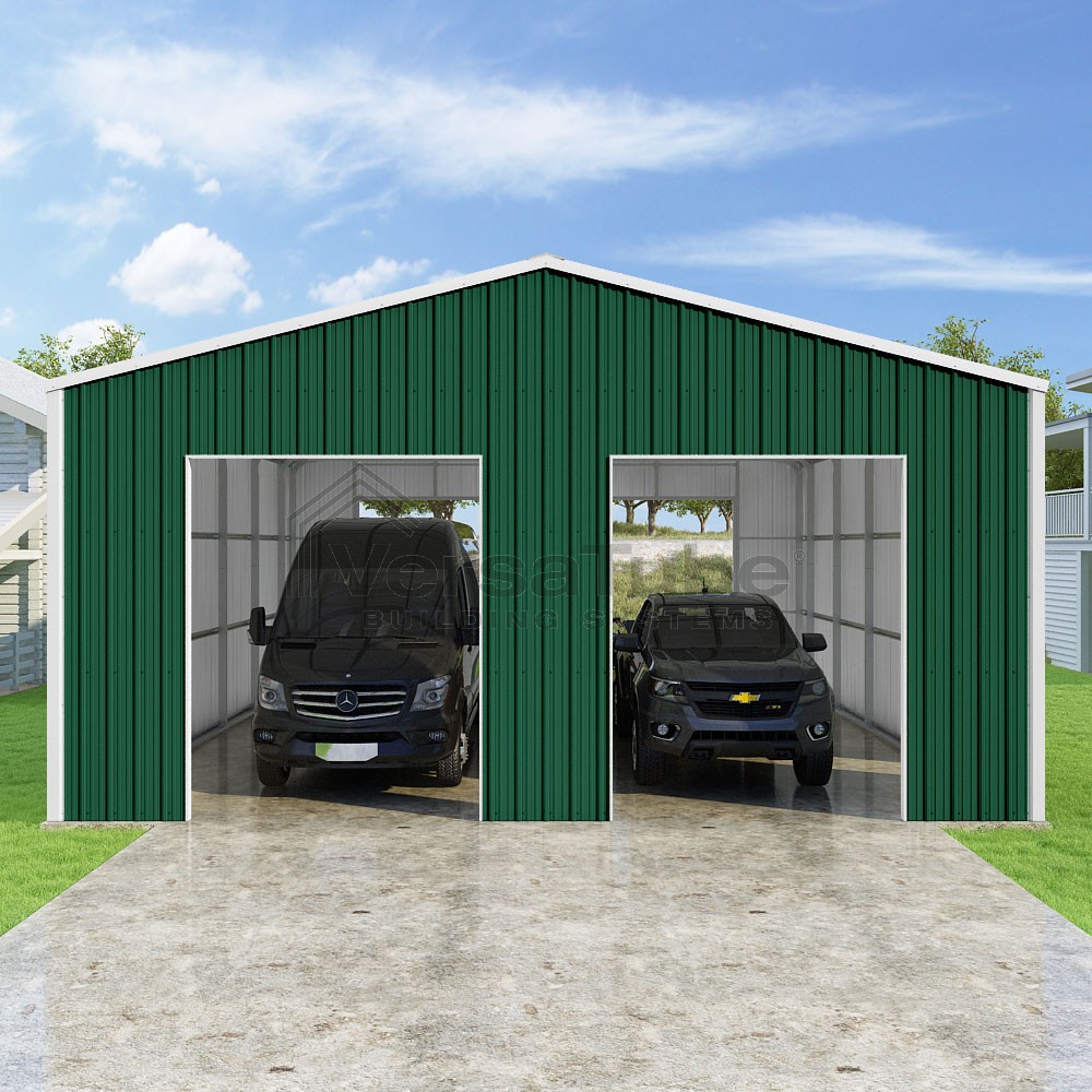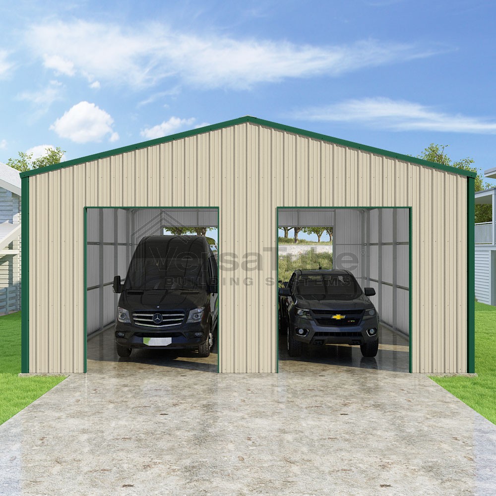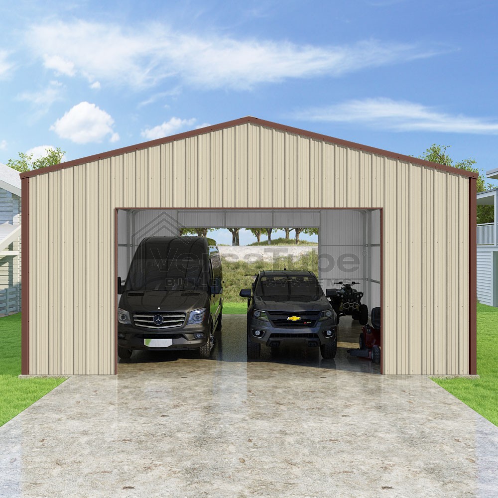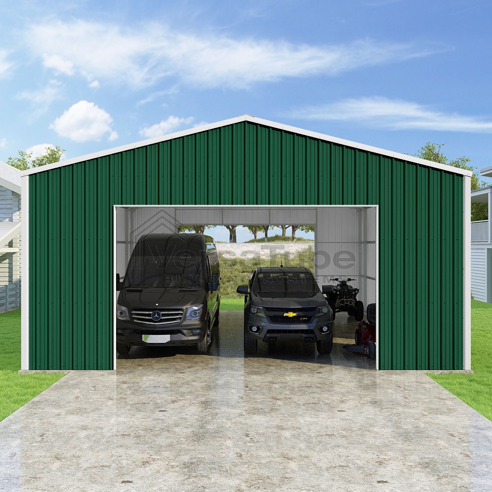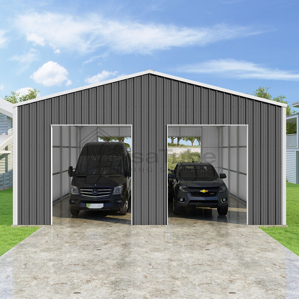 Summit Series DIY garage kit features vertical sheet metal roof and siding panels for a consistent look.