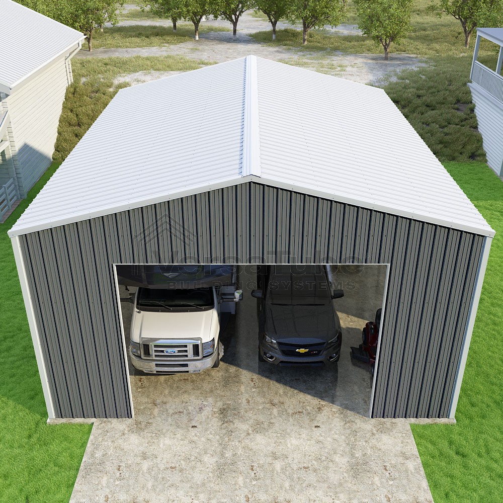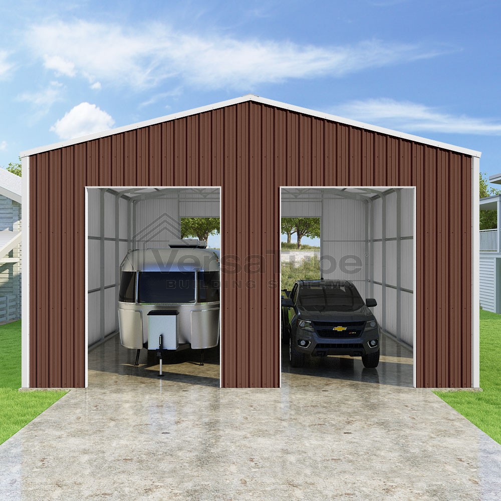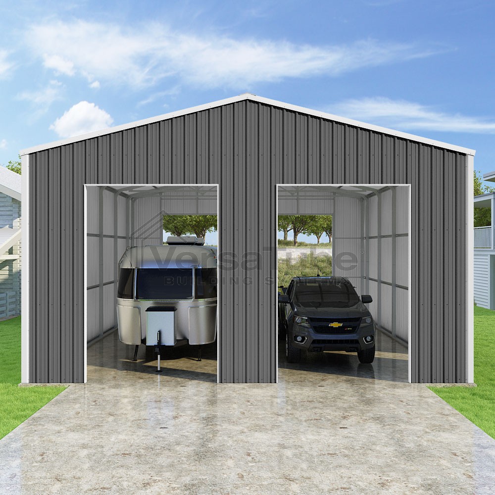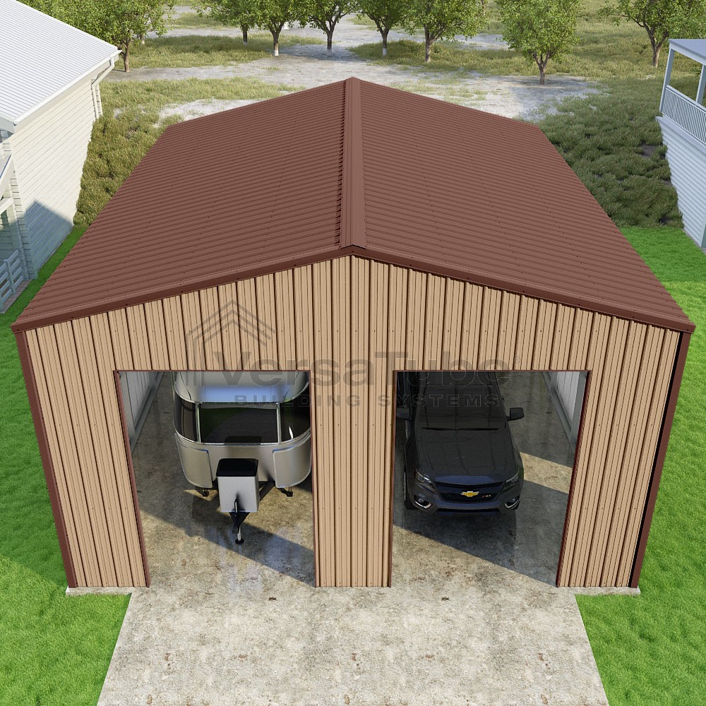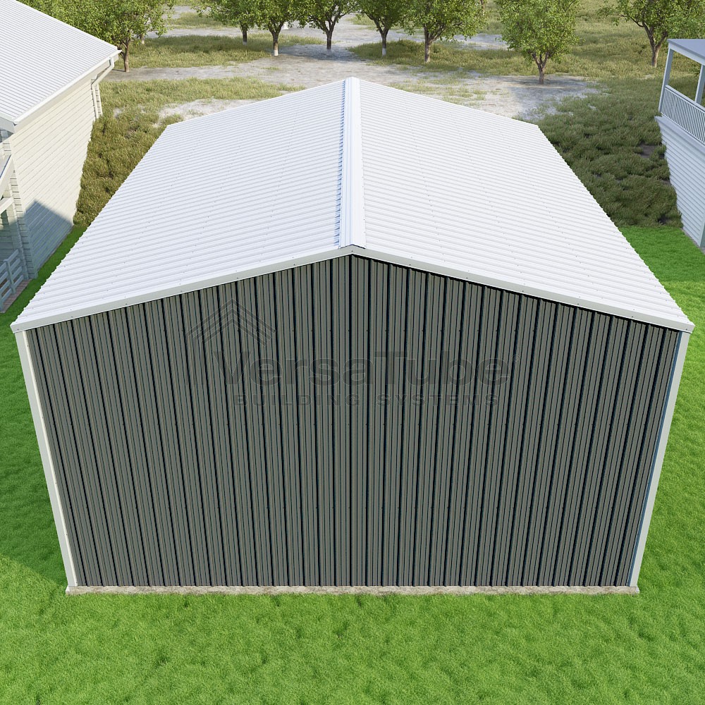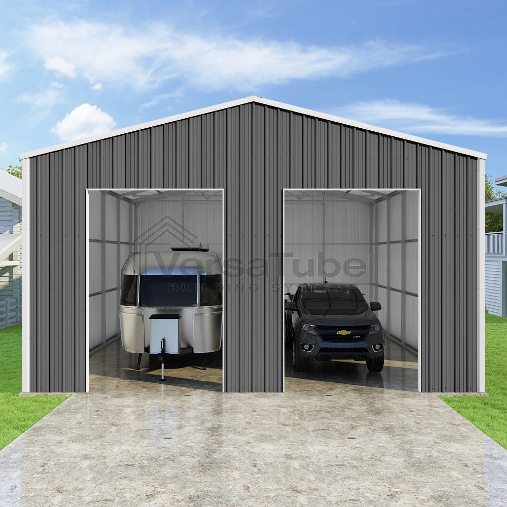 Summit Series DIY garage kit features vertical sheet metal roof and siding panels for a consistent look.