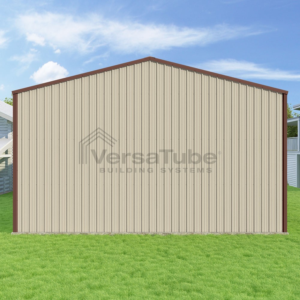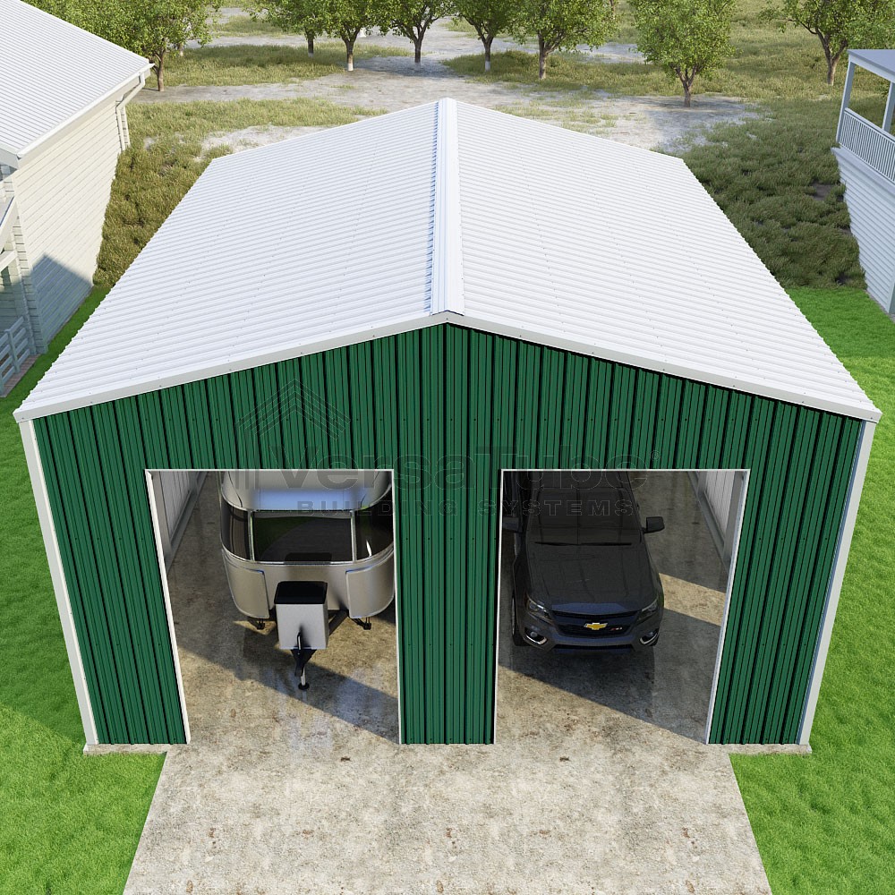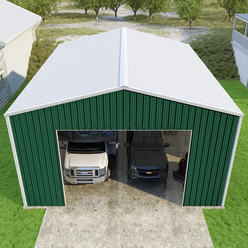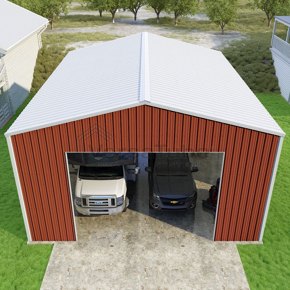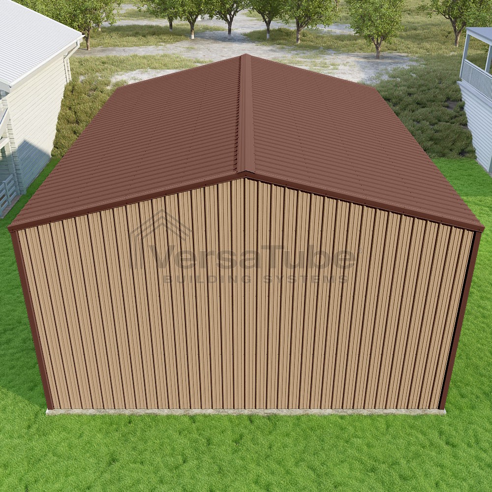 Summit Series DIY garage kit features vertical sheet metal roof and siding panels for a consistent look.