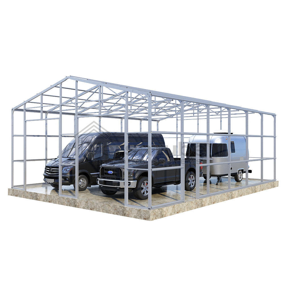 Summit Series DIY garage frame kit includes roof purlins and side girts for applying vertical sheet metal panels or other roofing or siding materials.
