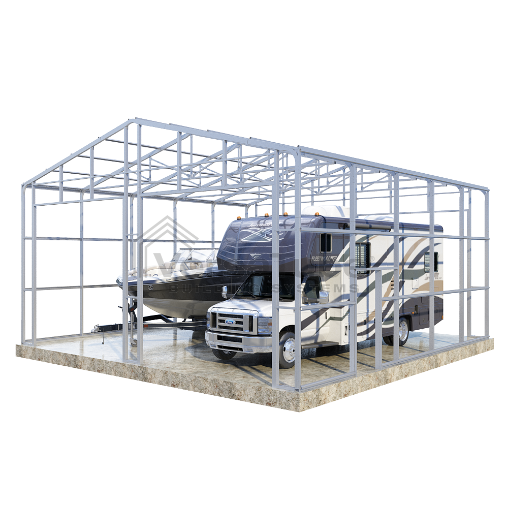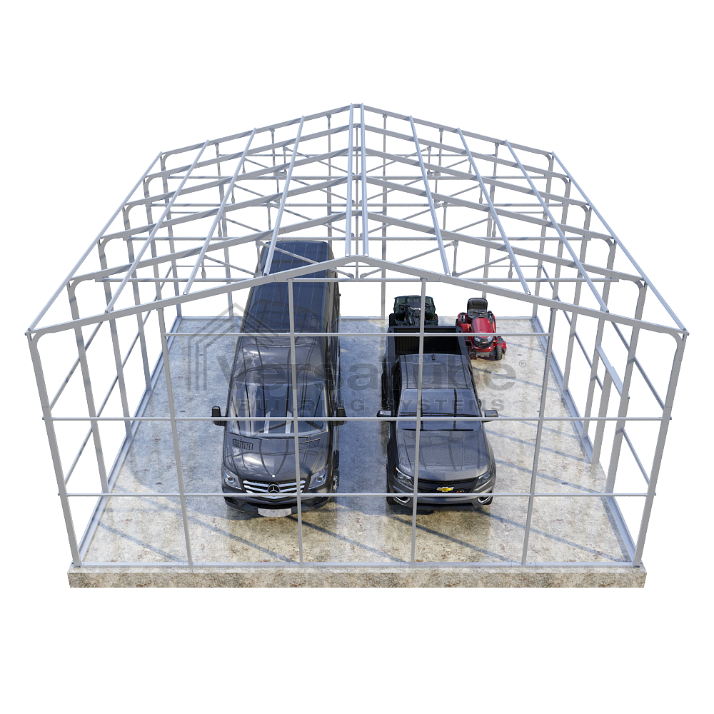 Summit Series DIY garage frame kit includes roof purlins and side girts for applying vertical sheet metal panels or other roofing or siding materials.