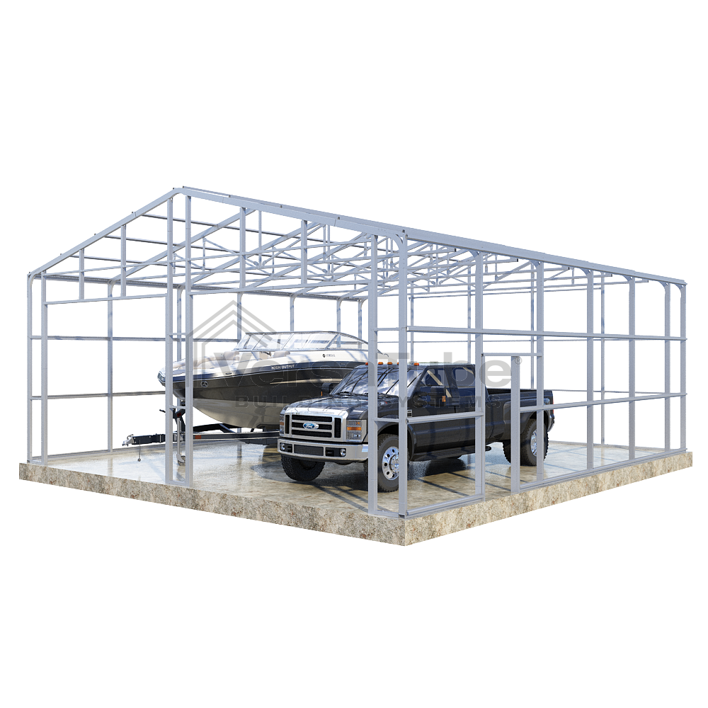 Summit Series DIY garage frame kit includes roof purlins and side girts for applying vertical sheet metal panels or other roofing or siding materials.