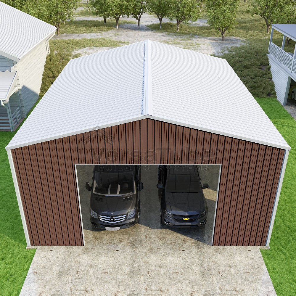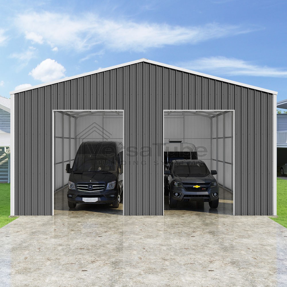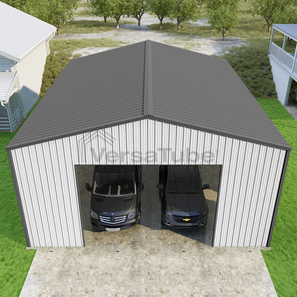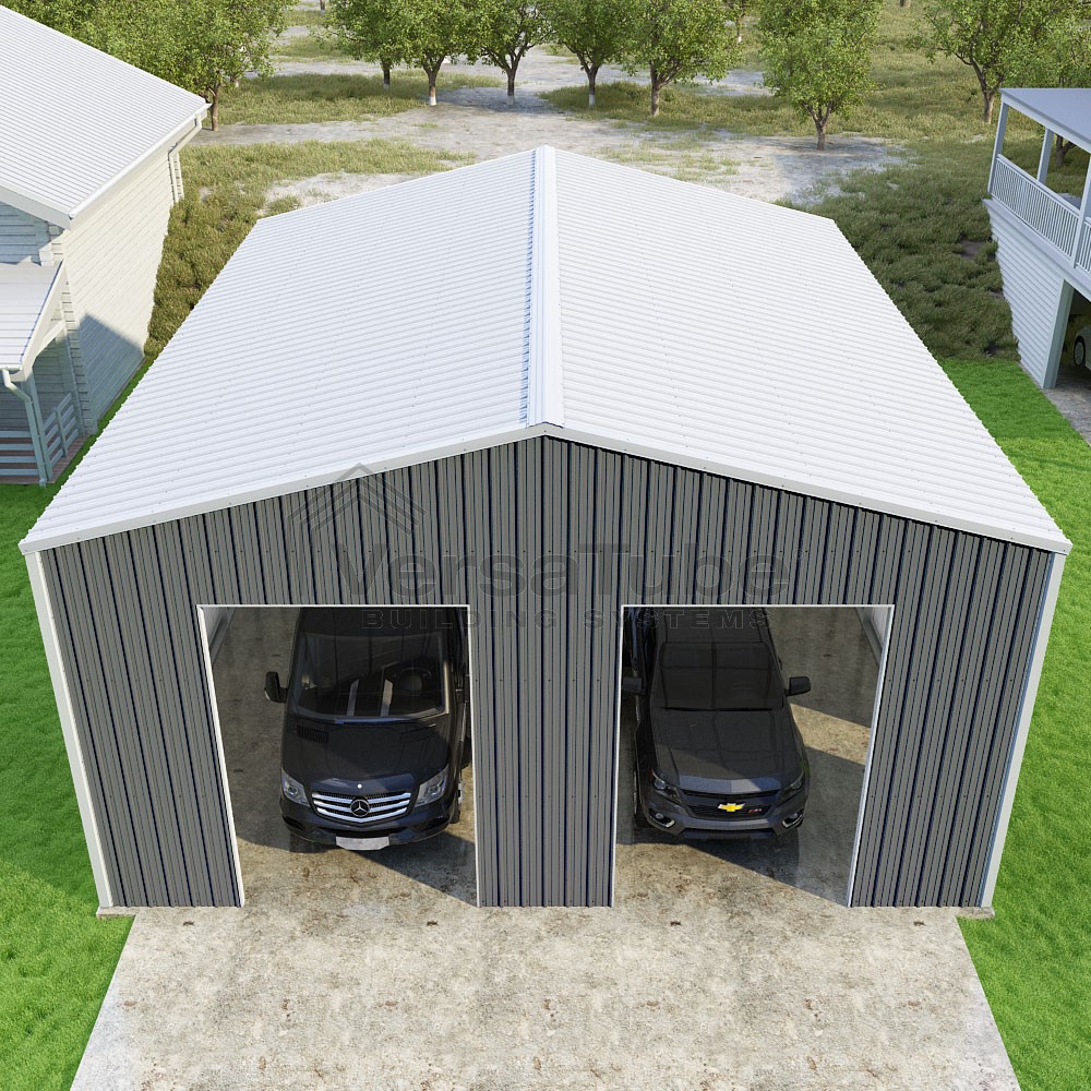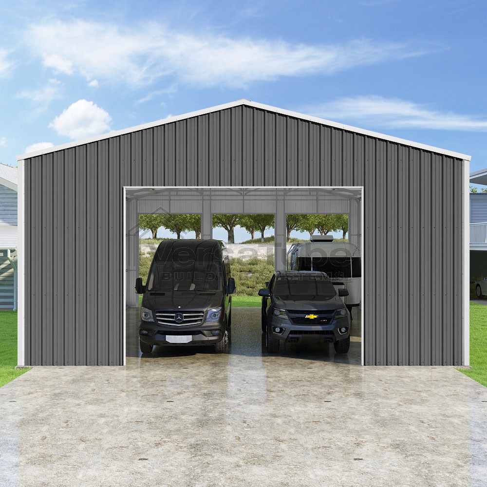 Summit Series DIY garage kit features vertical sheet metal roof and siding panels for a consistent look.