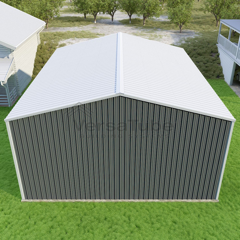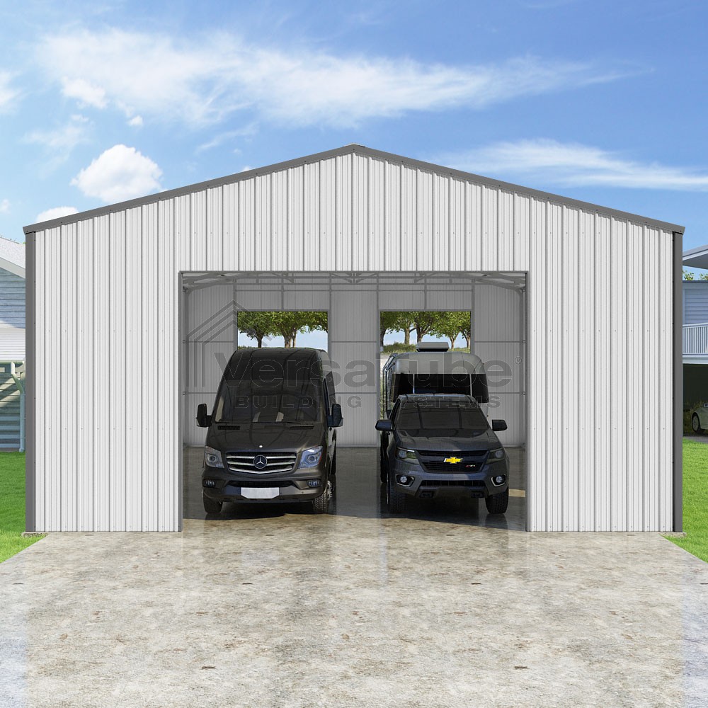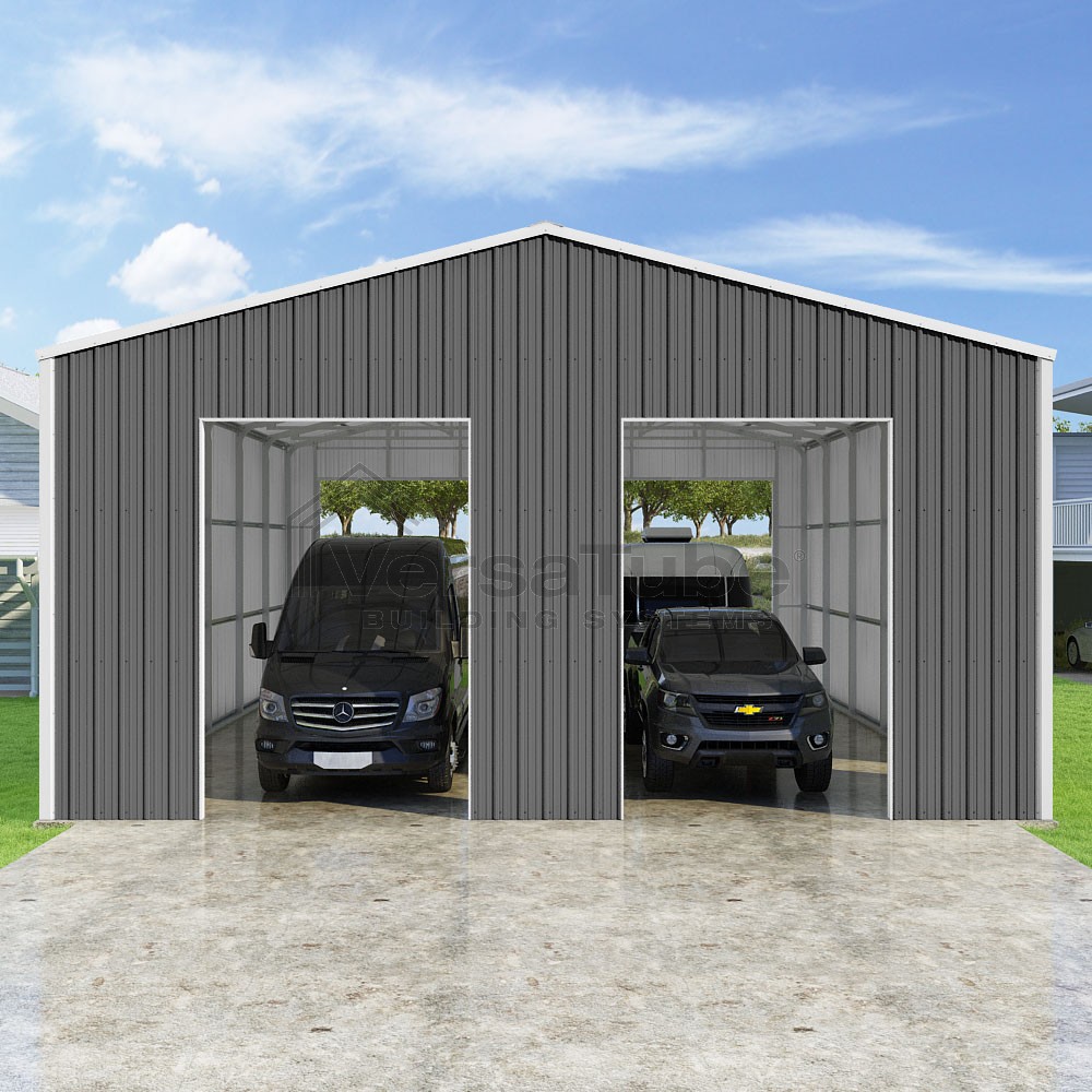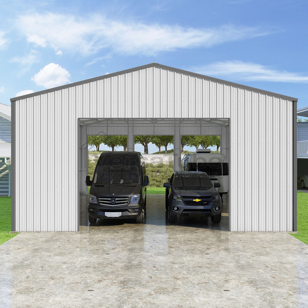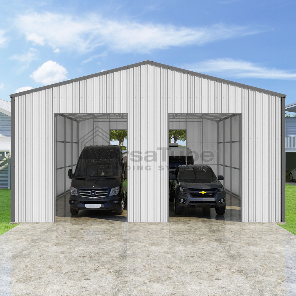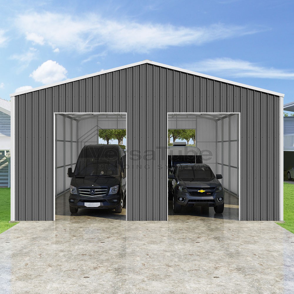 Summit Series DIY garage kit features vertical sheet metal roof and siding panels for a consistent look.