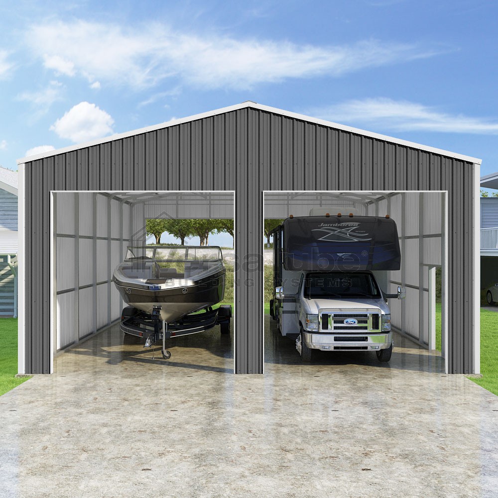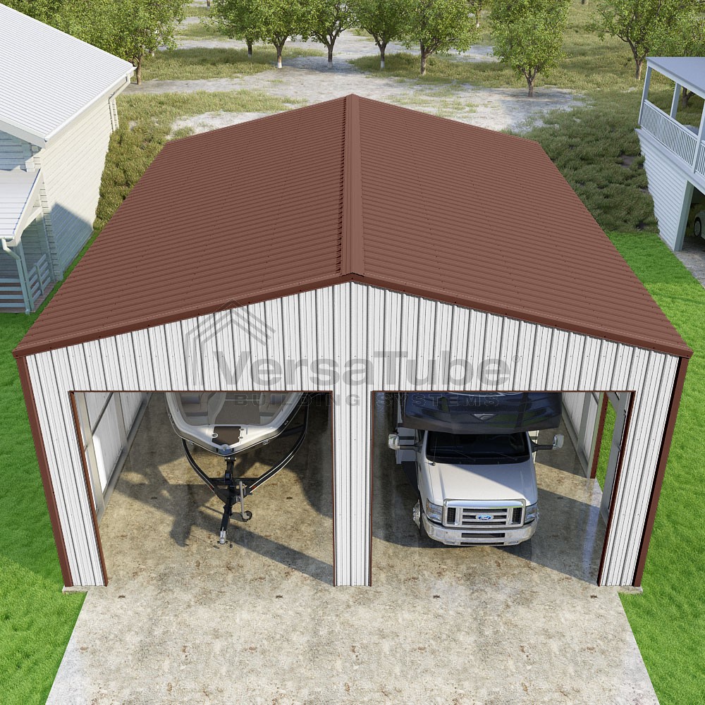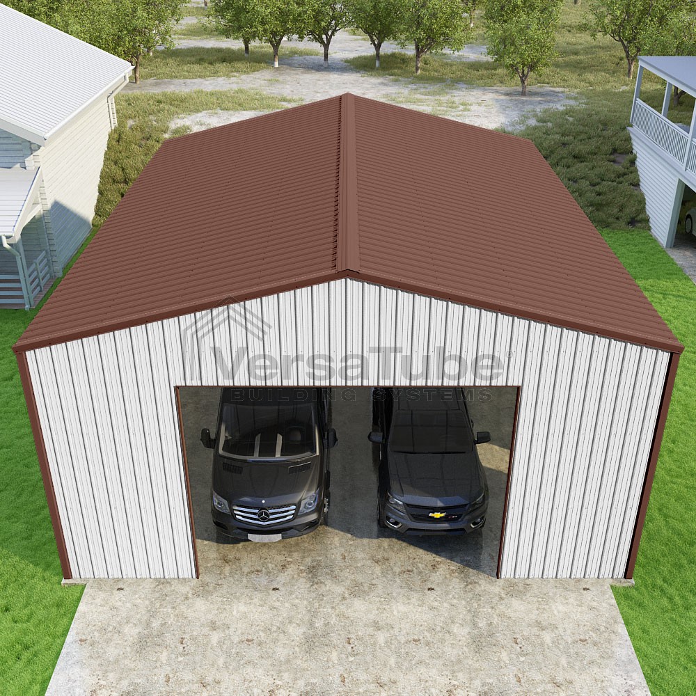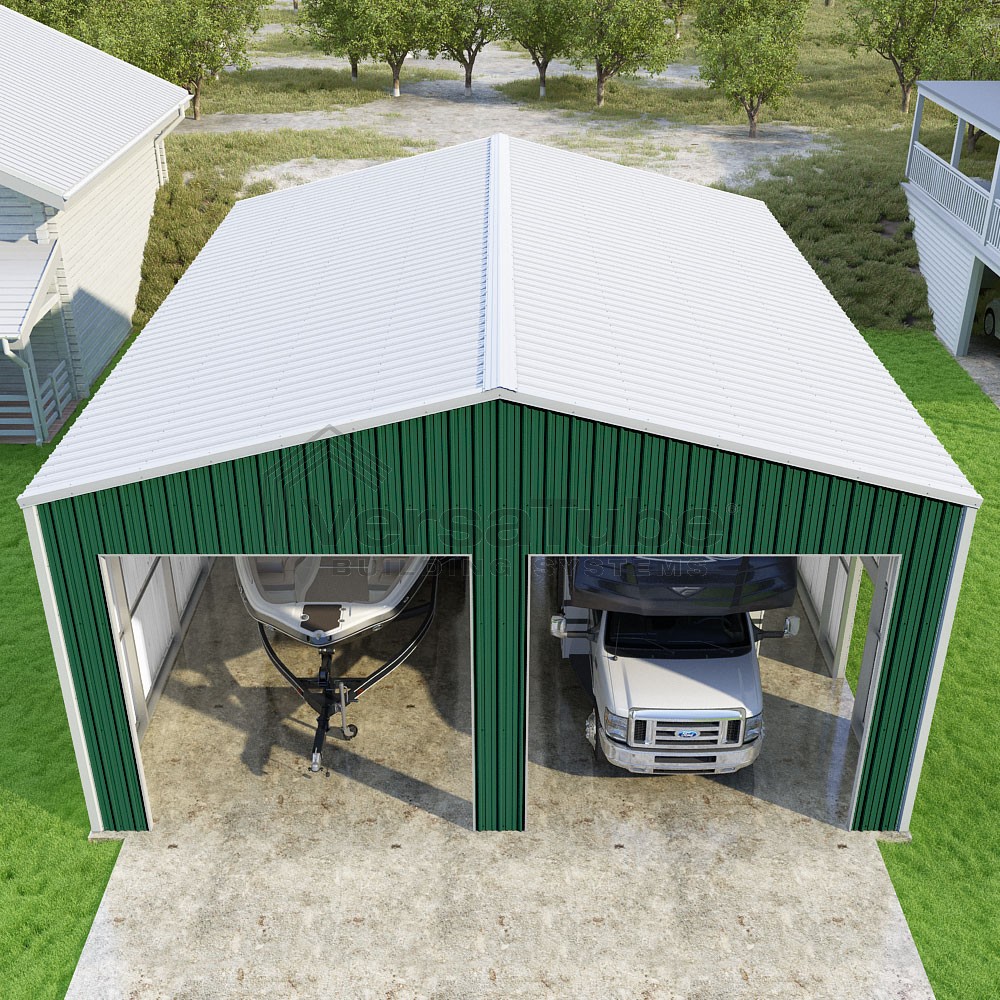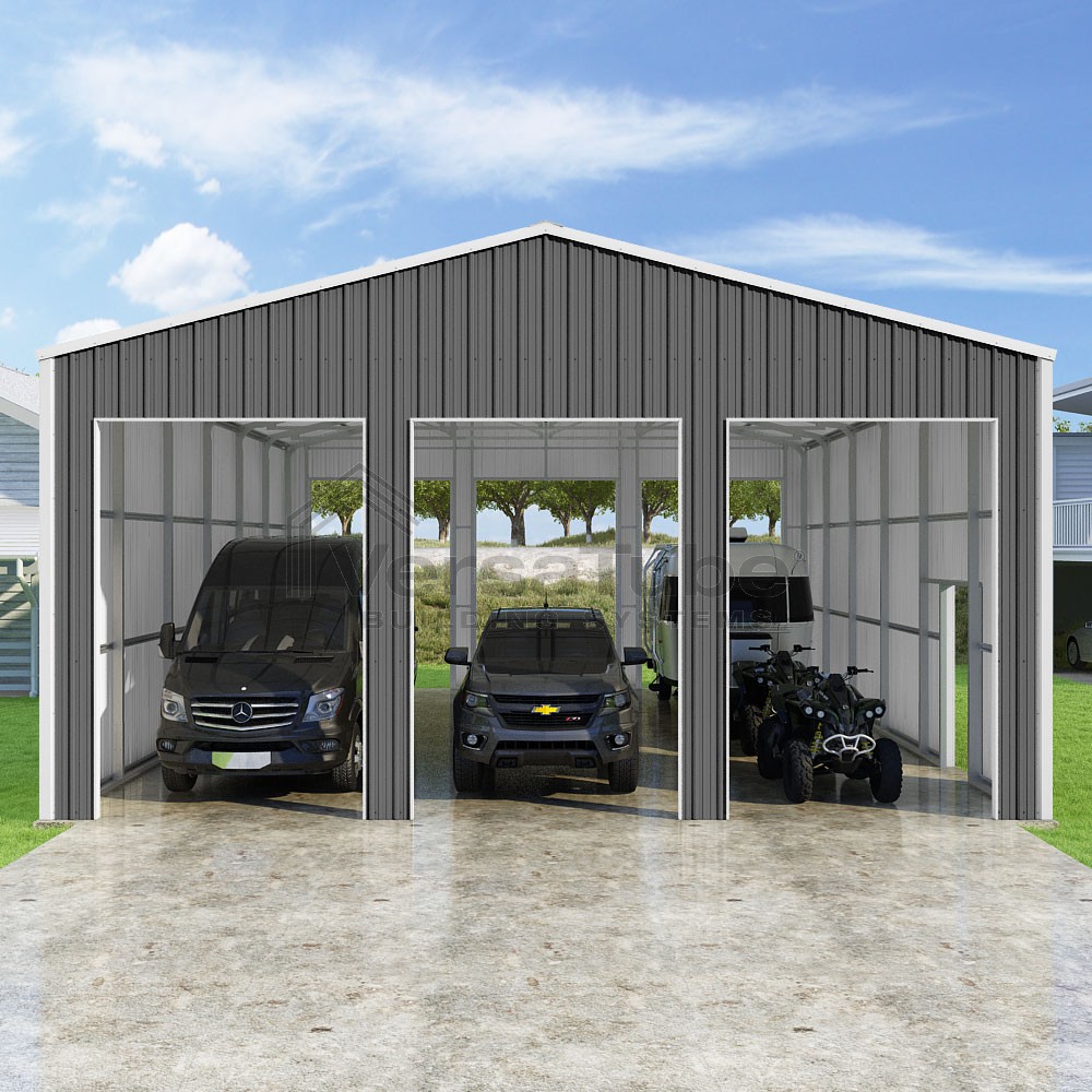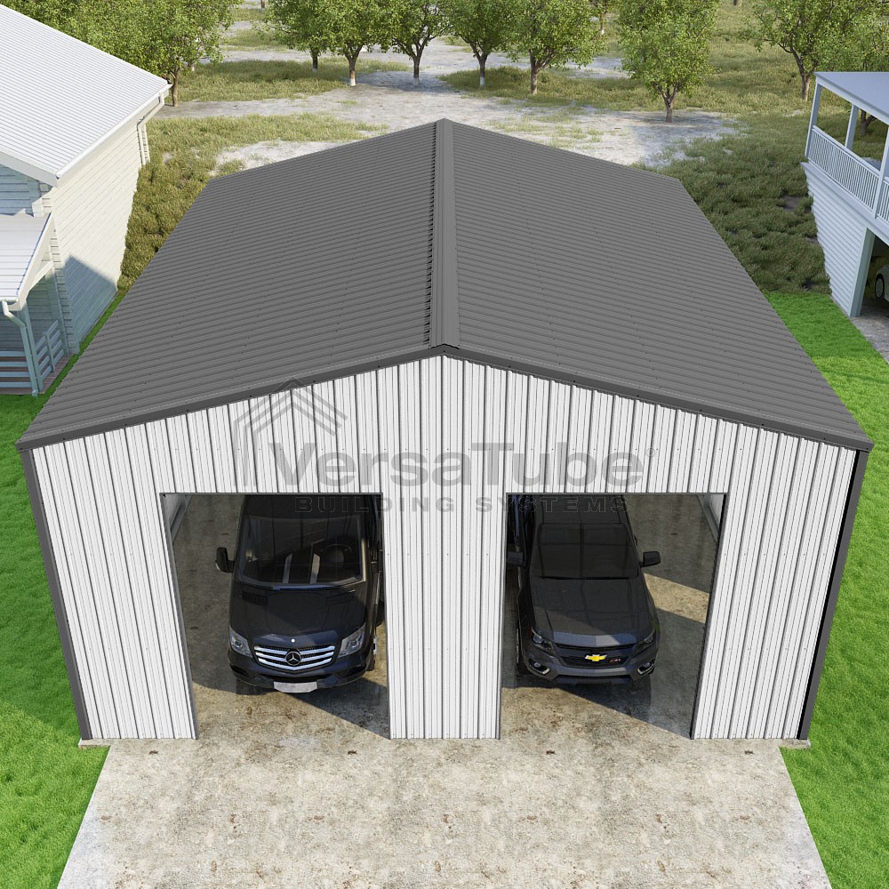 Summit Series DIY garage kit features vertical sheet metal roof and siding panels for a consistent look.