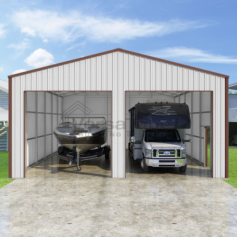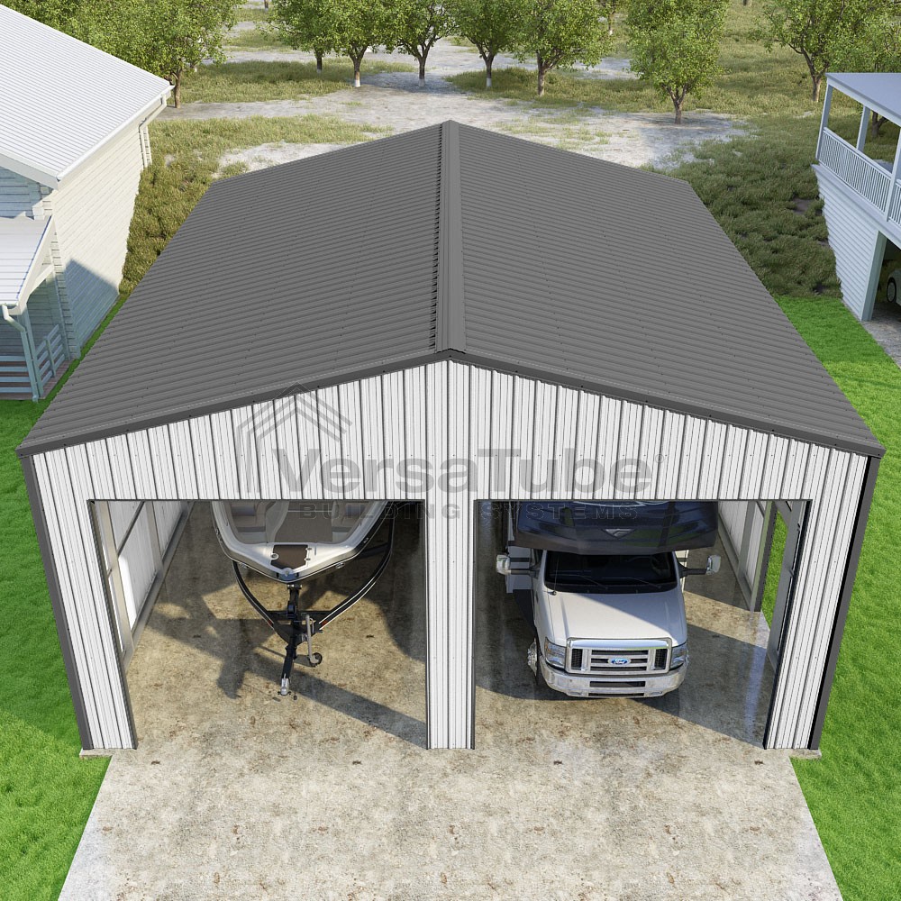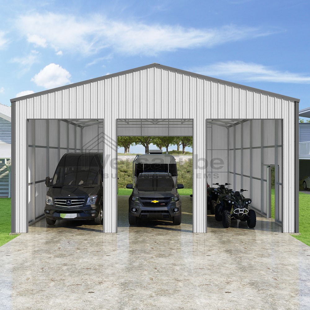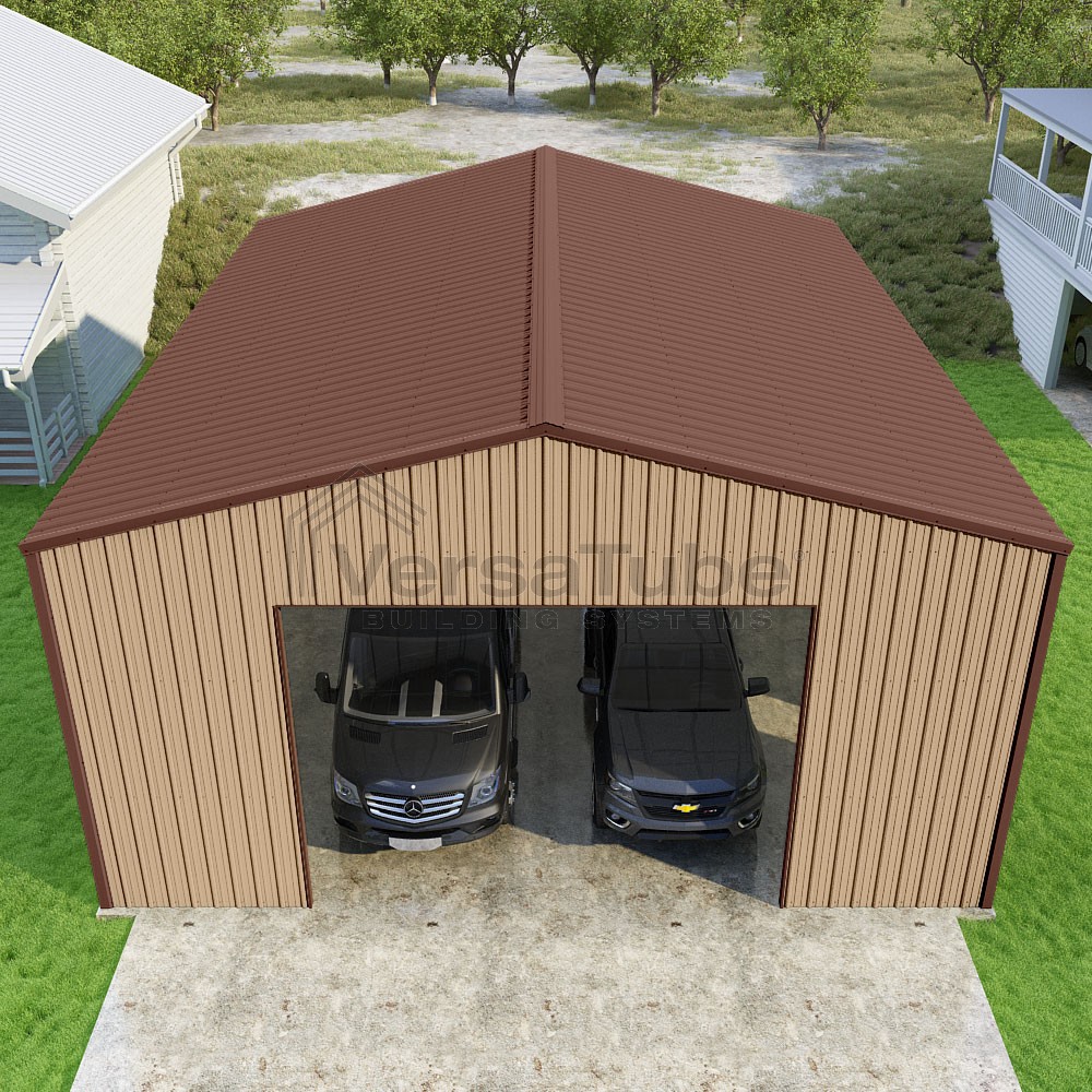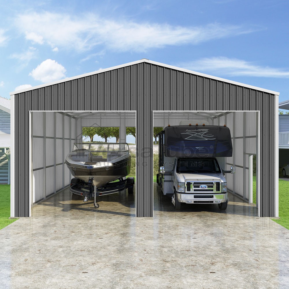 Summit Series DIY garage kit features vertical sheet metal roof and siding panels for a consistent look.
