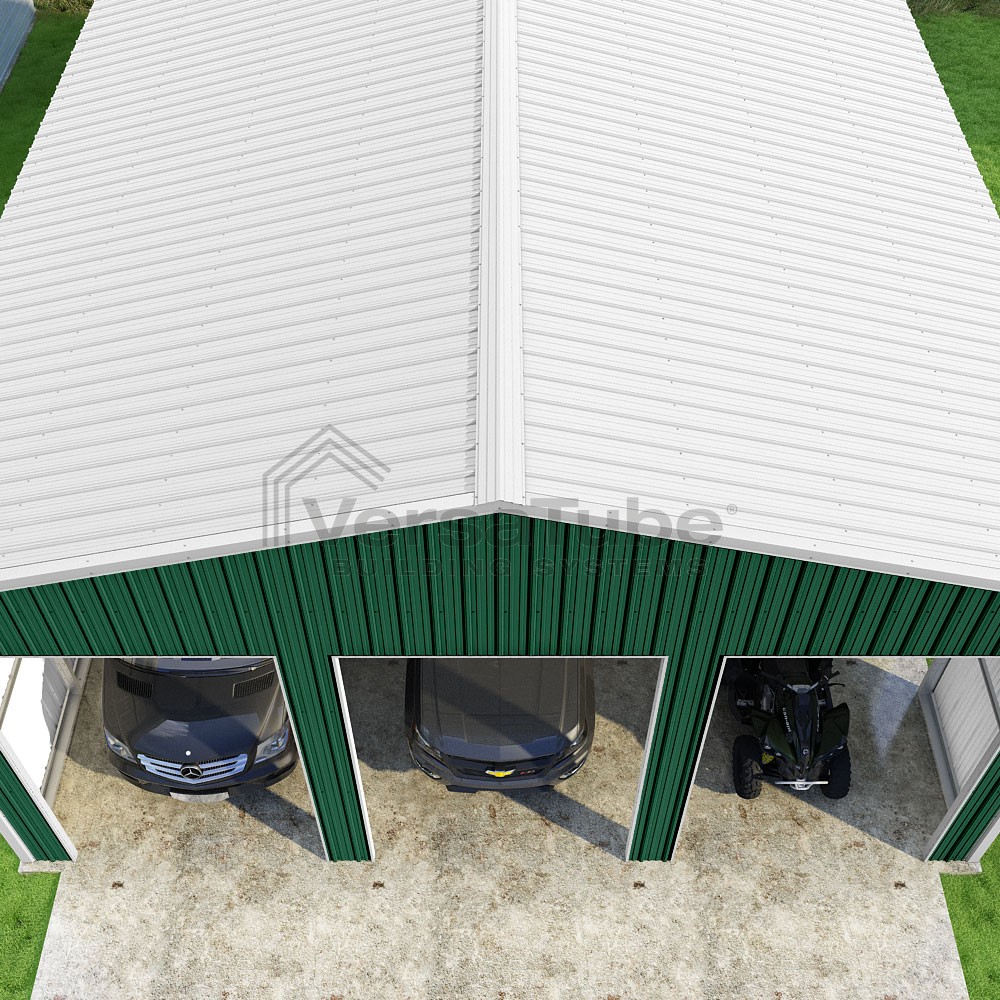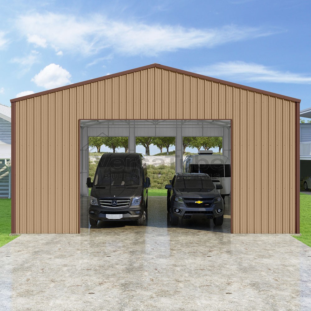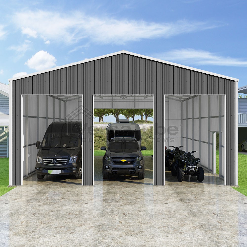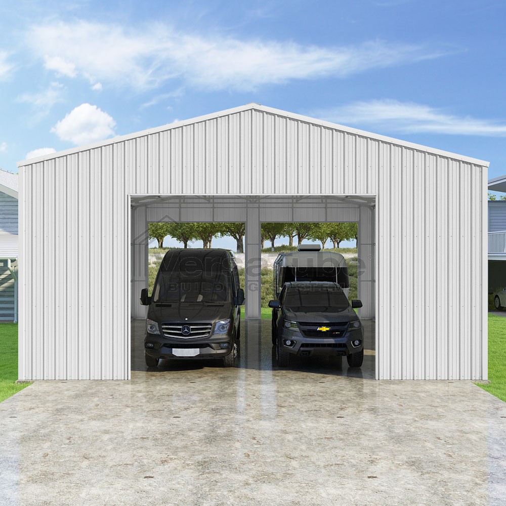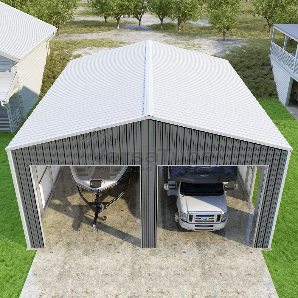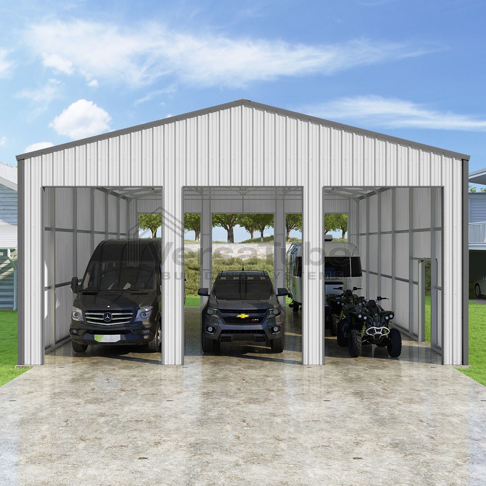 Summit Series DIY garage kit features vertical sheet metal roof and siding panels for a consistent look.