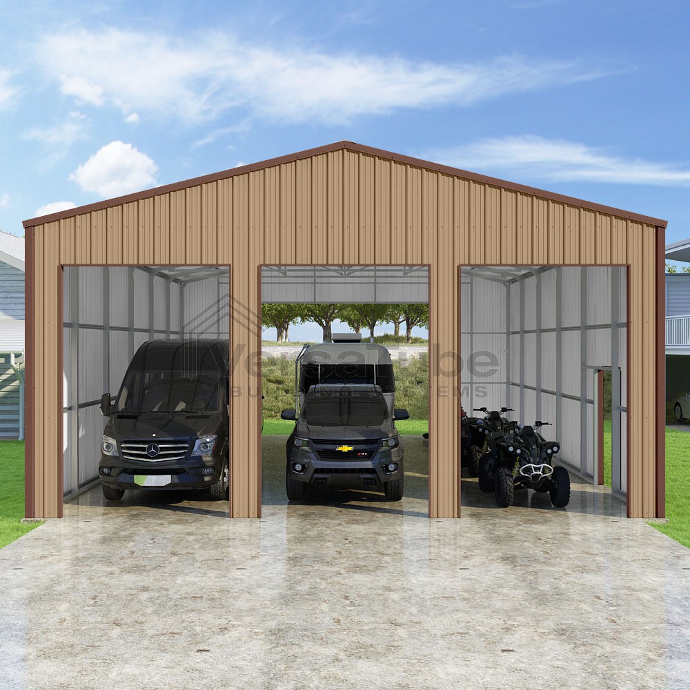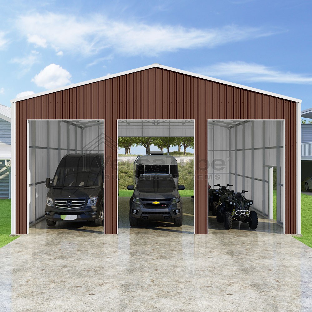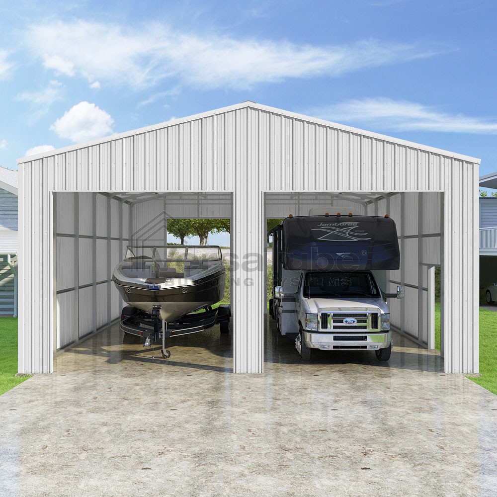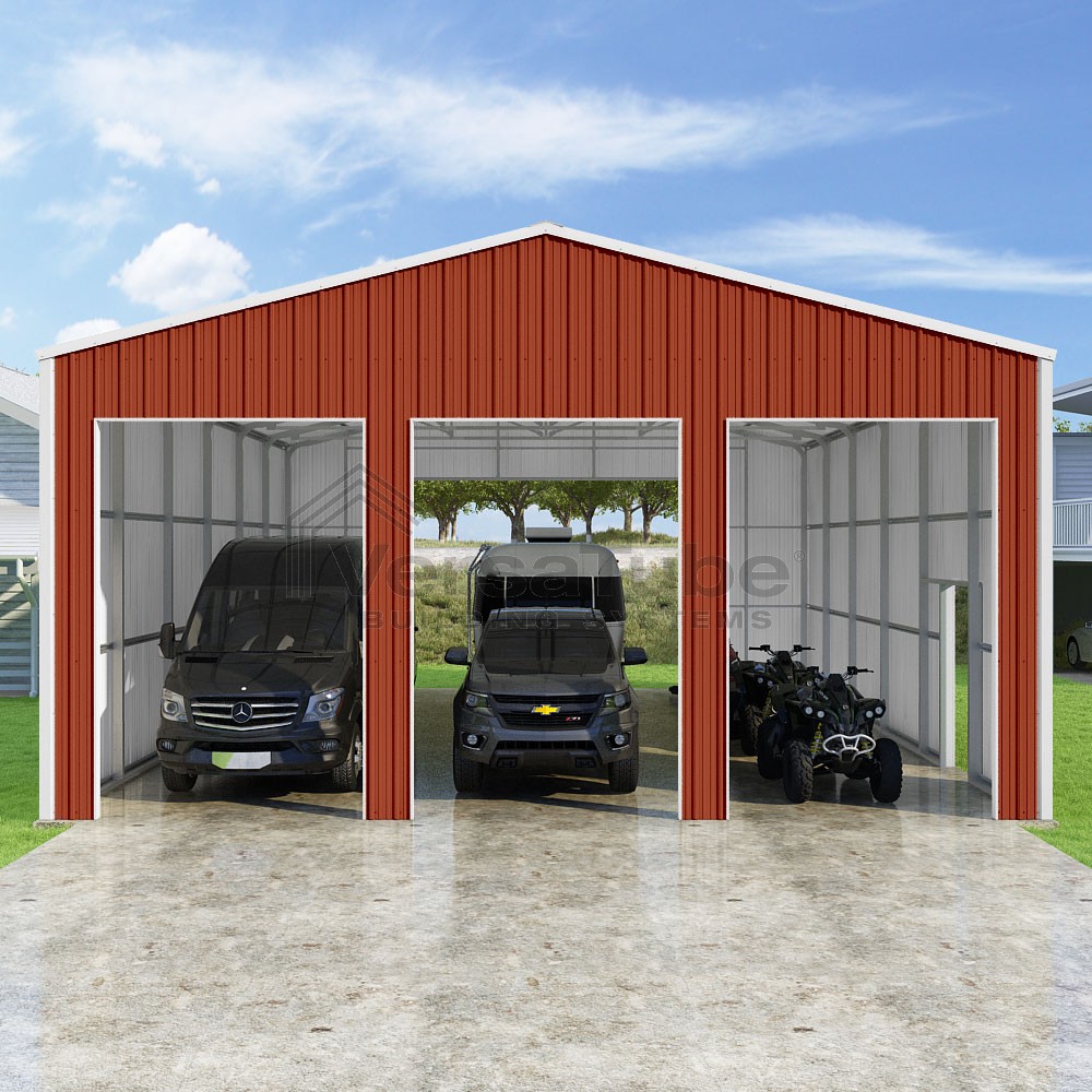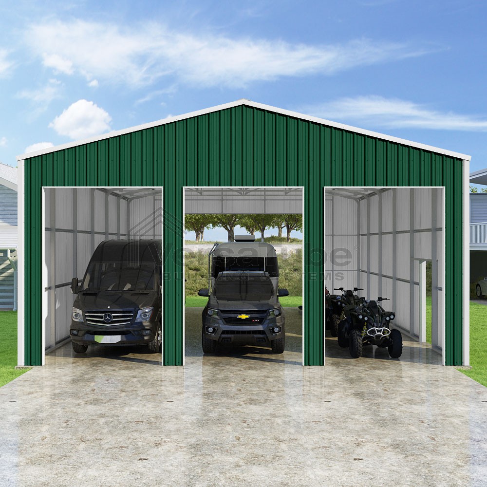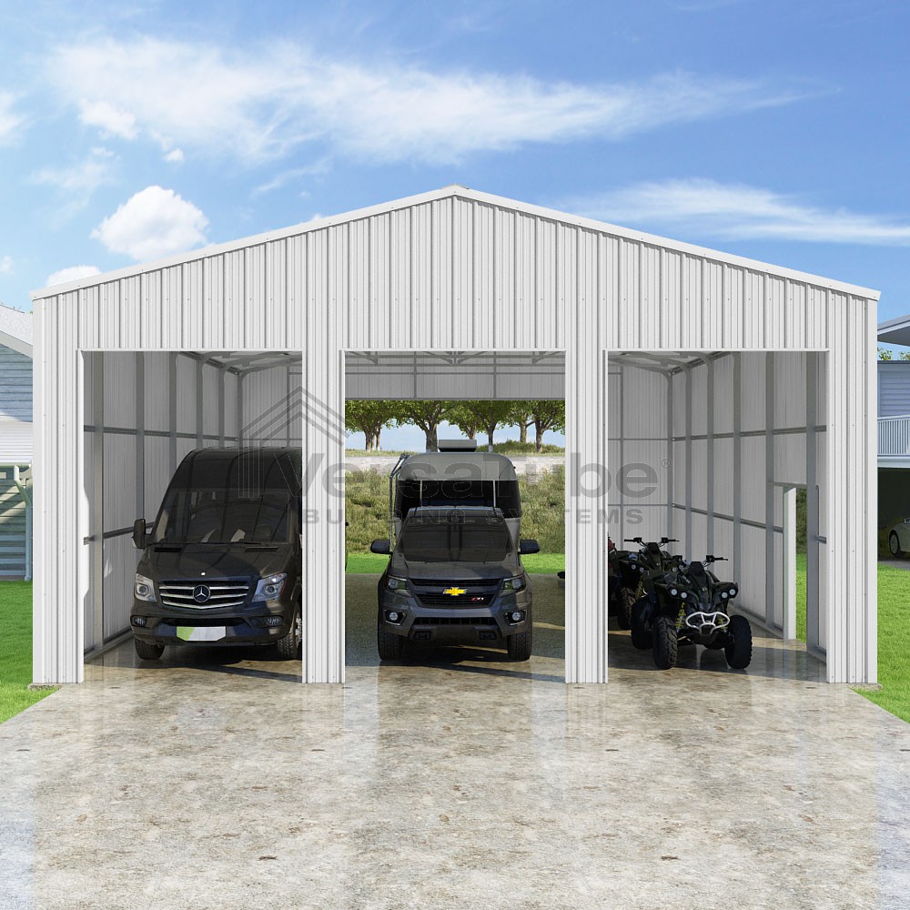 Summit Series DIY garage kit features vertical sheet metal roof and siding panels for a consistent look.