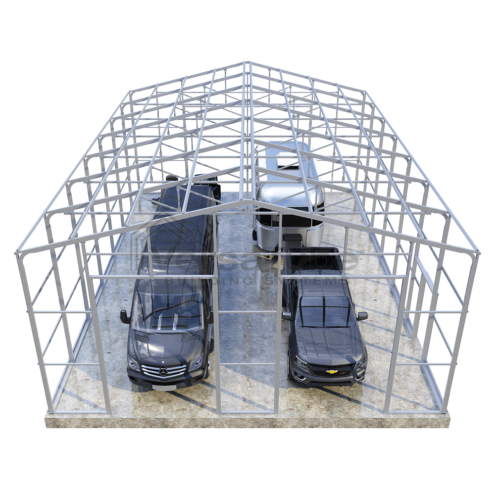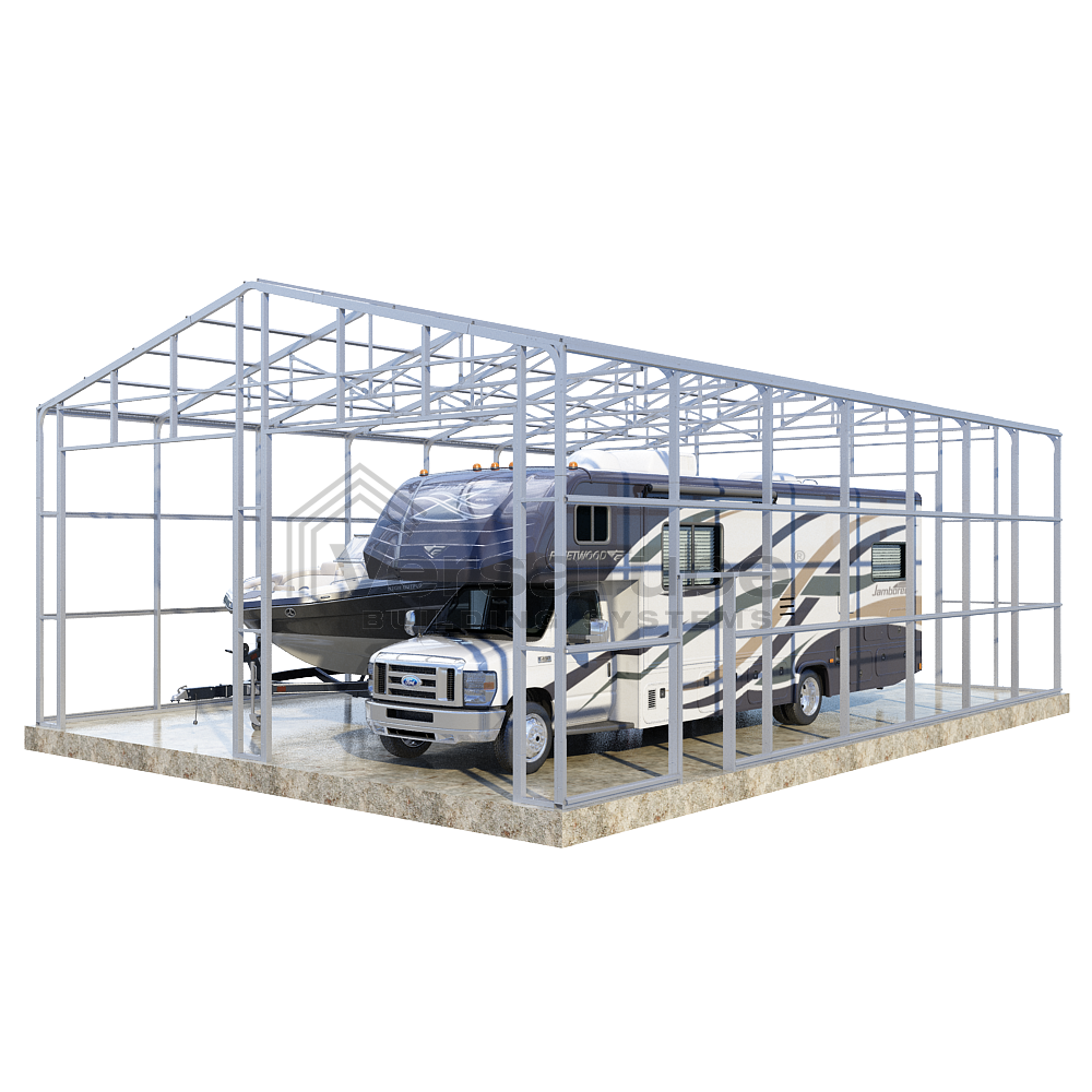 Summit Series DIY garage frame kit includes roof purlins and side girts for applying vertical sheet metal panels or other roofing or siding materials.