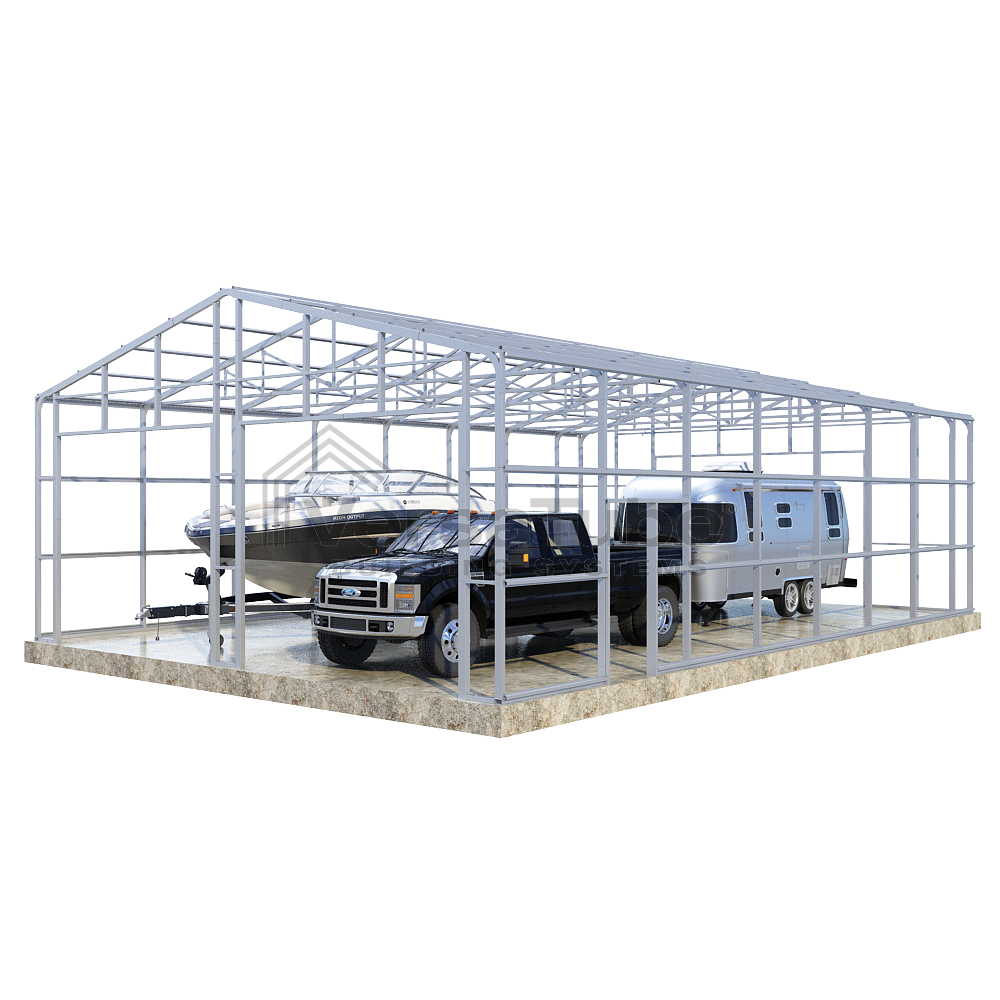 Summit Series DIY garage frame kit includes roof purlins and side girts for applying vertical sheet metal panels or other roofing or siding materials.