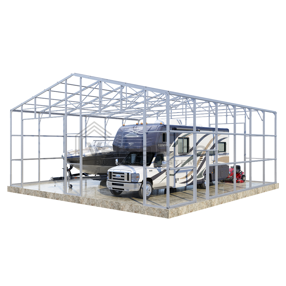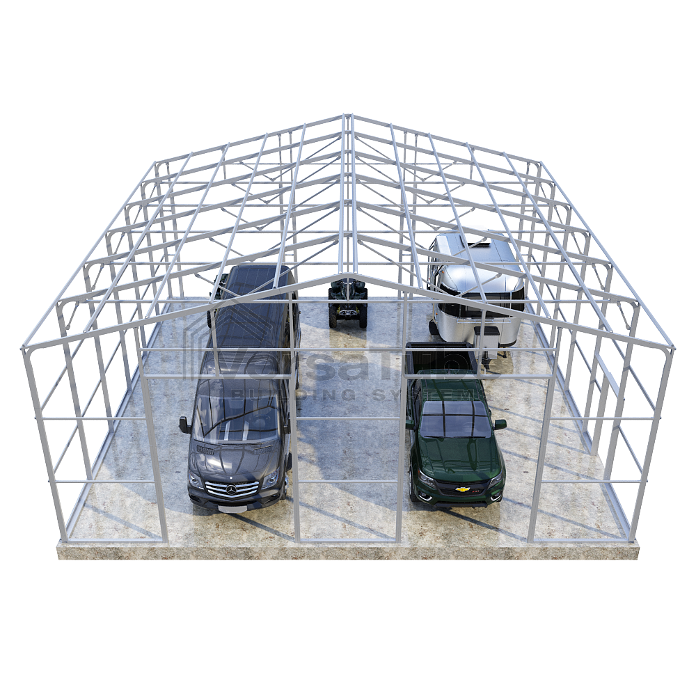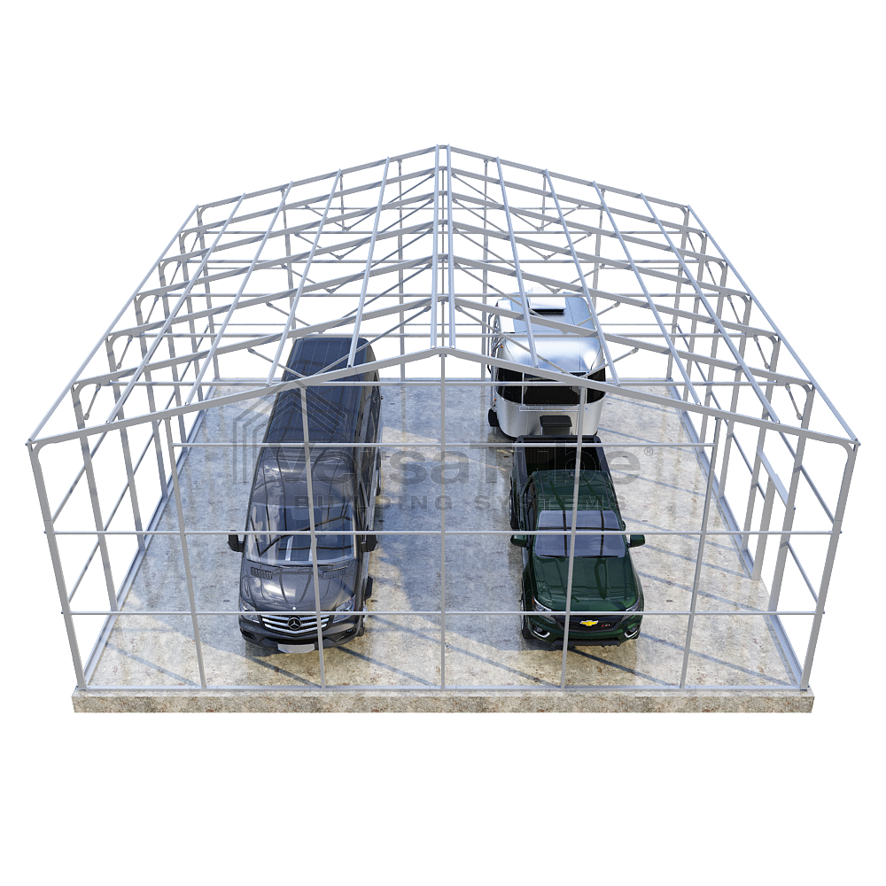 Summit Series DIY garage frame kit includes roof purlins and side girts for applying vertical sheet metal panels or other roofing or siding materials.