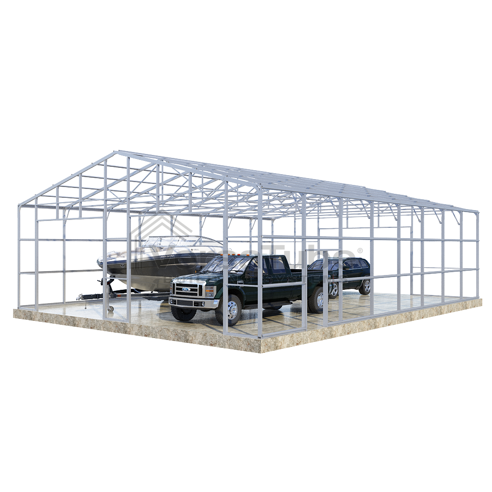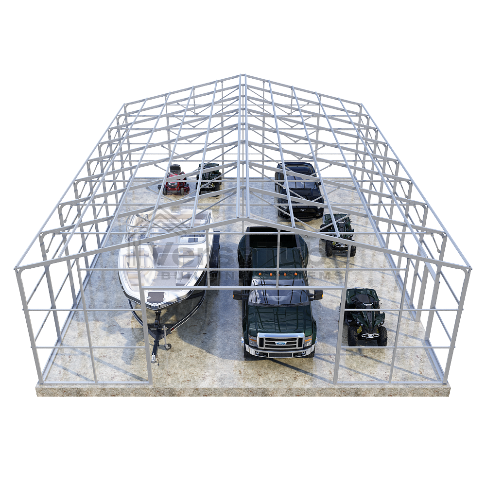 Summit Series DIY garage frame kit includes roof purlins and side girts for applying vertical sheet metal panels or other roofing or siding materials.