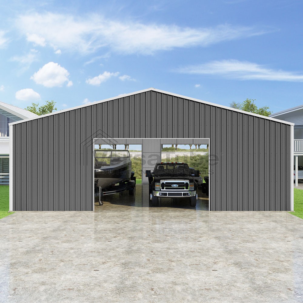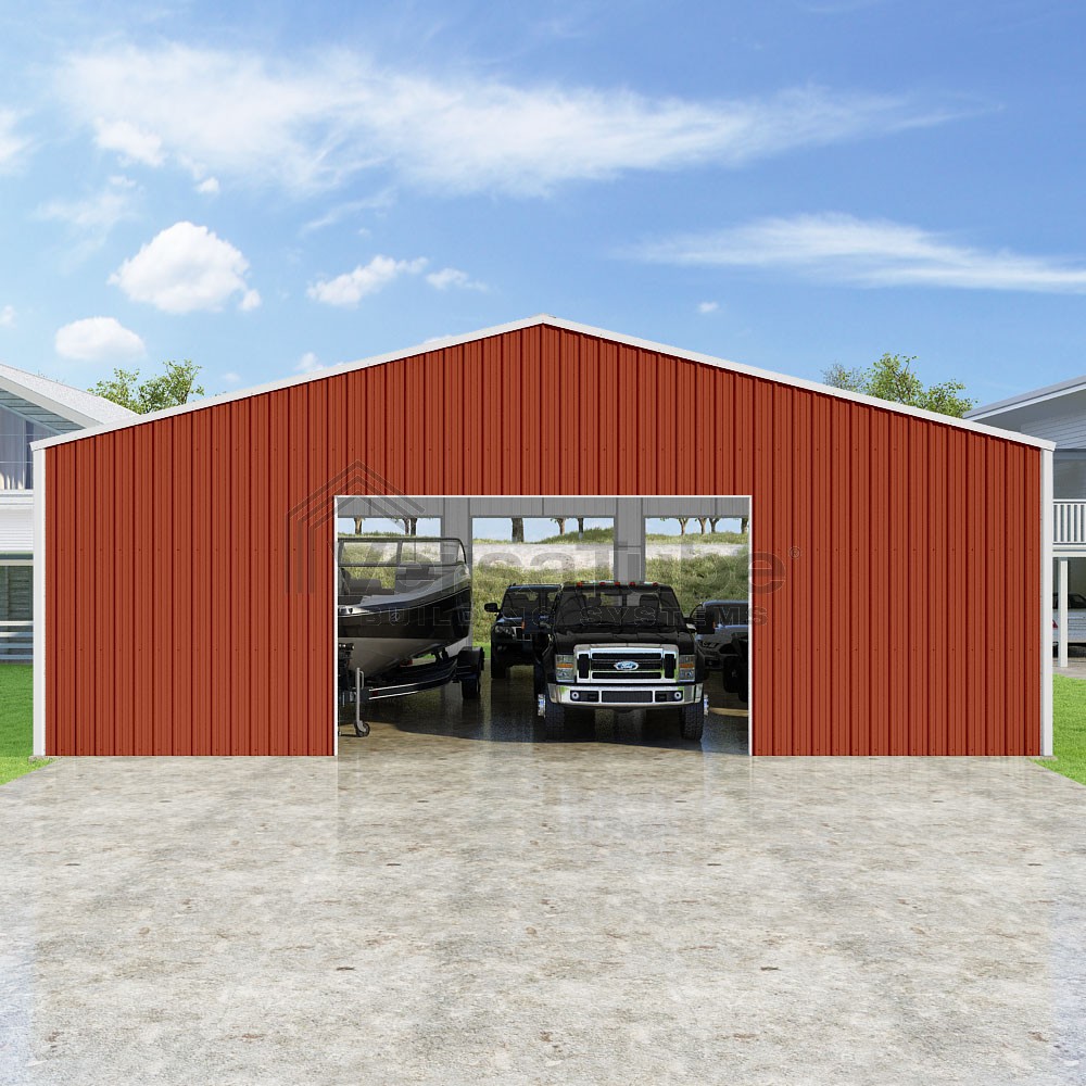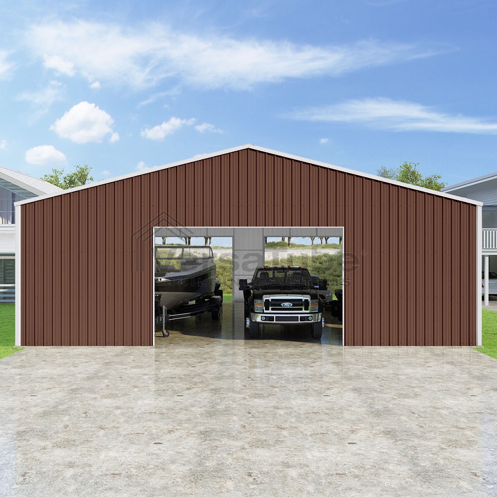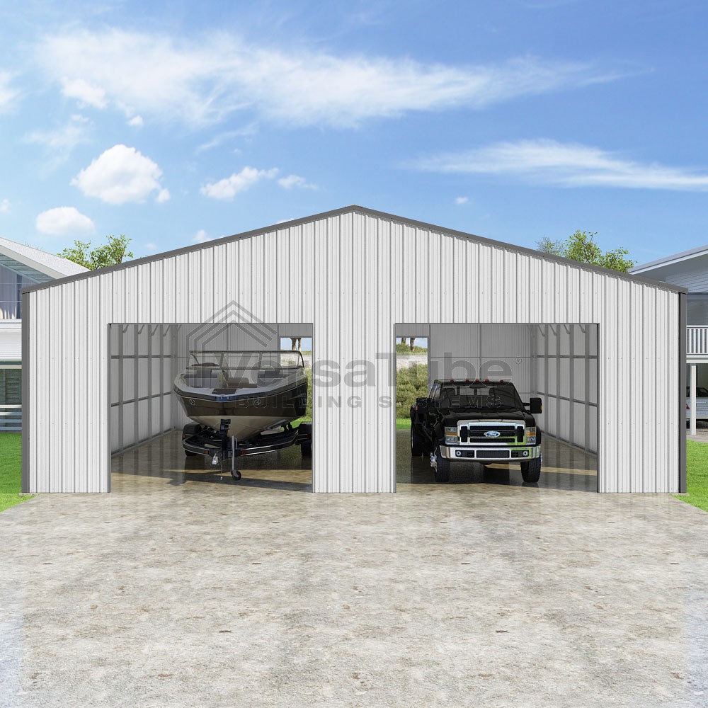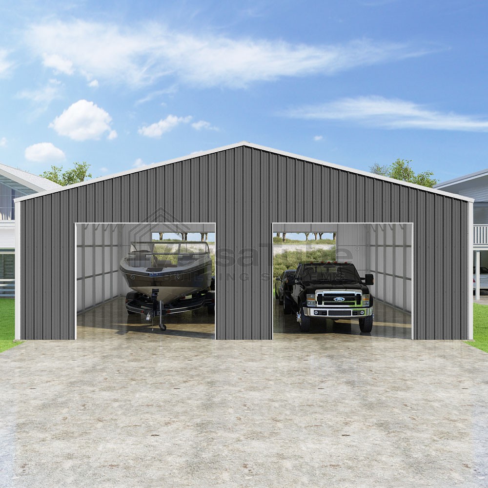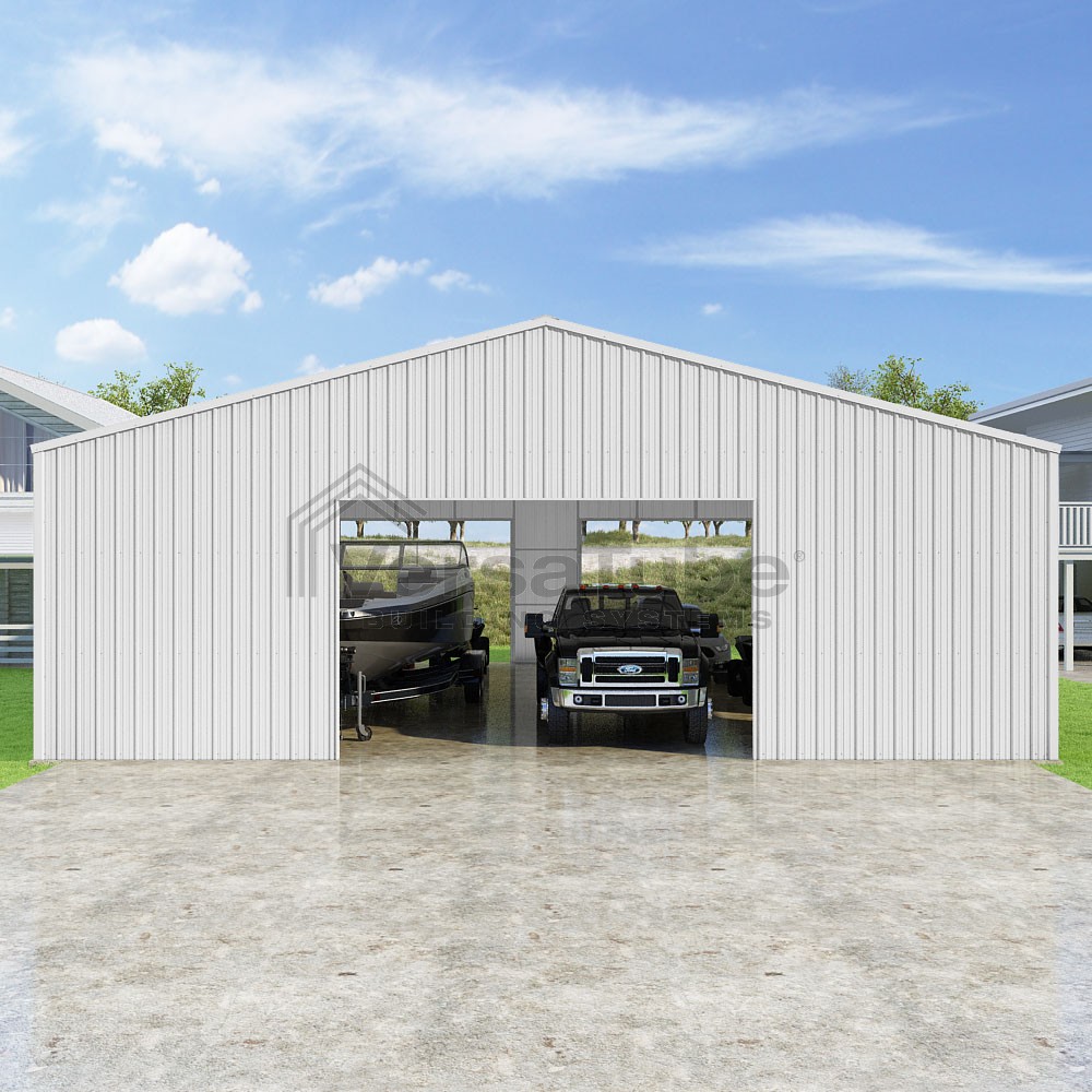 Summit Series DIY garage kit features vertical sheet metal roof and siding panels for a consistent look.