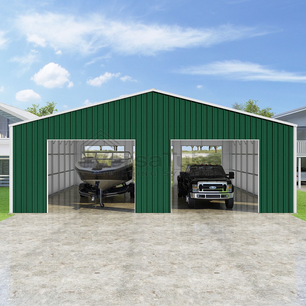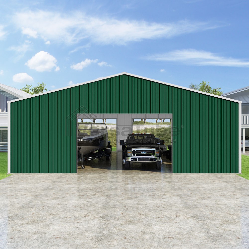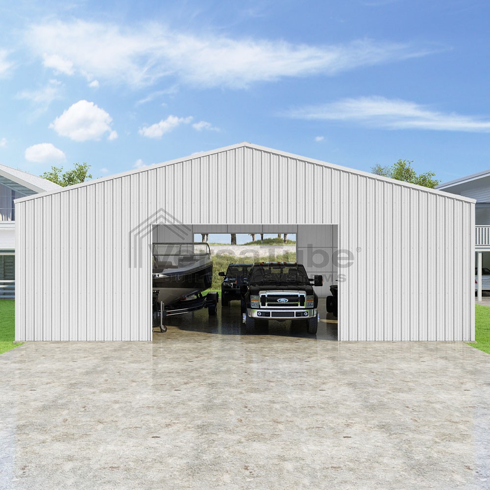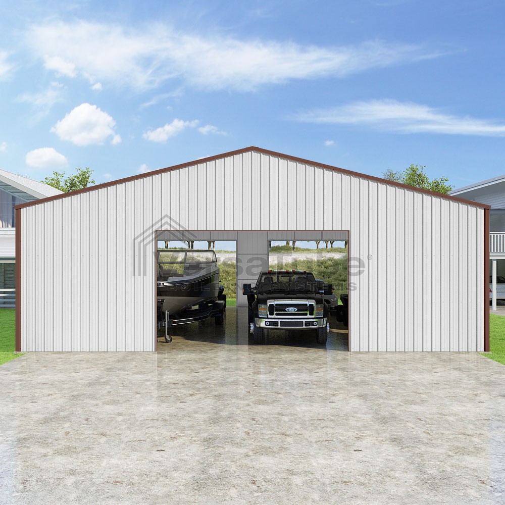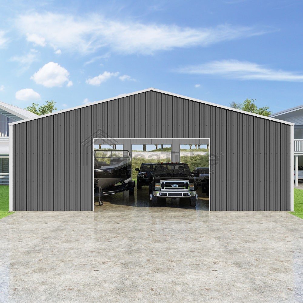 Summit Series DIY garage kit features vertical sheet metal roof and siding panels for a consistent look.