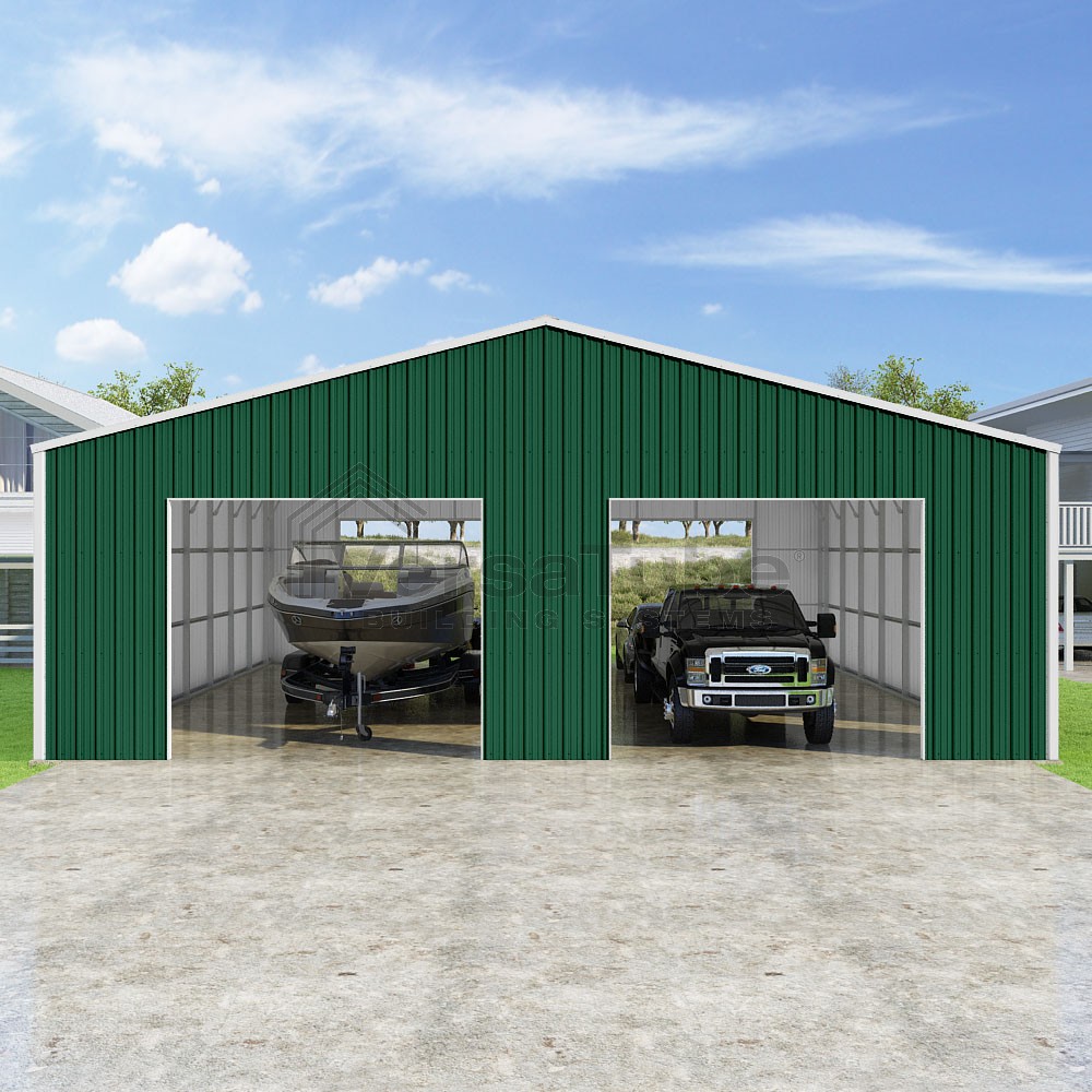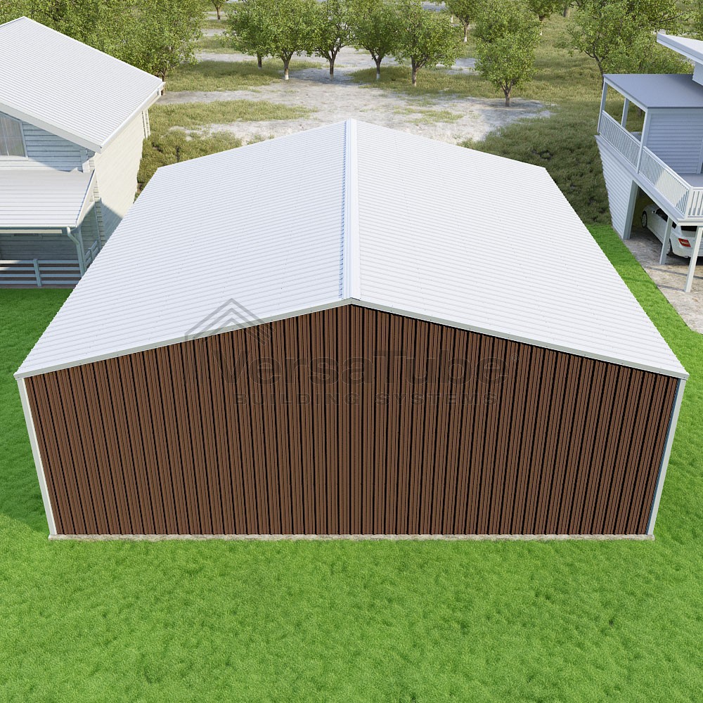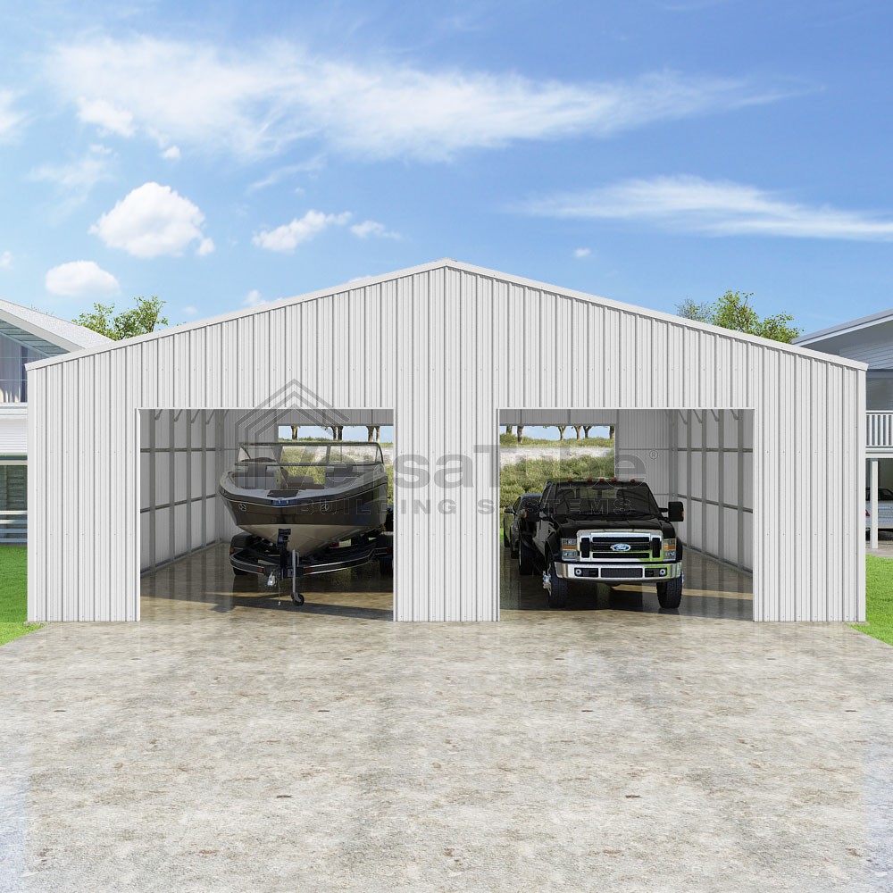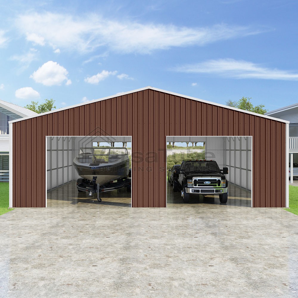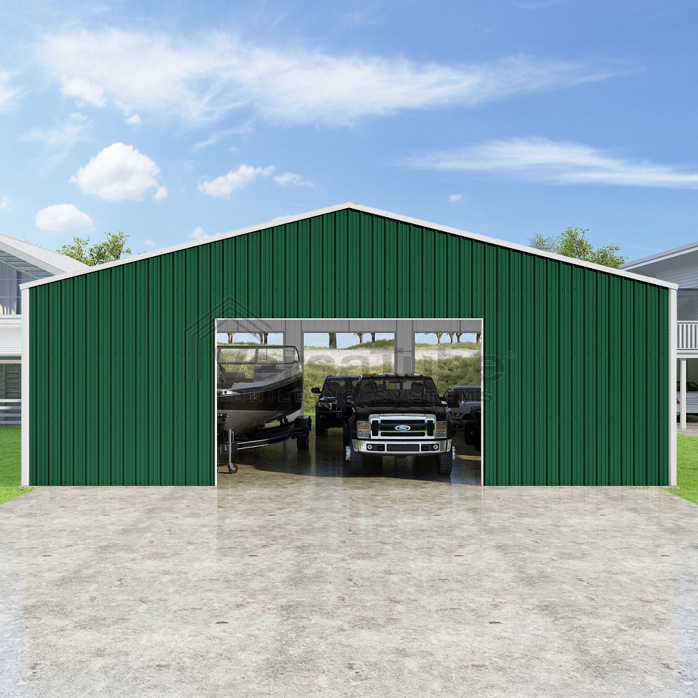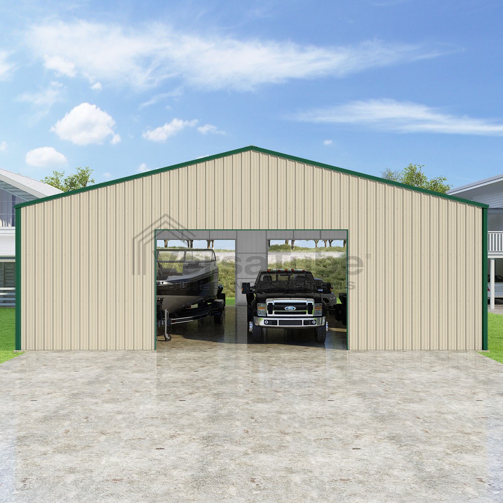 Summit Series DIY garage kit features vertical sheet metal roof and siding panels for a consistent look.