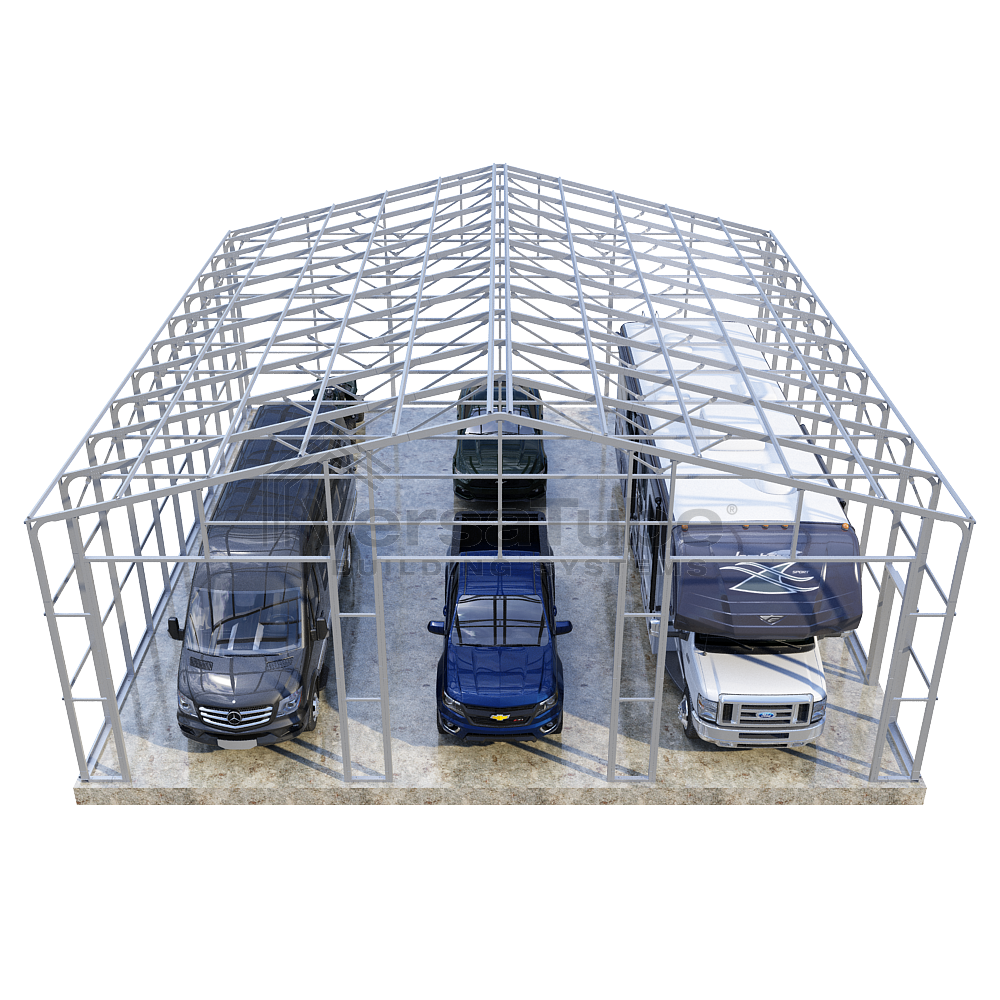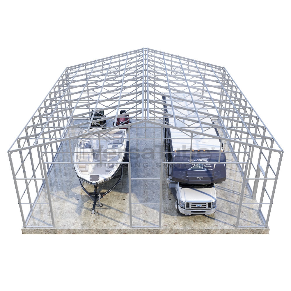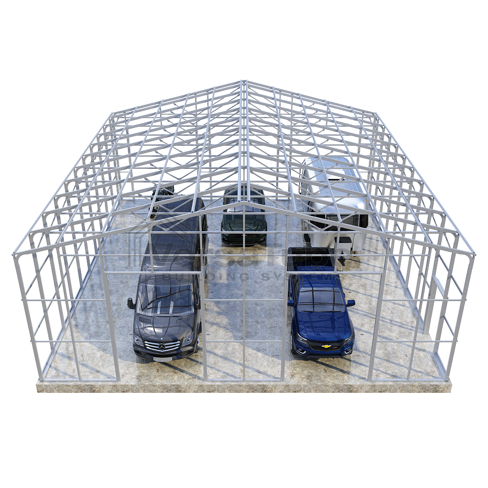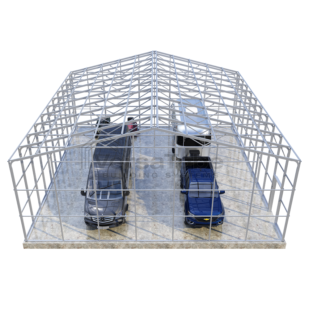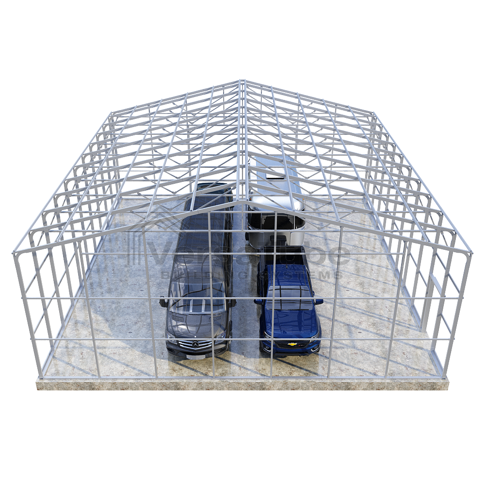 Summit Series DIY garage frame kit includes roof purlins and side girts for applying vertical sheet metal panels or other roofing or siding materials.