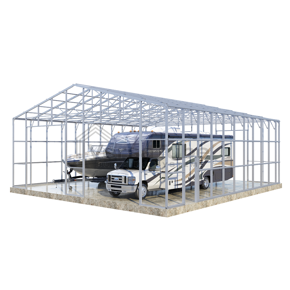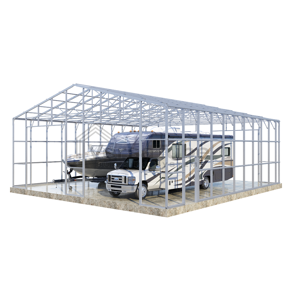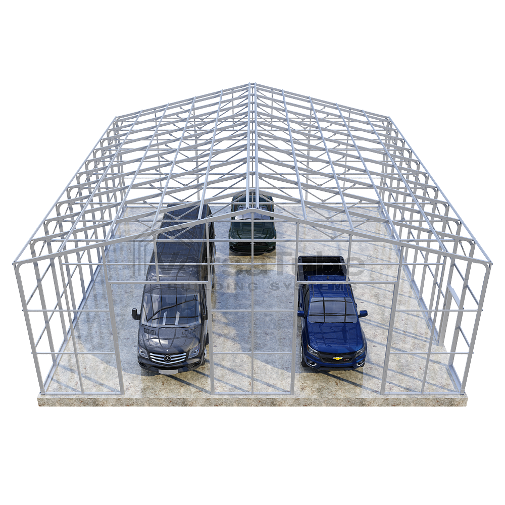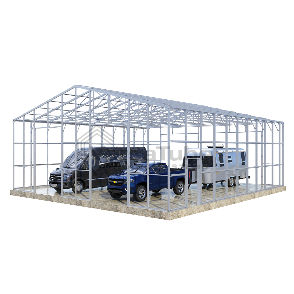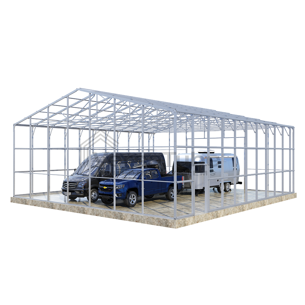 Summit Series DIY garage frame kit includes roof purlins and side girts for applying vertical sheet metal panels or other roofing or siding materials.