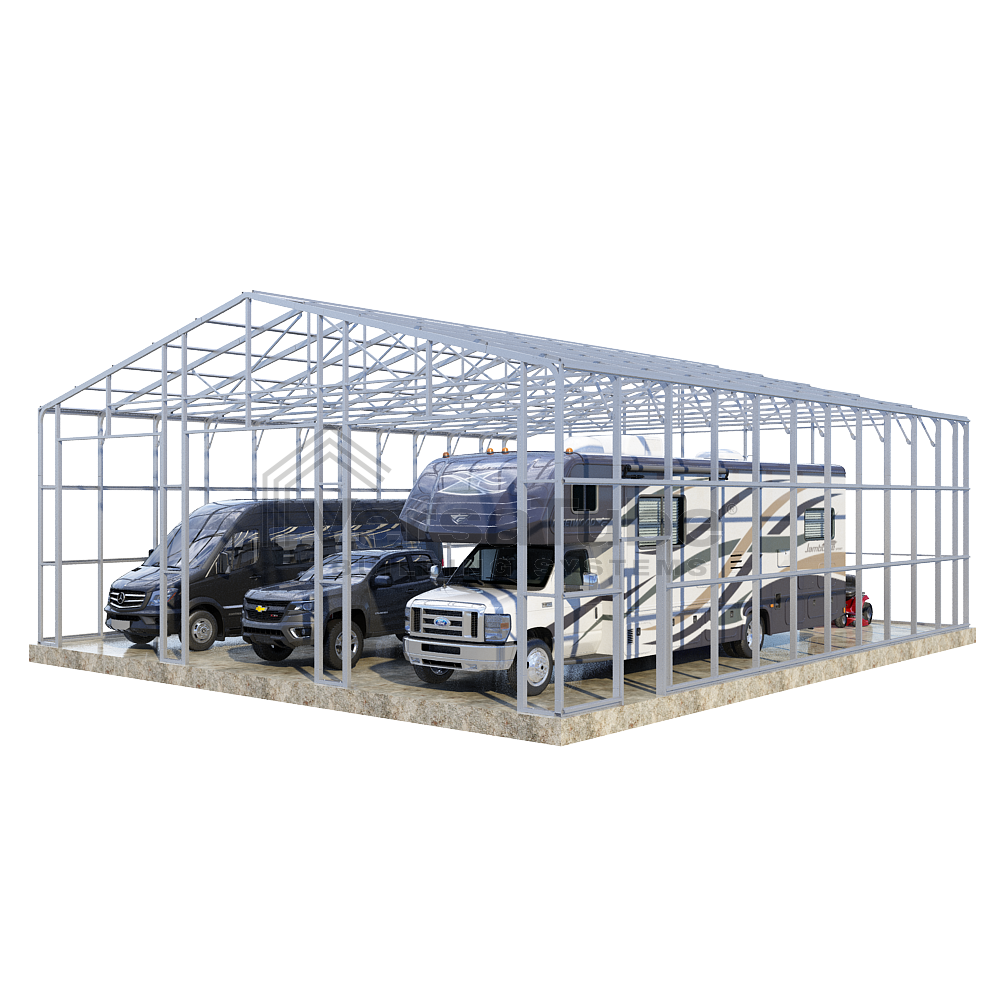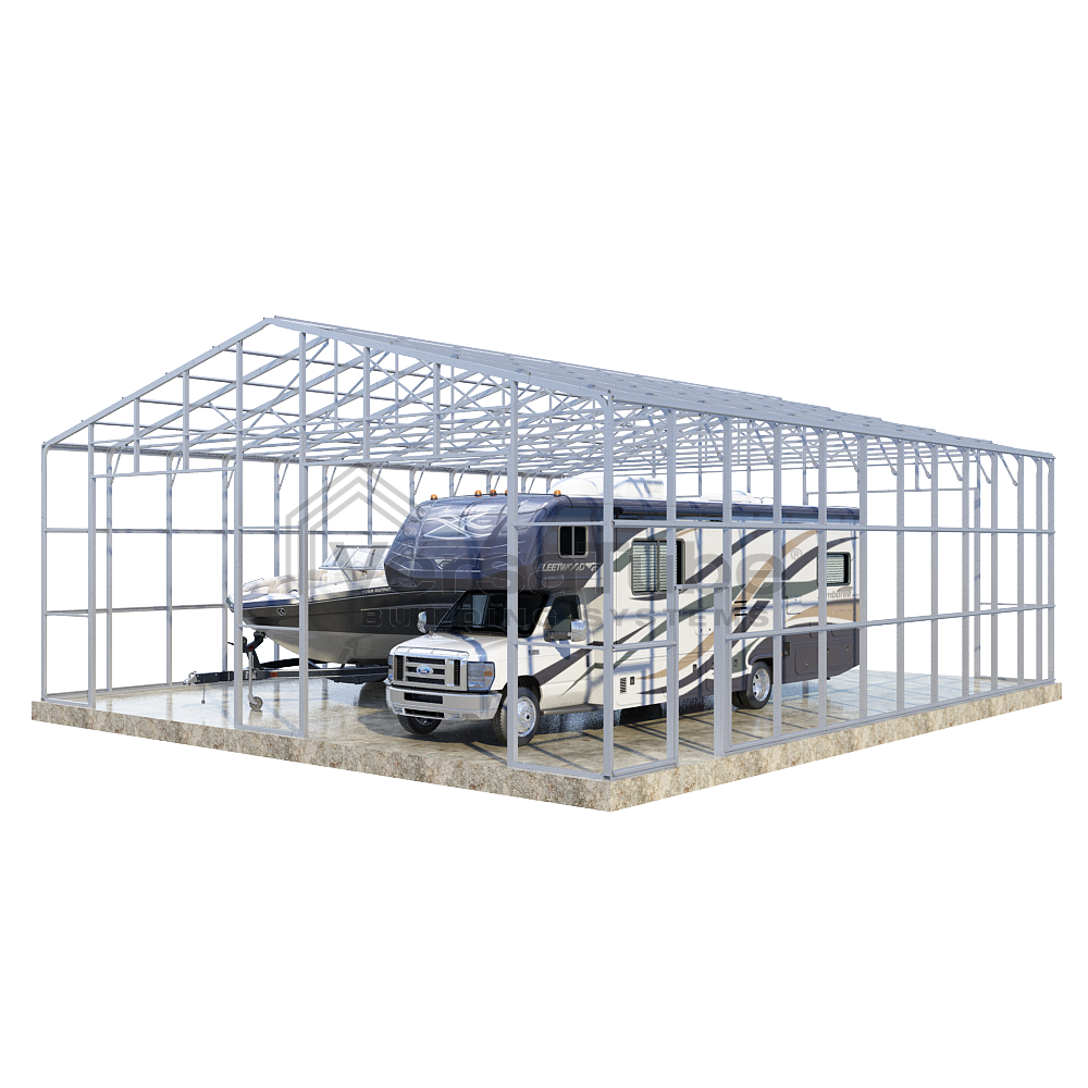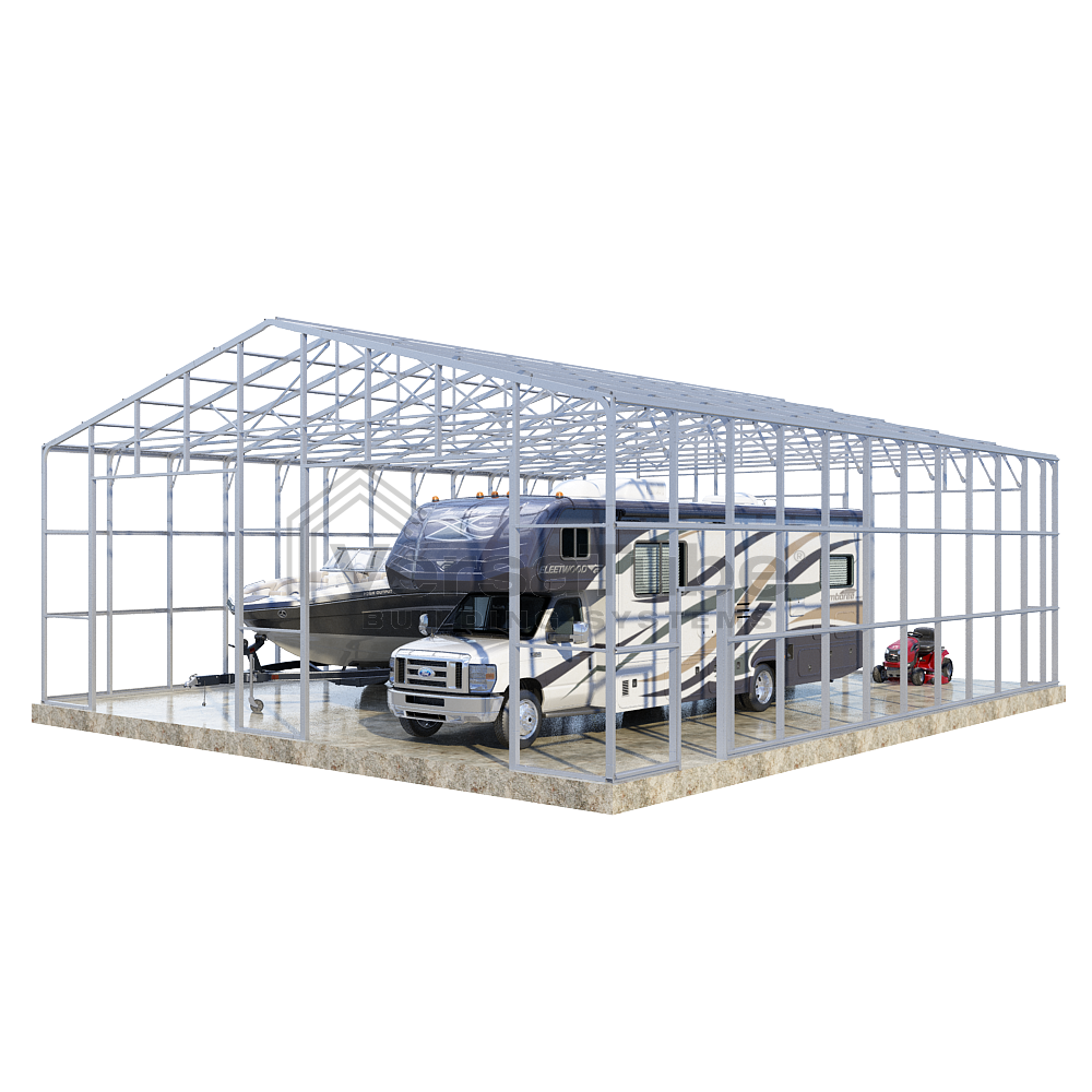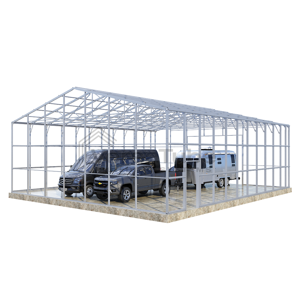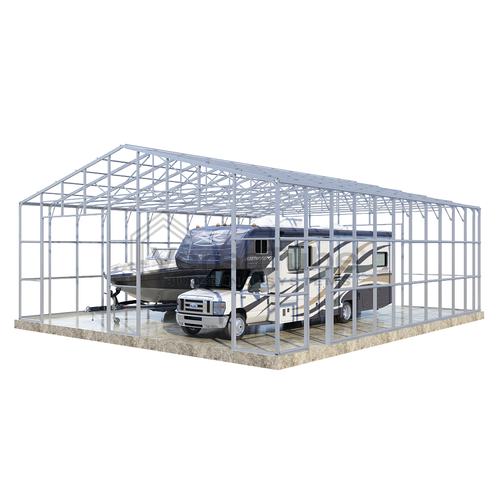 Summit Series DIY garage frame kit includes roof purlins and side girts for applying vertical sheet metal panels or other roofing or siding materials.