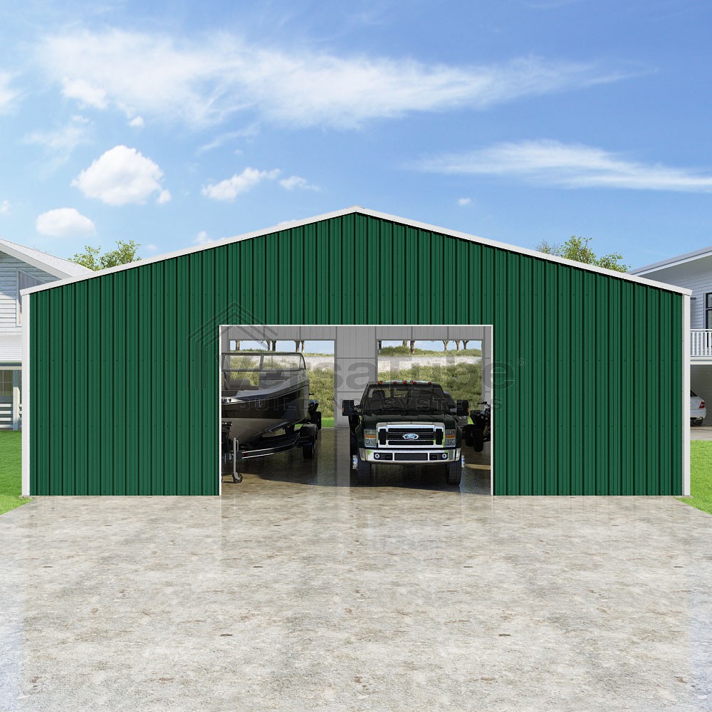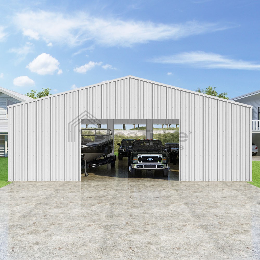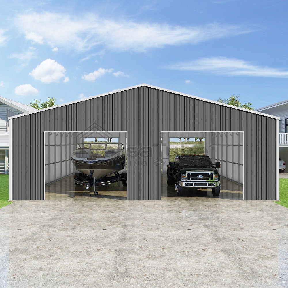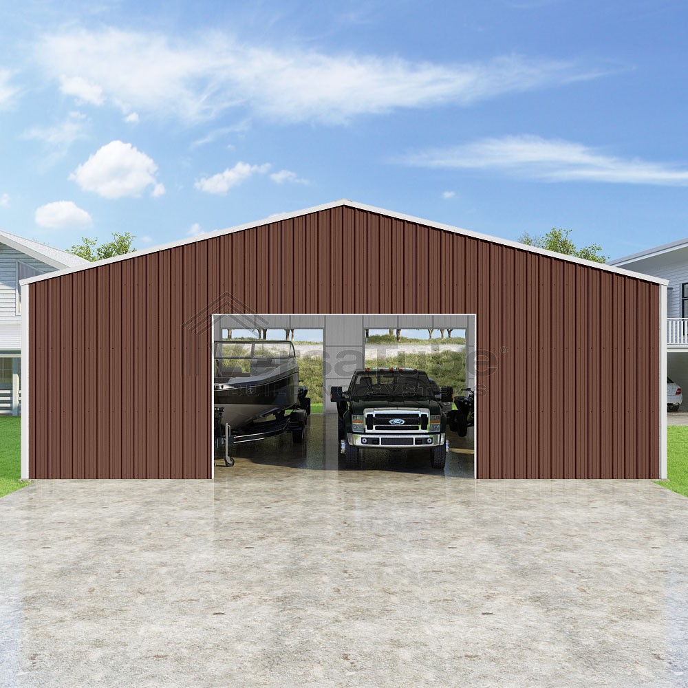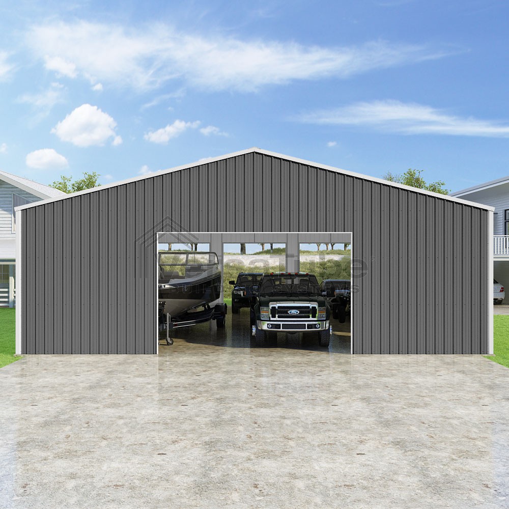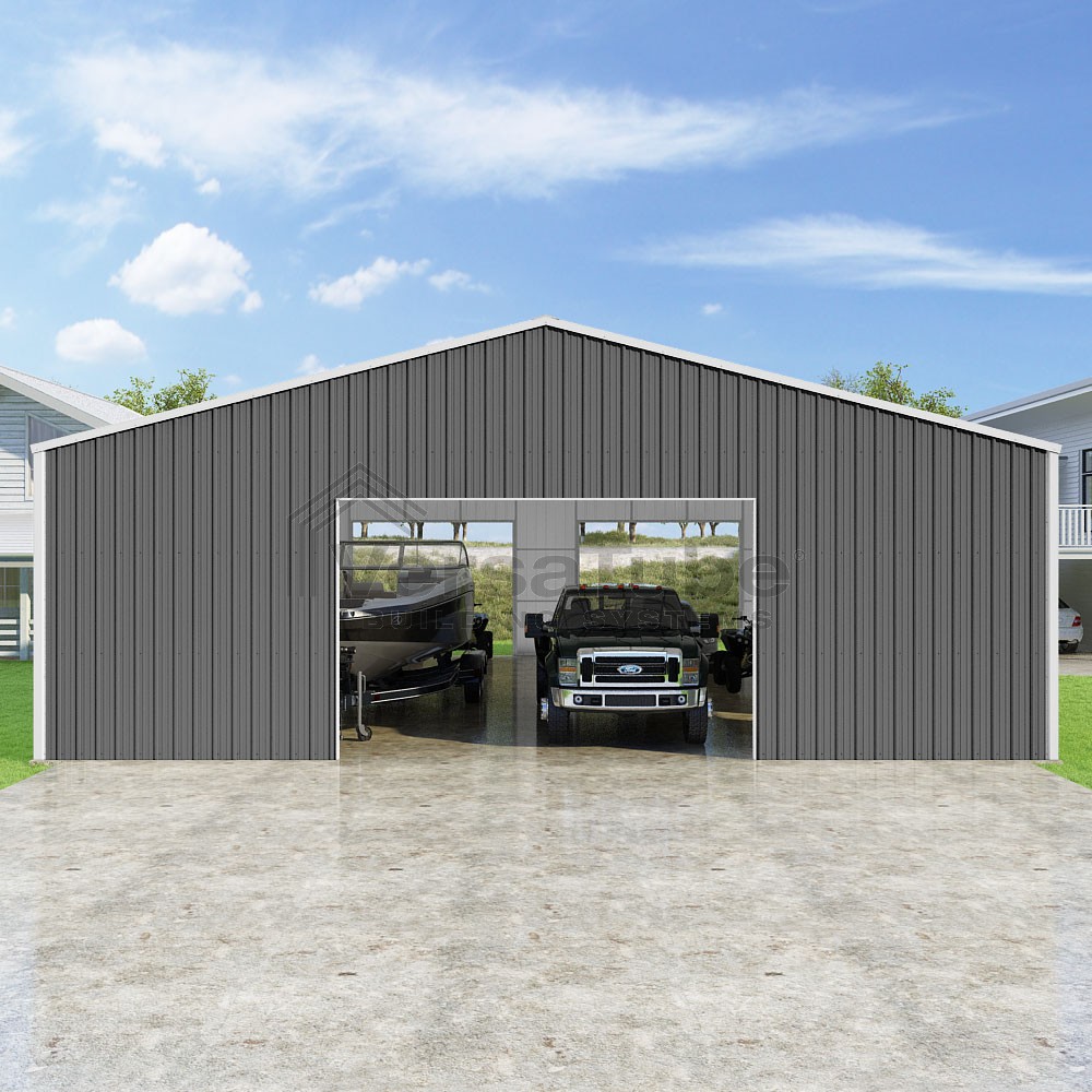 Summit Series DIY garage kit features vertical sheet metal roof and siding panels for a consistent look.