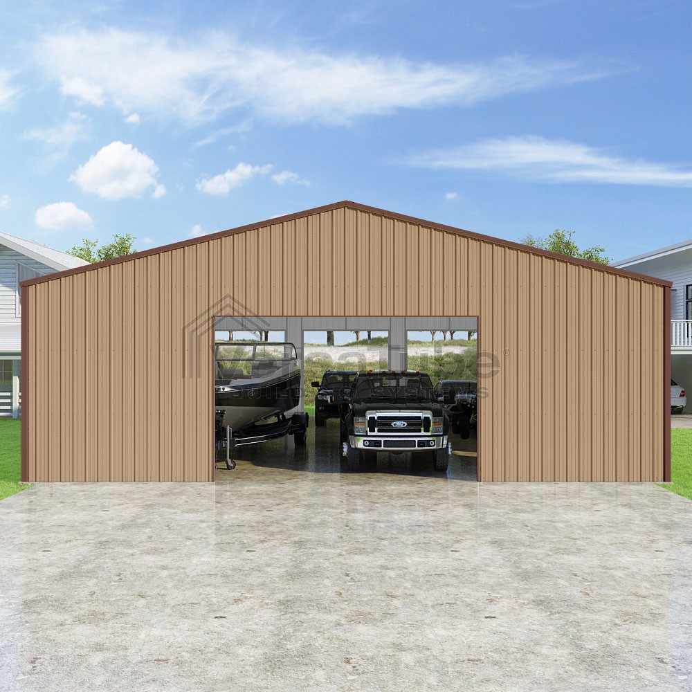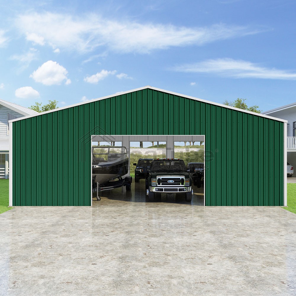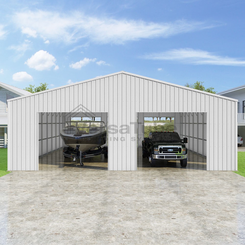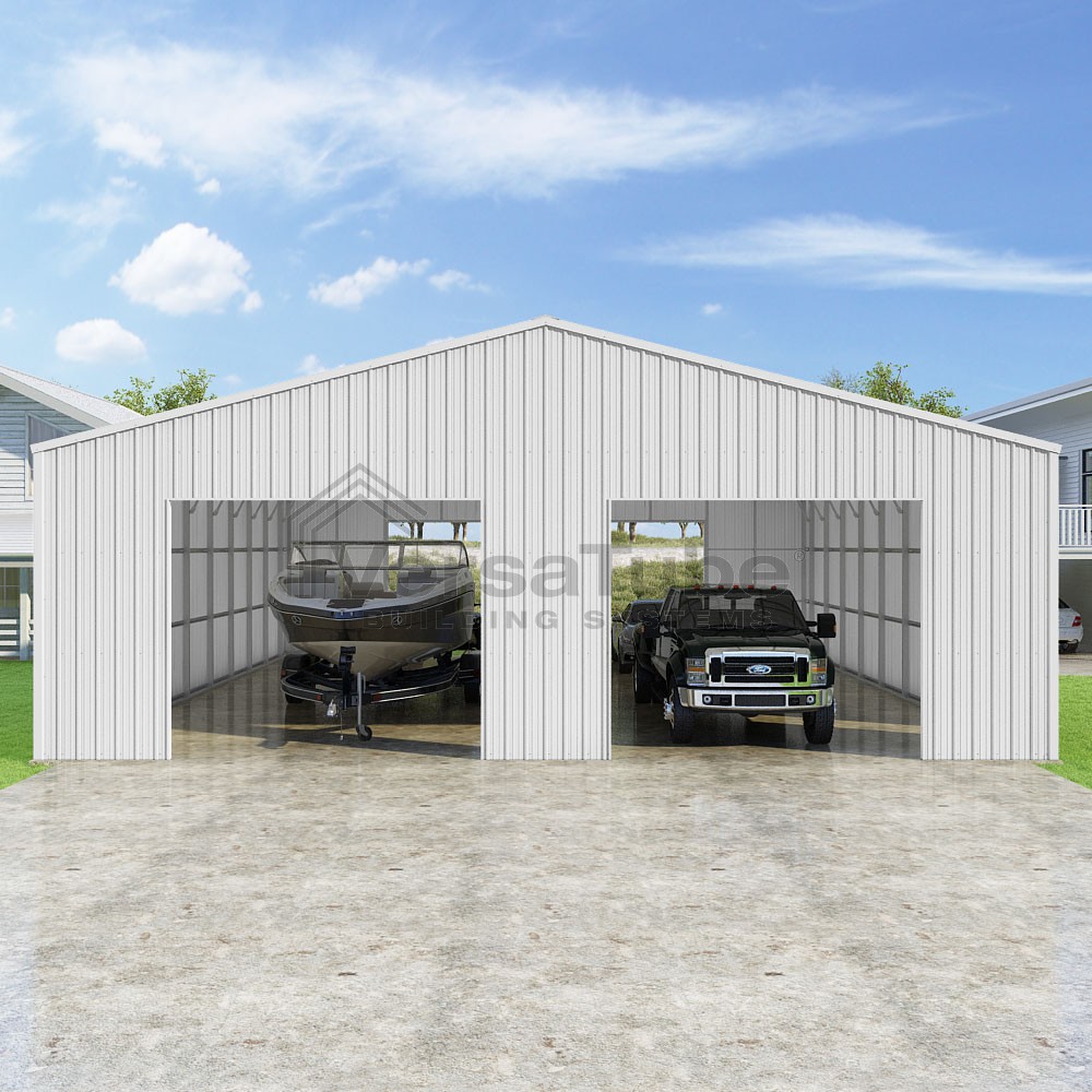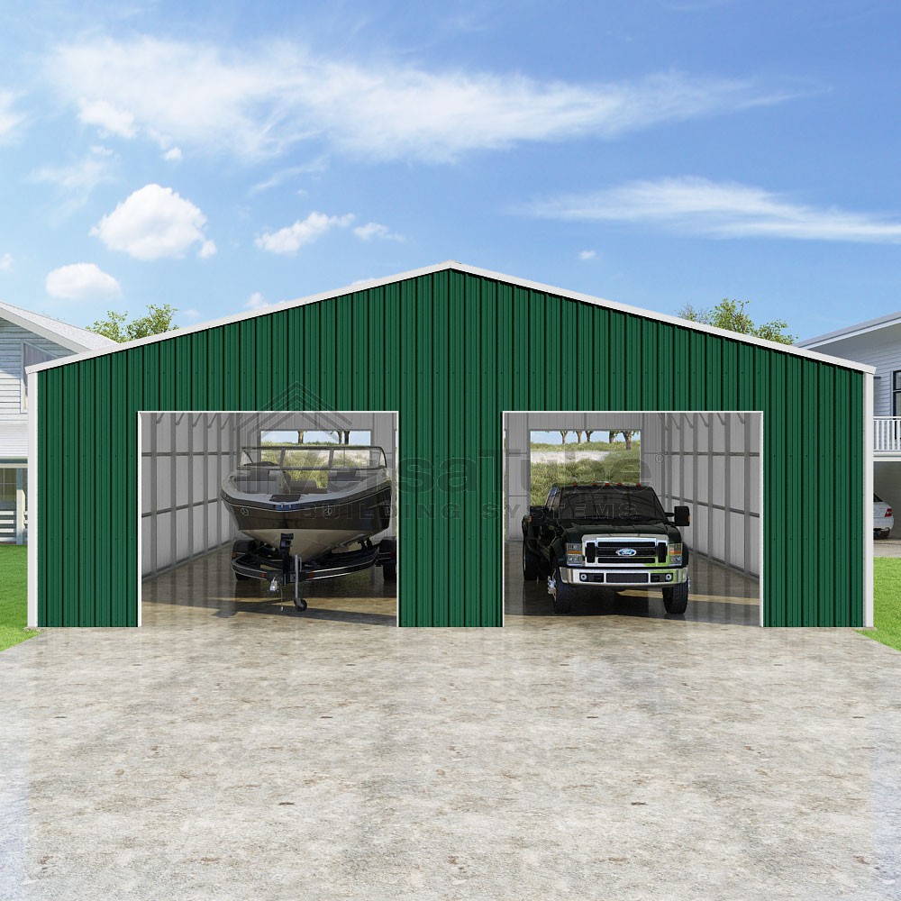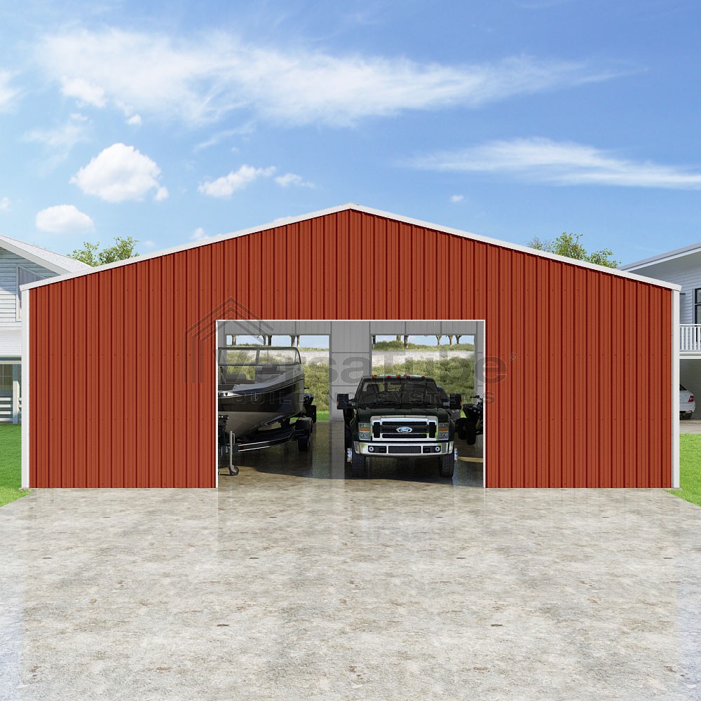 Summit Series DIY garage kit features vertical sheet metal roof and siding panels for a consistent look.