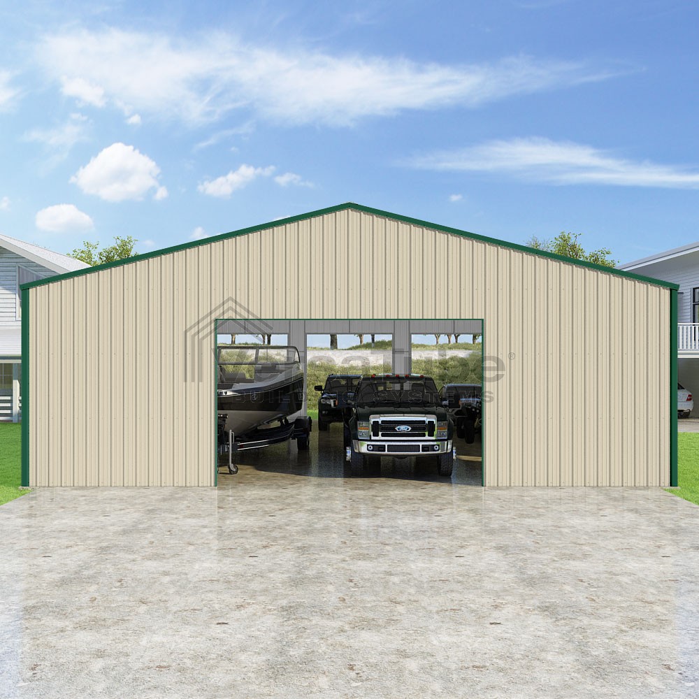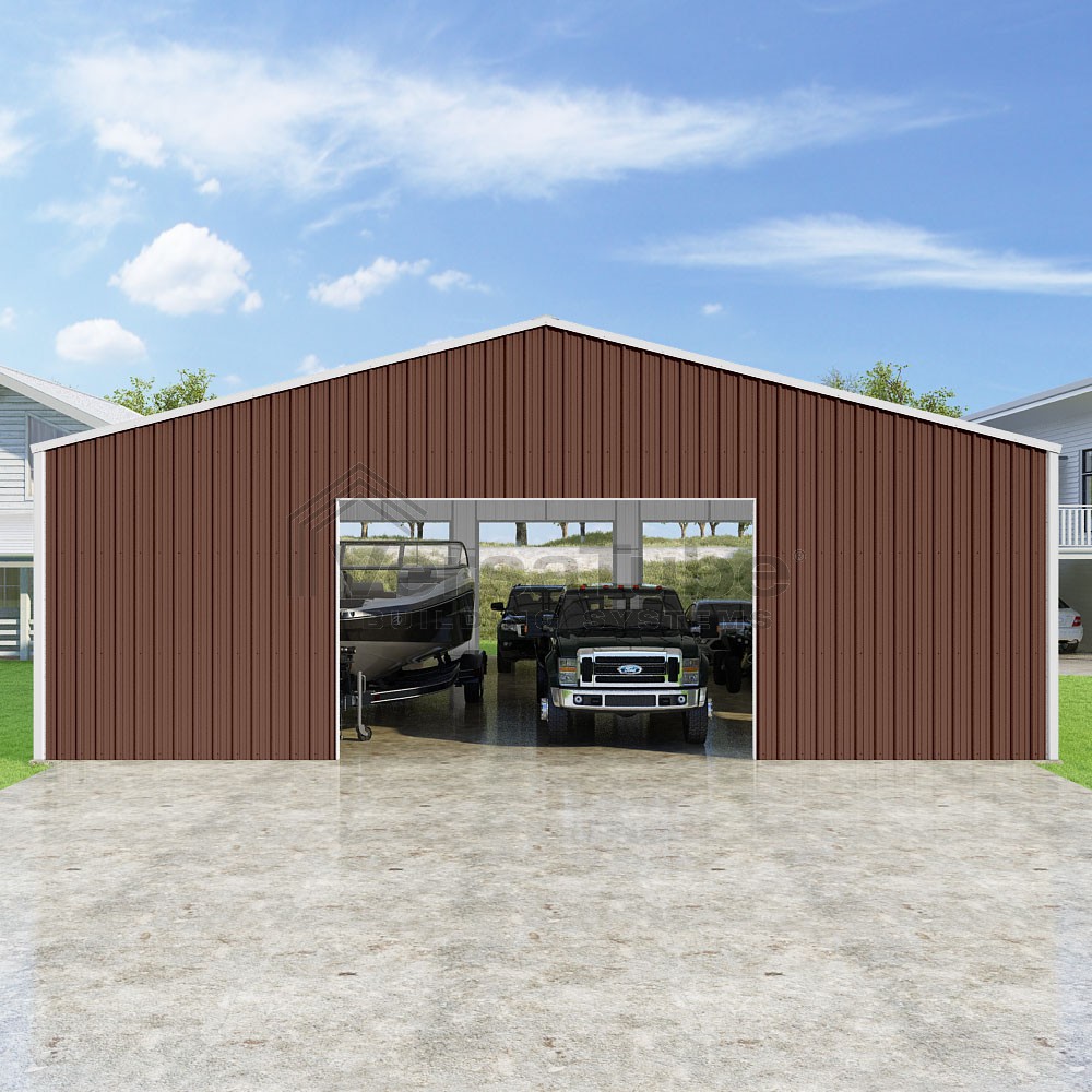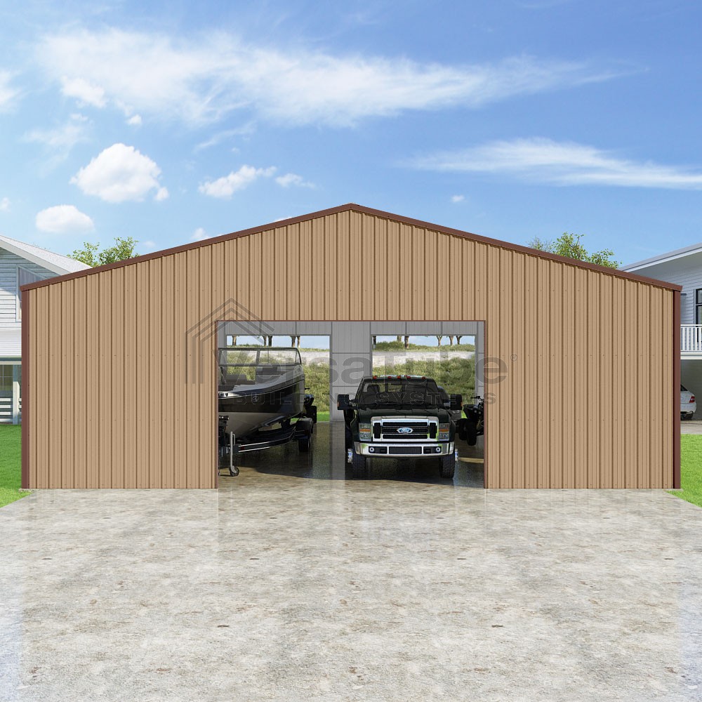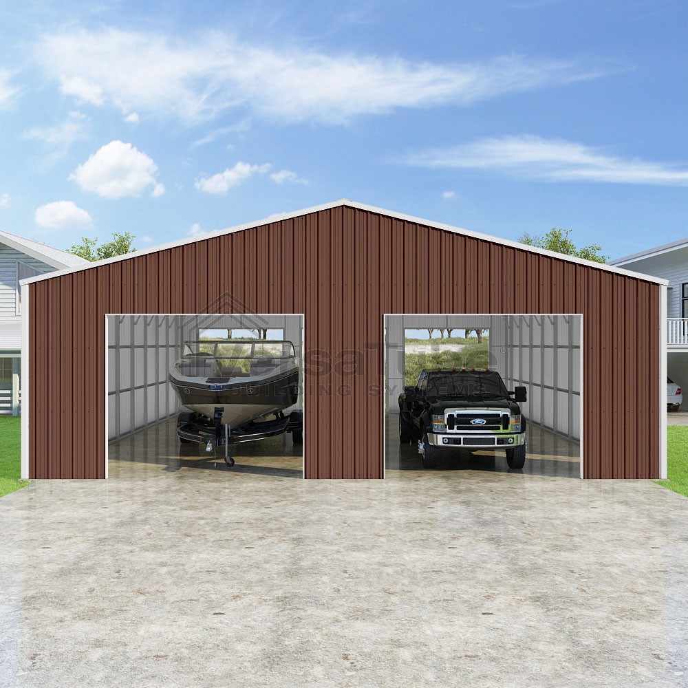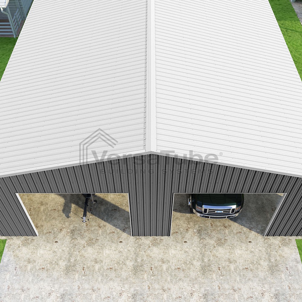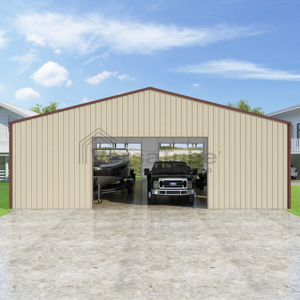 Summit Series DIY garage kit features vertical sheet metal roof and siding panels for a consistent look.