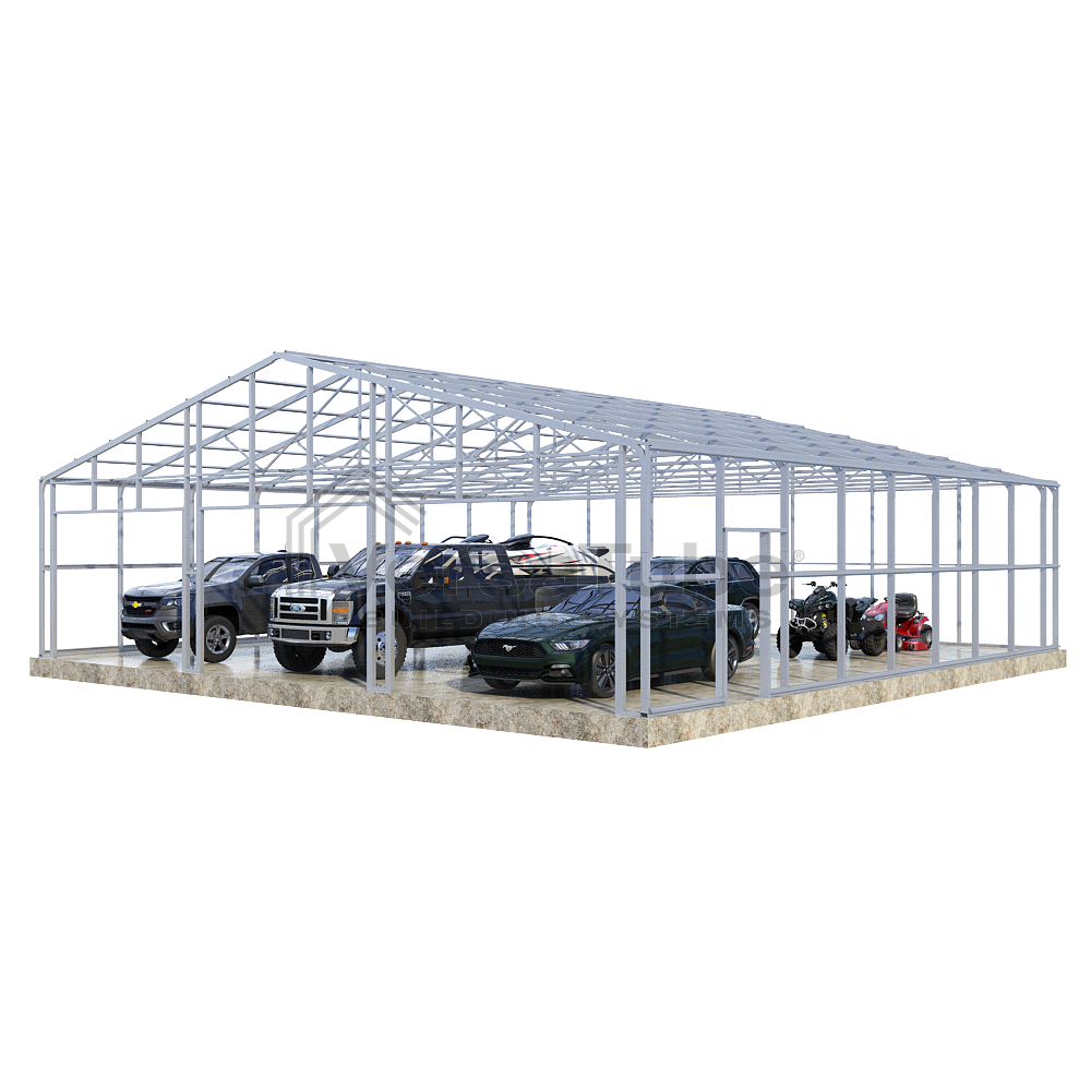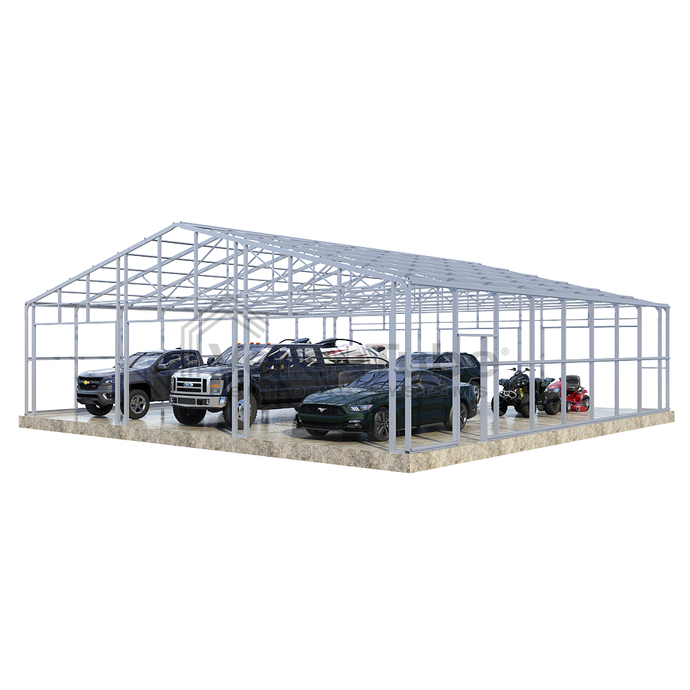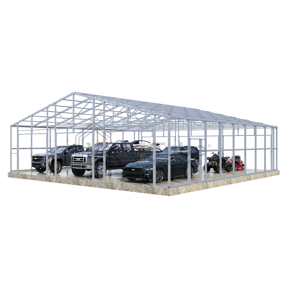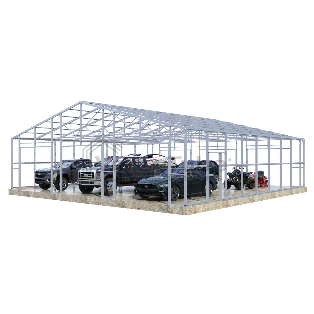 Summit Series DIY garage frame kit includes roof purlins and side girts for applying vertical sheet metal panels or other roofing or siding materials.