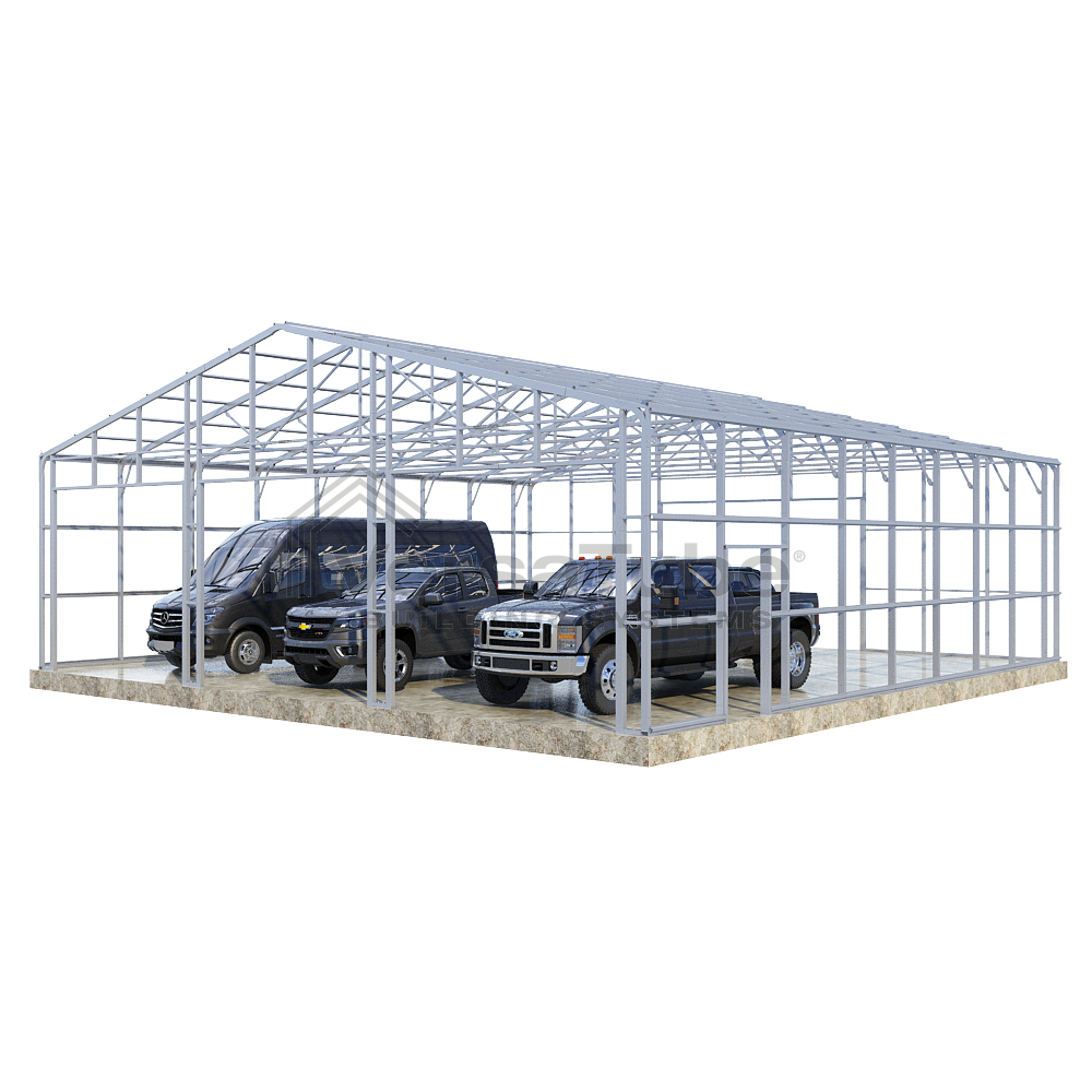 Summit Series DIY garage frame kit includes roof purlins and side girts for applying vertical sheet metal panels or other roofing or siding materials.