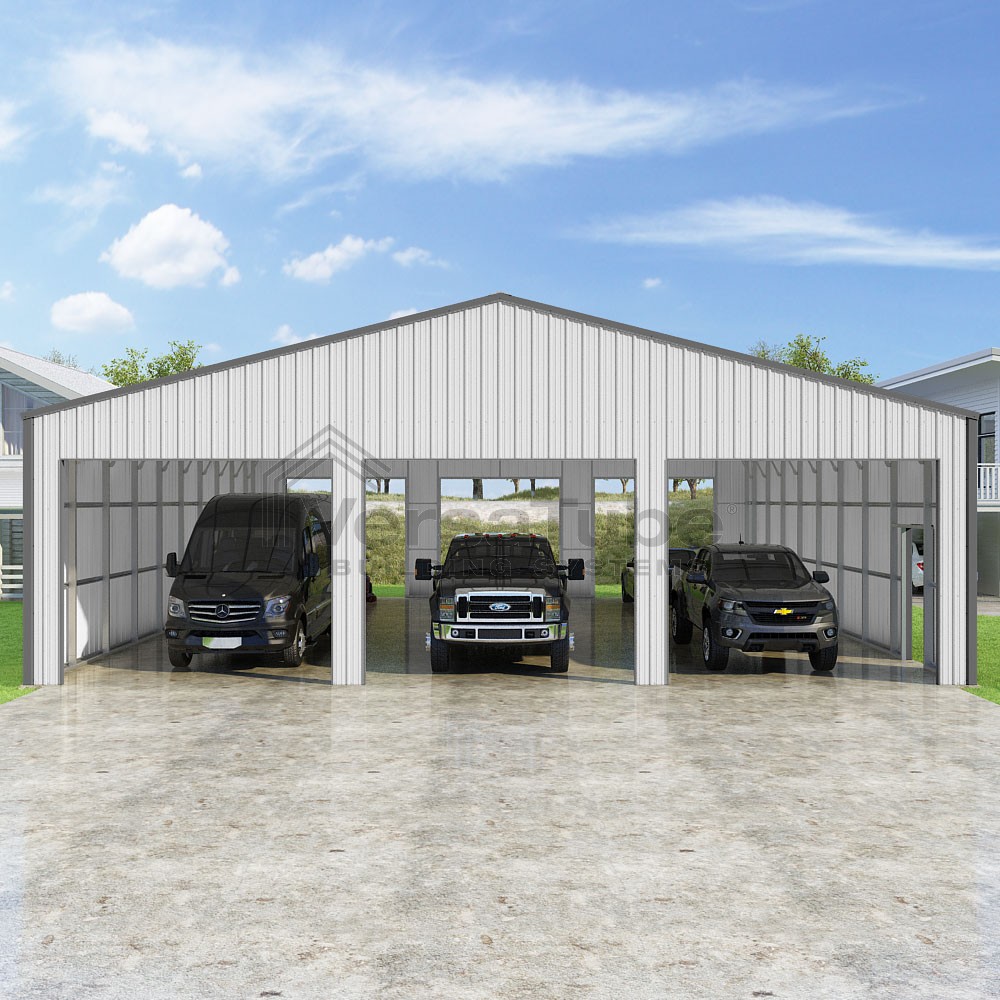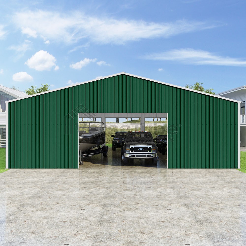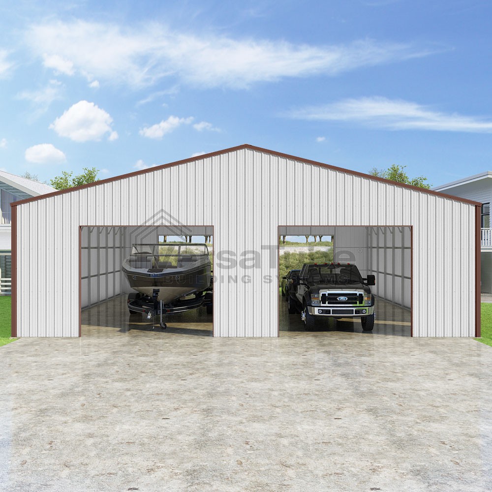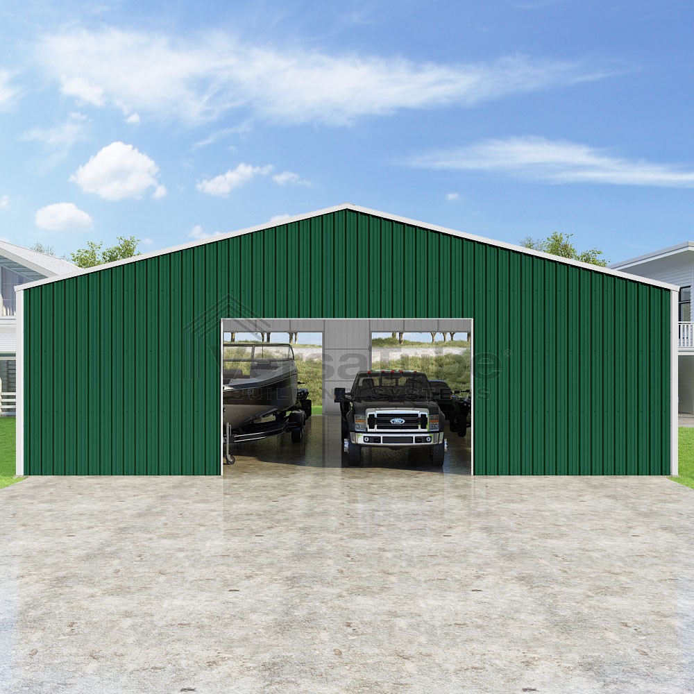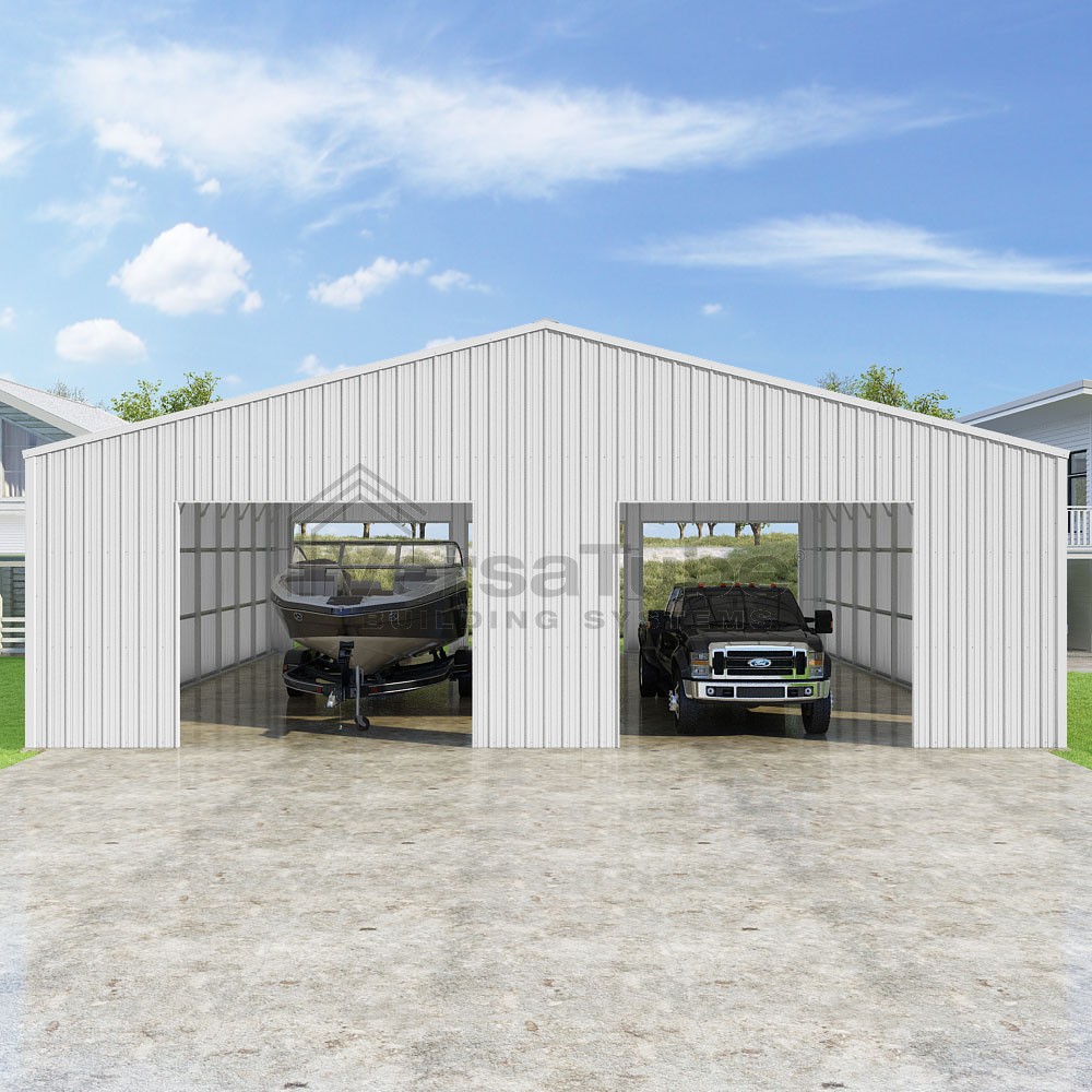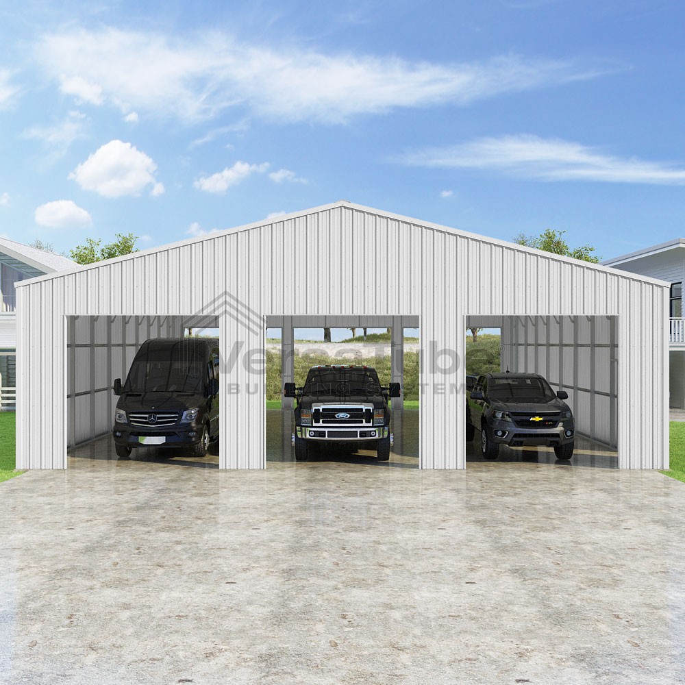 Summit Series DIY garage kit features vertical sheet metal roof and siding panels for a consistent look.