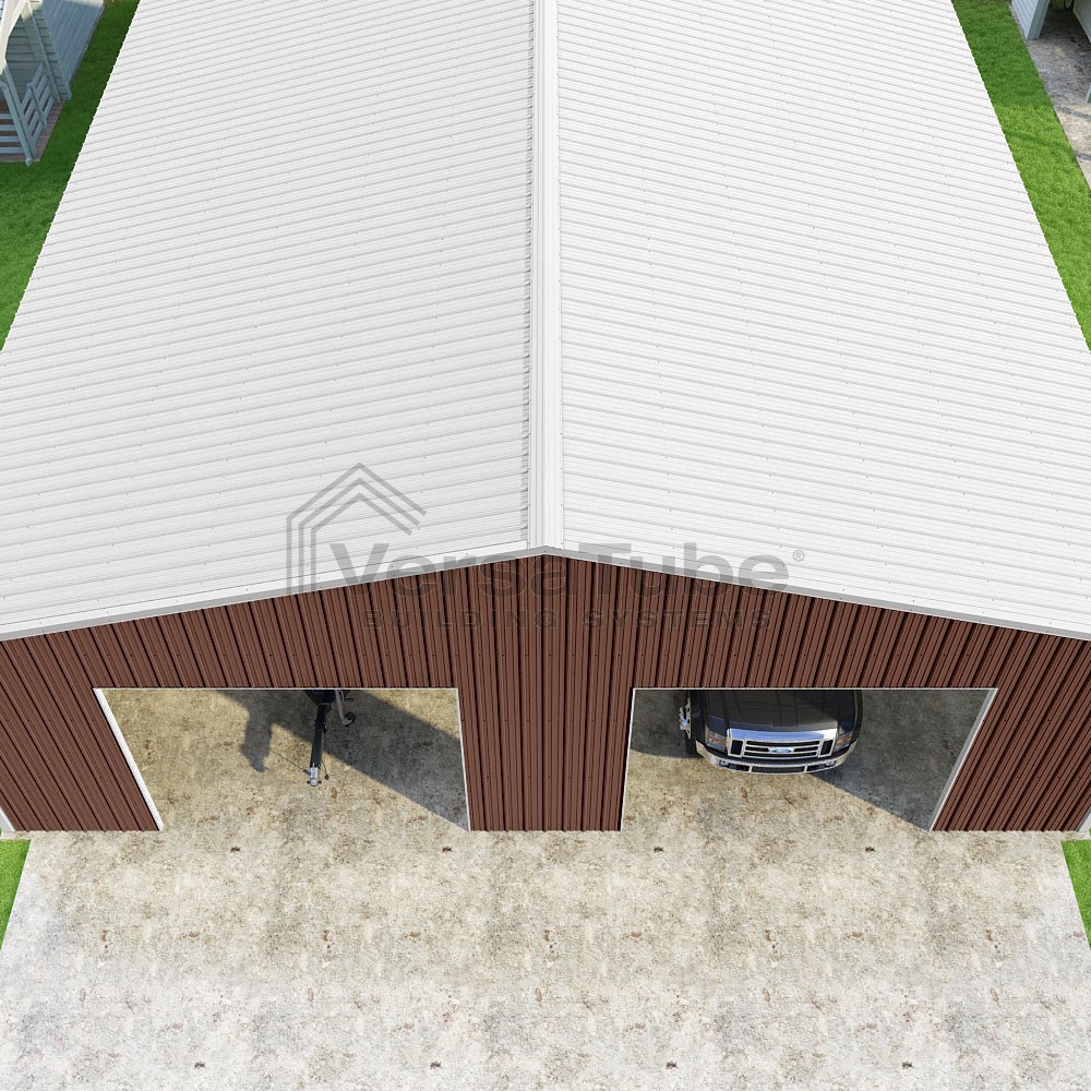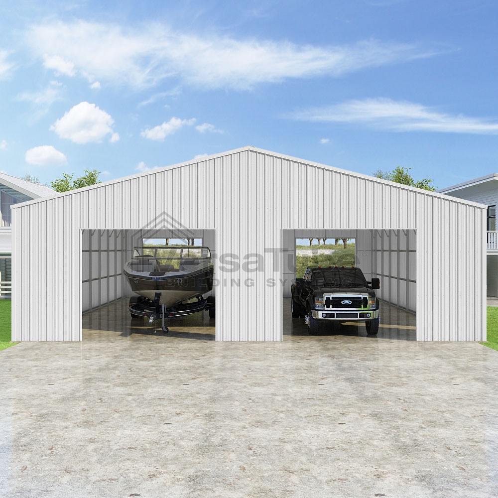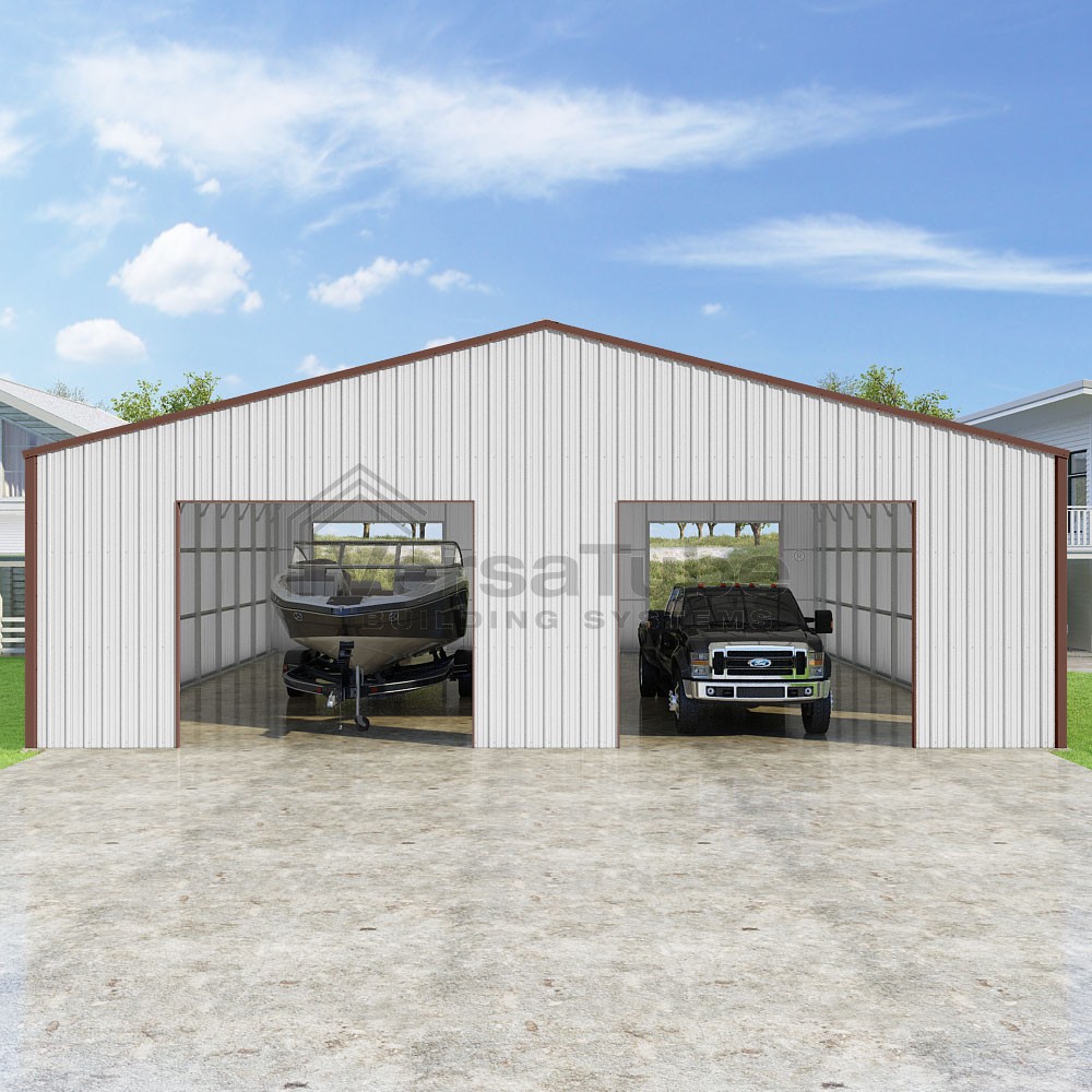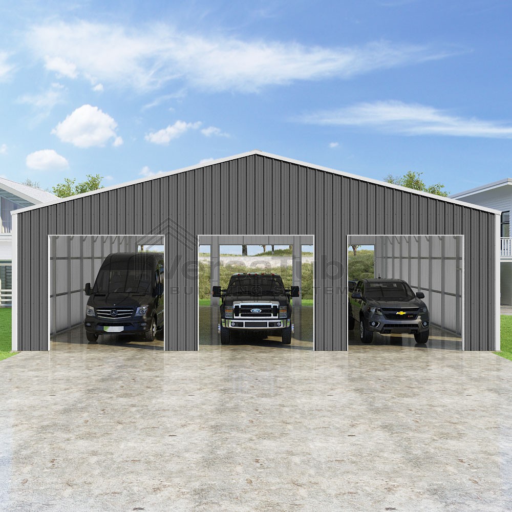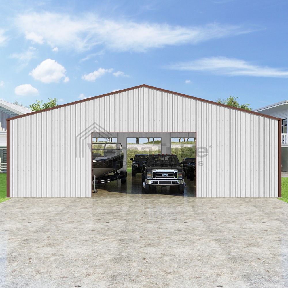 Summit Series DIY garage kit features vertical sheet metal roof and siding panels for a consistent look.
