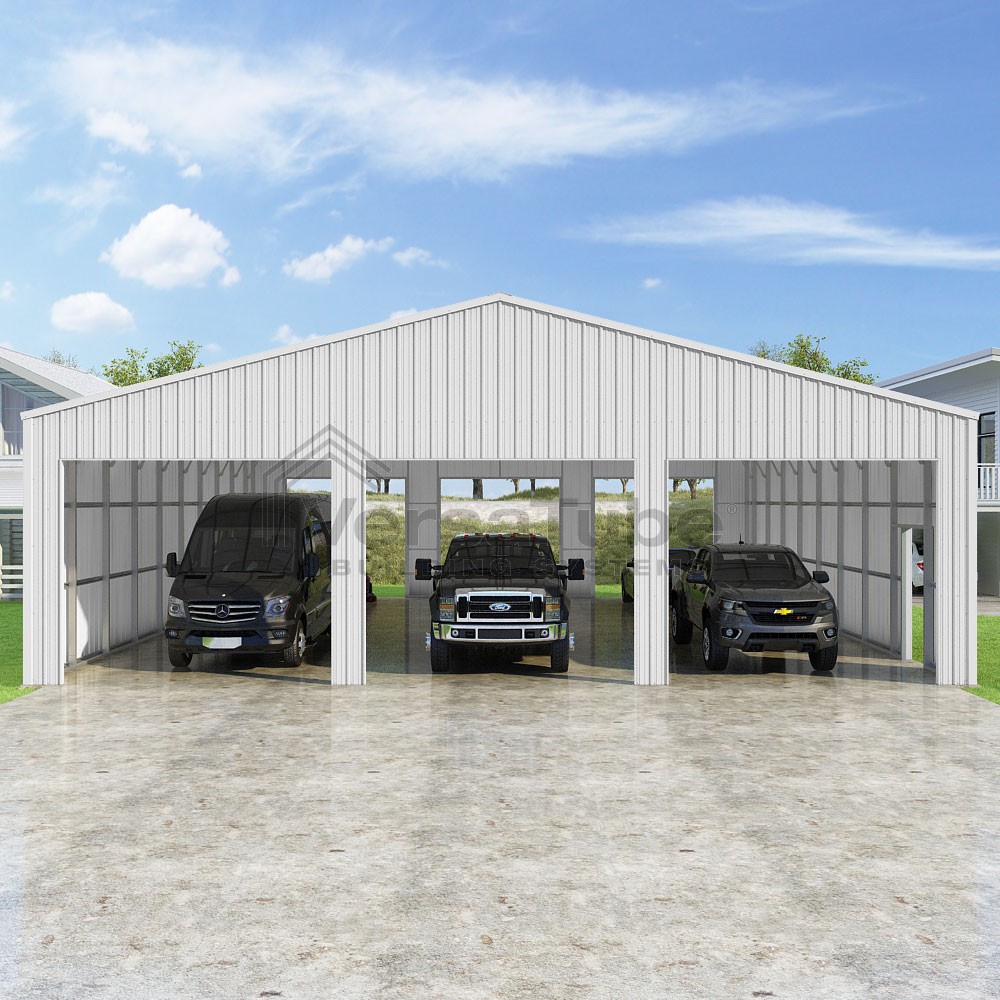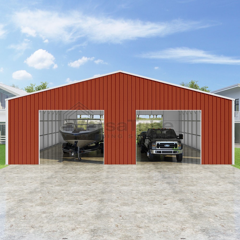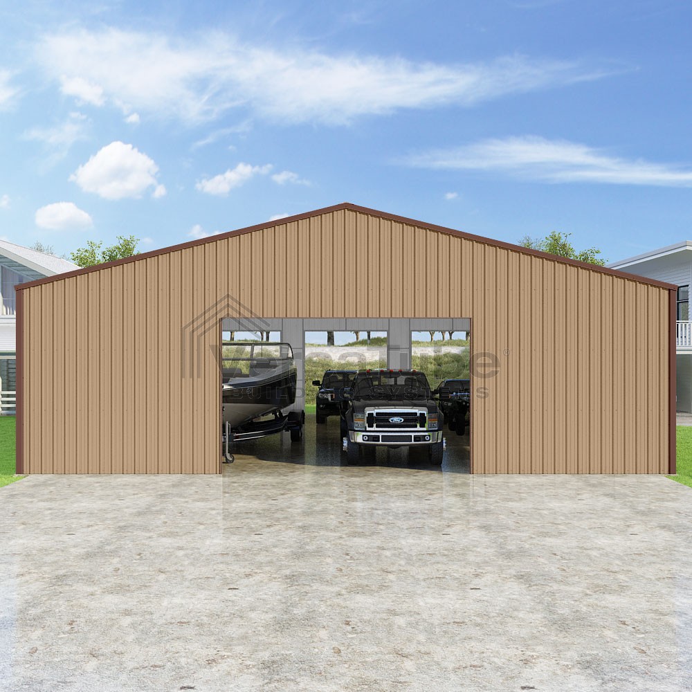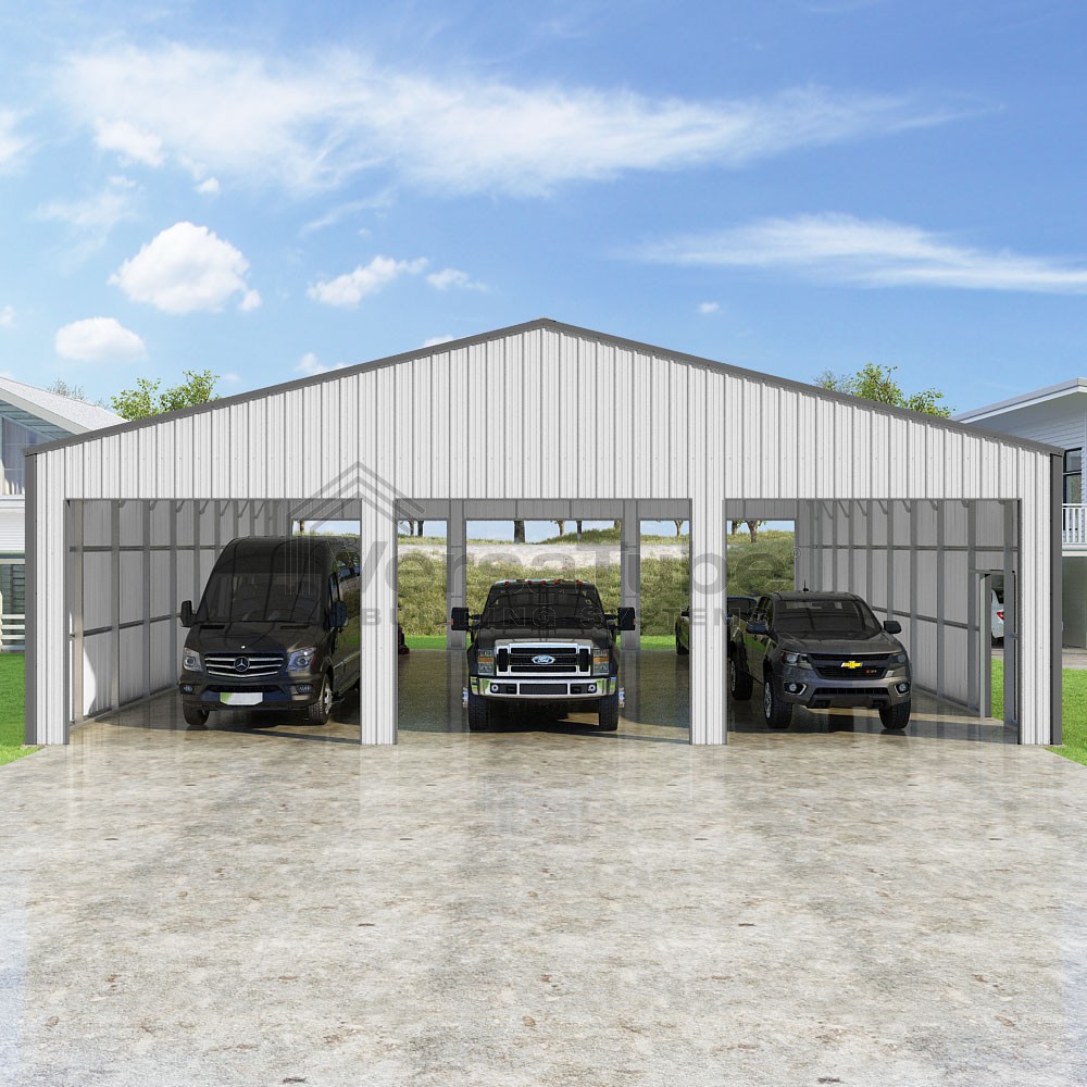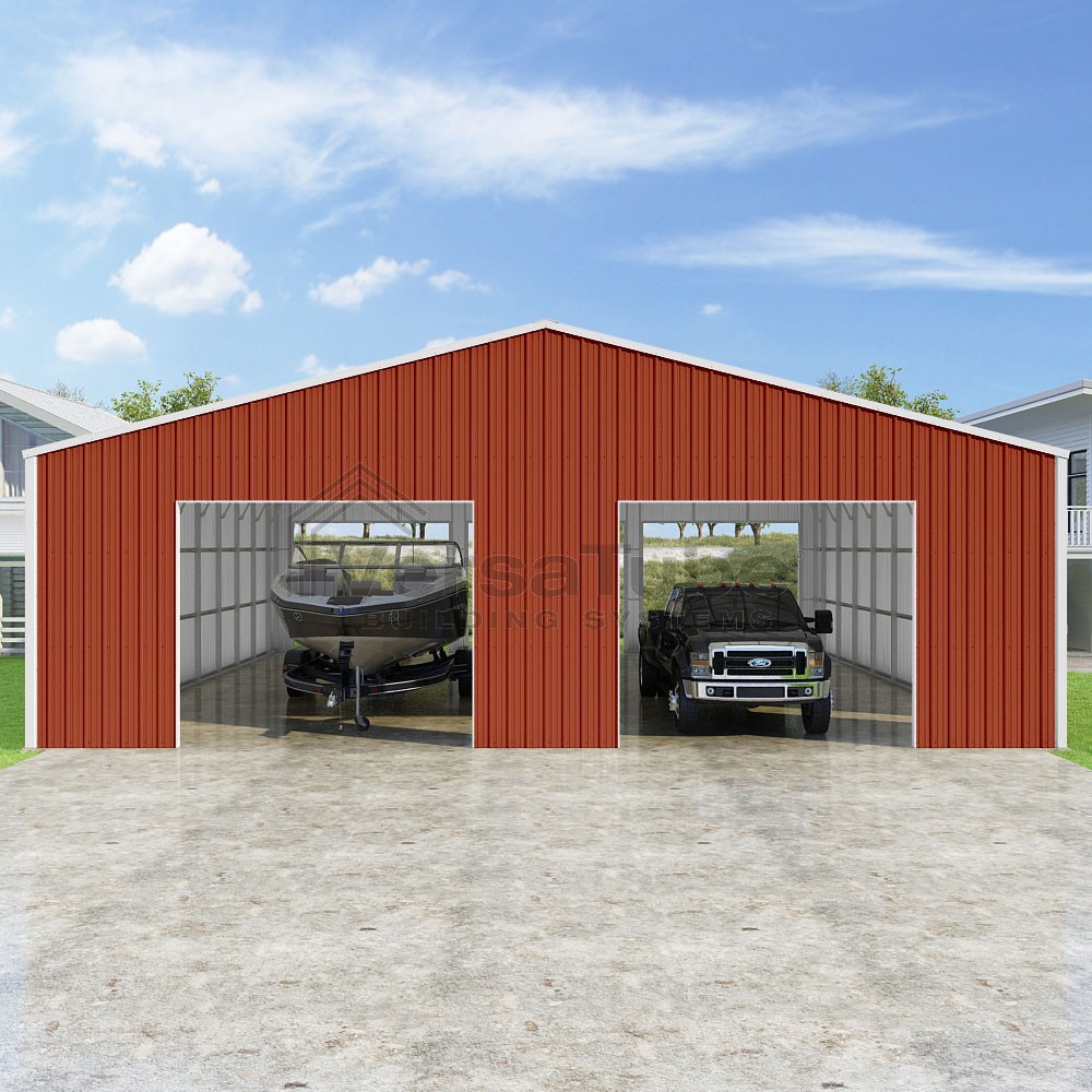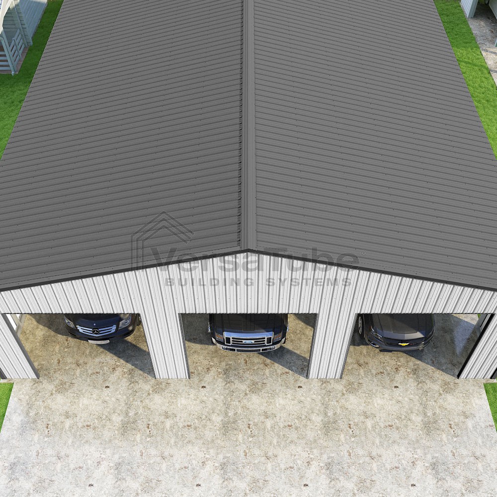 Summit Series DIY garage kit features vertical sheet metal roof and siding panels for a consistent look.