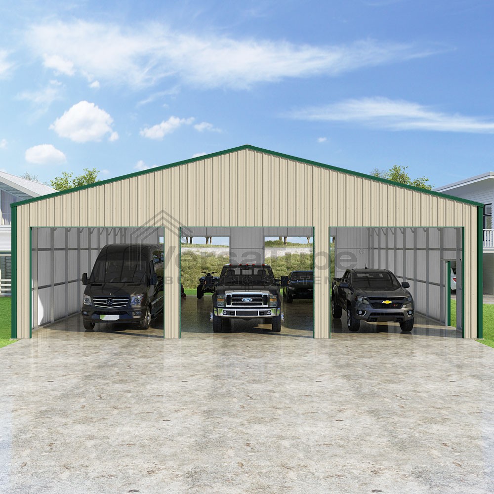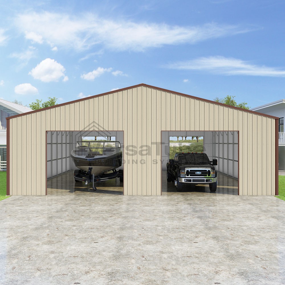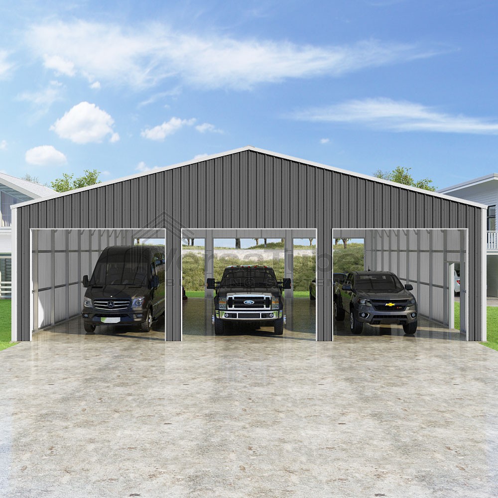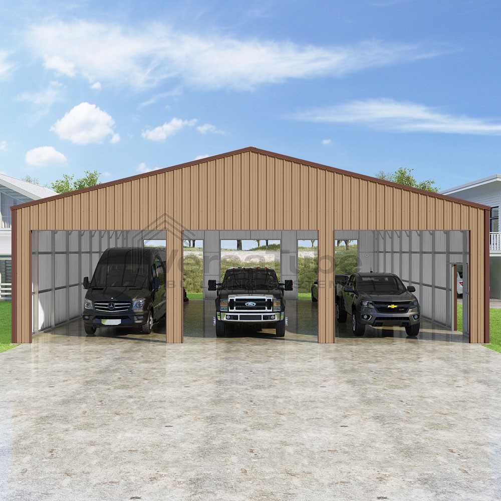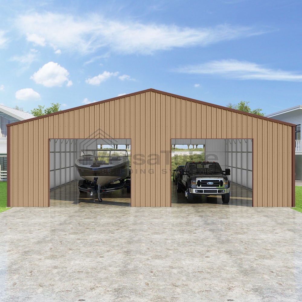 Summit Series DIY garage kit features vertical sheet metal roof and siding panels for a consistent look.