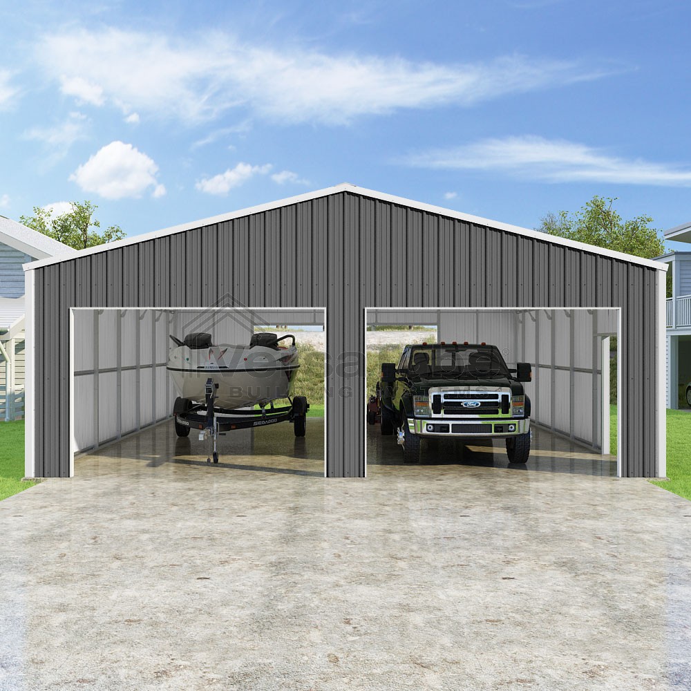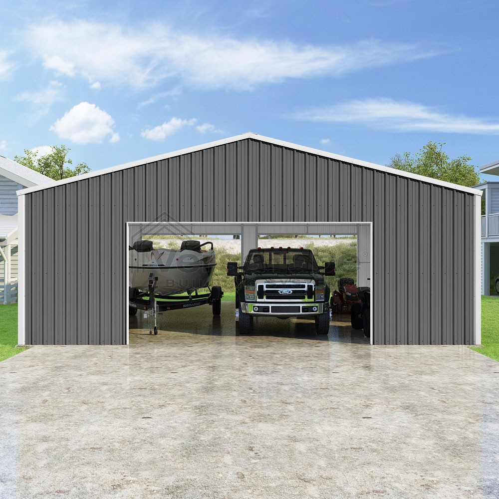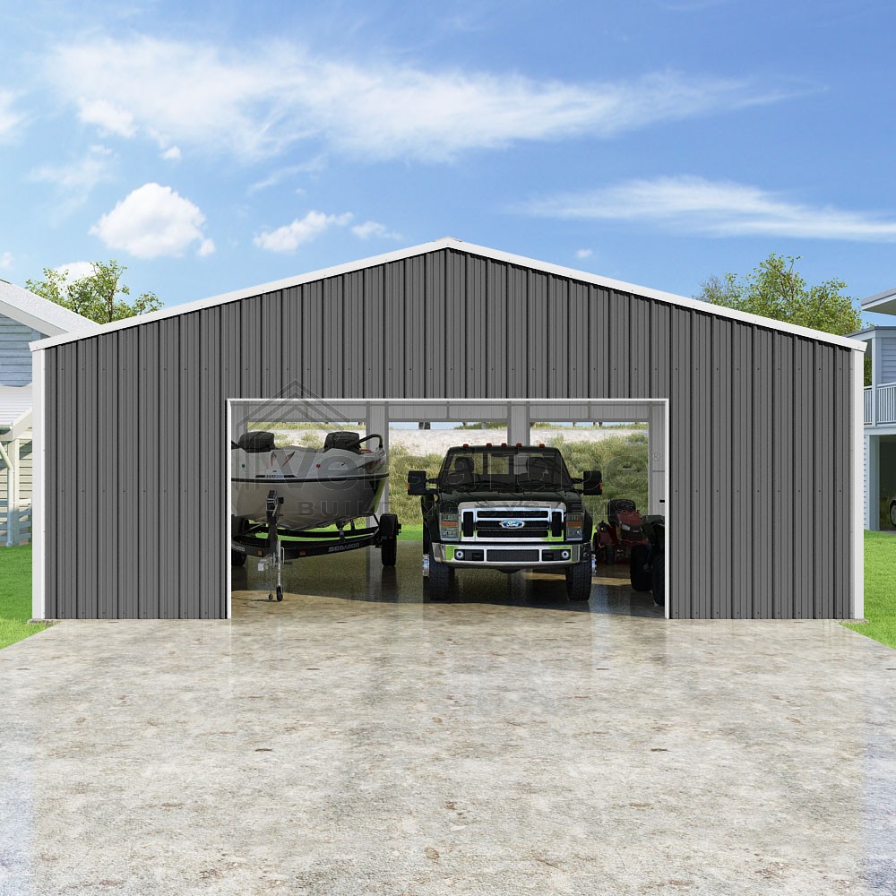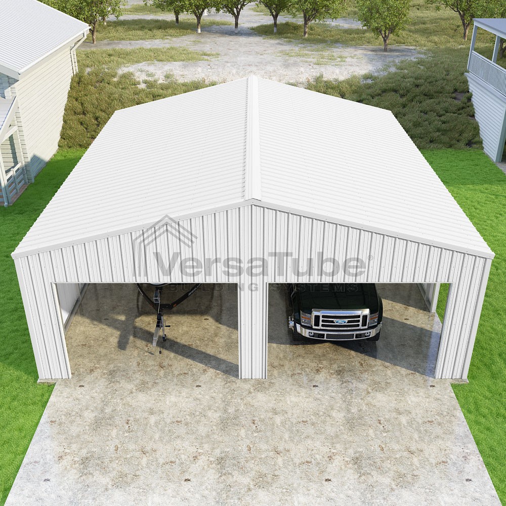 Summit Series DIY garage kit features vertical sheet metal roof and siding panels for a consistent look.